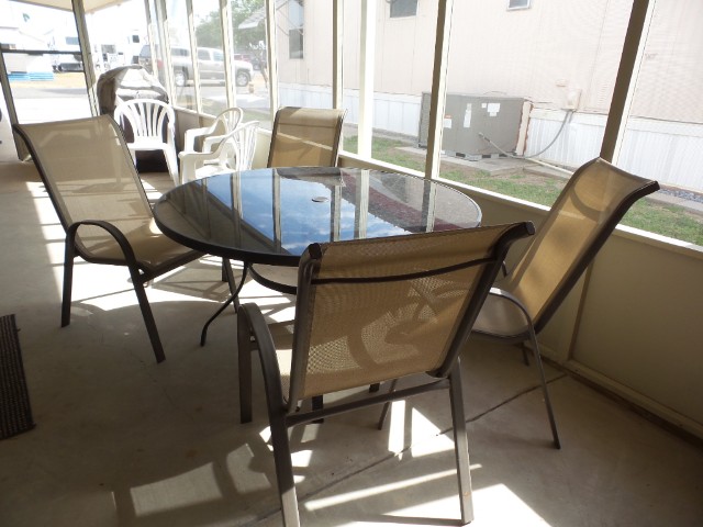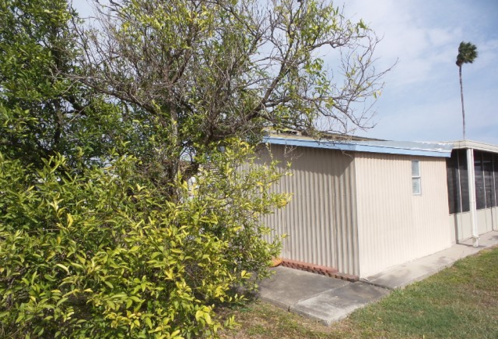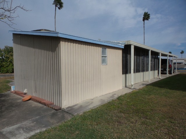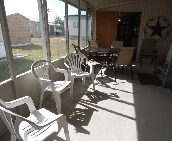Academy Mini Mobile 2-bedroom, 1 bathroom customized Manufactured home with XL screen porch, perfect for entertaining & a workshop many would enjoy! Location is key & the extensive carport & patio, outside areas are lovely to enjoy the mild TX weather. Up a few steps is the front Livingroom with natural ambiance facing the E. A sofa sleeper & 2 chairs with the TV provides relaxation. The round wood dinette overlooks the patio & has a leaf. The kitchen has been fully renovated with oak cabinets, newer countertops & updated all electric appliances! Along the hallway is a coat closet & the guest room with a dresser & Q bed or office space. The washer & newer W/H are along the hallway. Adjacent to the M bedroom & back door is the bathroom which has been fully remodeled with a corner walk in shower, stool & new vanity. The Q master bedroom with dual closets & a dresser are at the back of the home. Exiting the back door is the screen porch with patio tables & seating for guests. A double door allows wide access as well. The dryer is presently located in the workshop. An orange tree in the backyard with lawn provides green space around the home for a nice yard. Please call for a tour appointment to see this home & tour an economical & friendly park, with numerous amenities- Rita @ 712-281-9862!