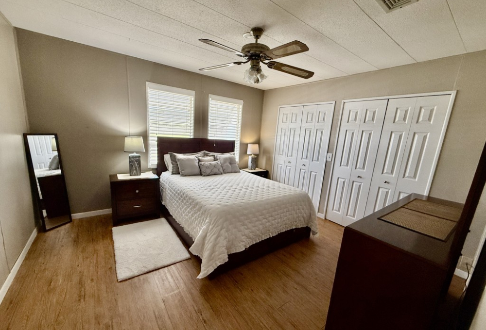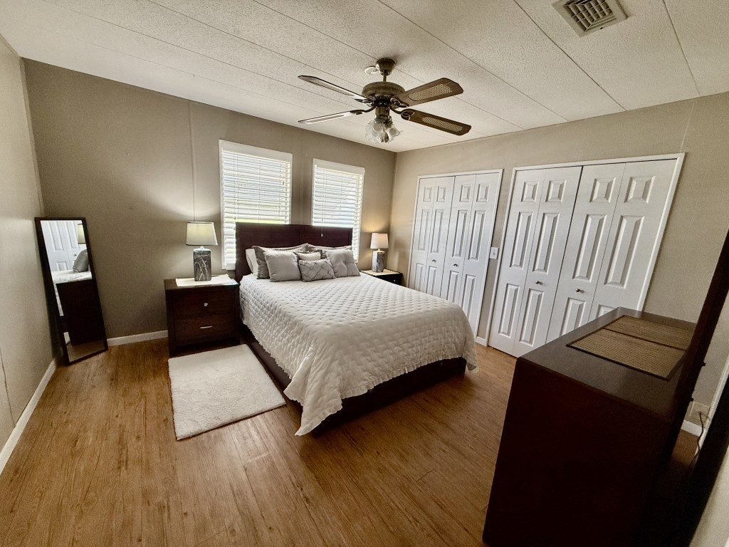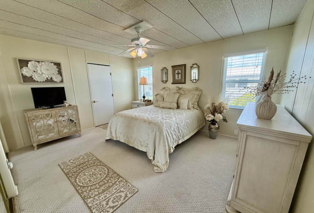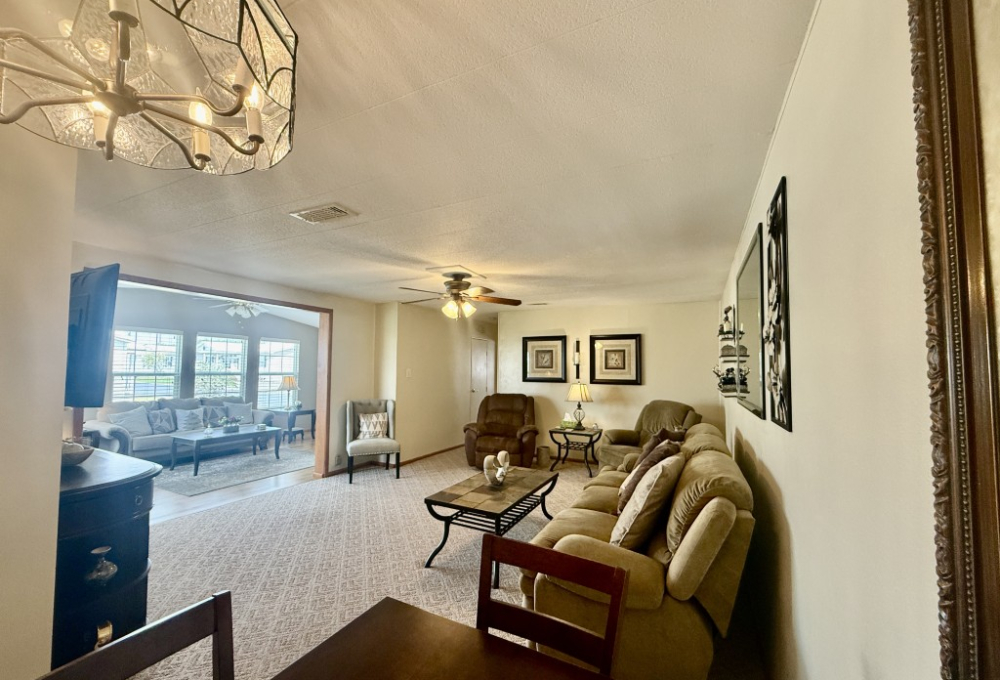 This exceptional property is competitively priced for a swift sale and located within the renowned Tropic Star 55+ community. Occupying an expansive corner lot—encompassing one and a half lots—the residence offers both enhanced privacy and additional outdoor space. The home measures 16 x 72 feet and features an elegant Nantucket-style Texas room, adding both charm and extra living area.