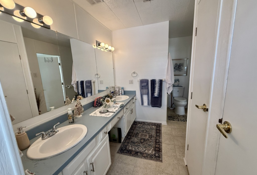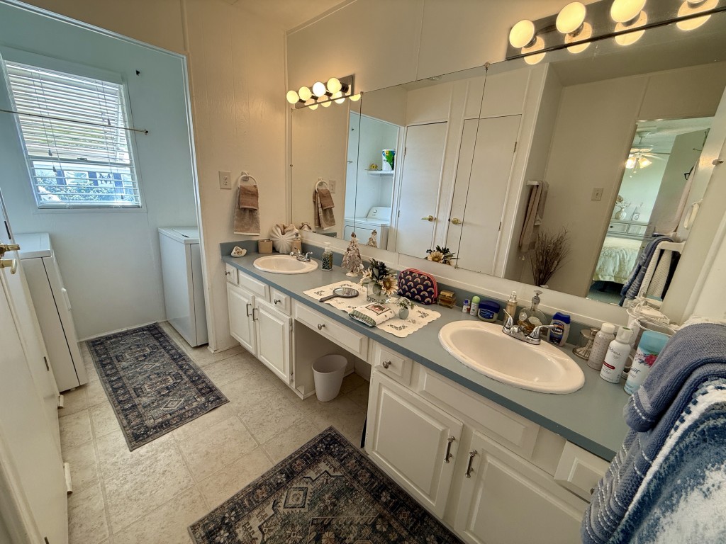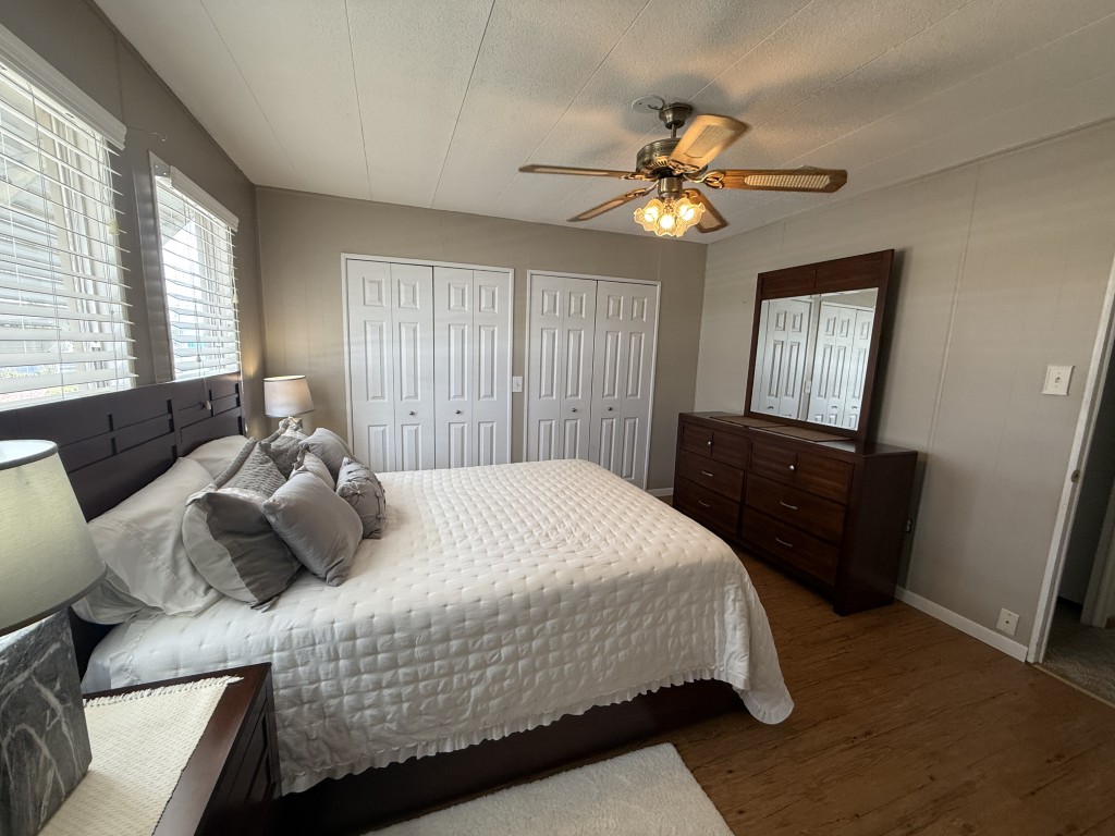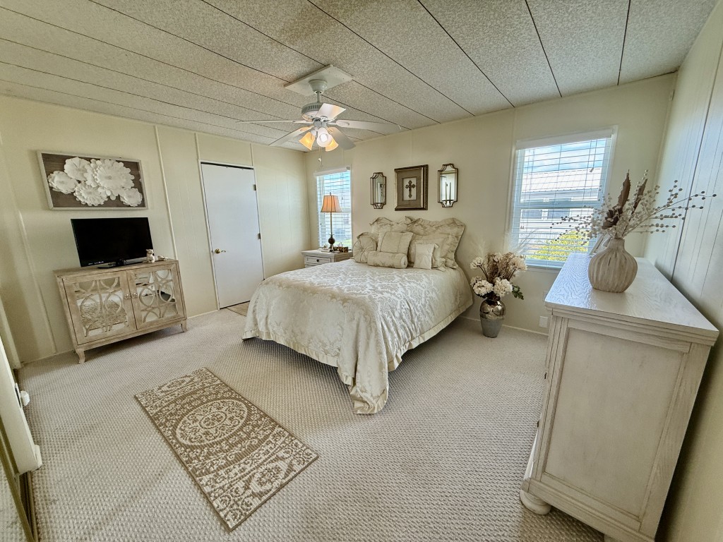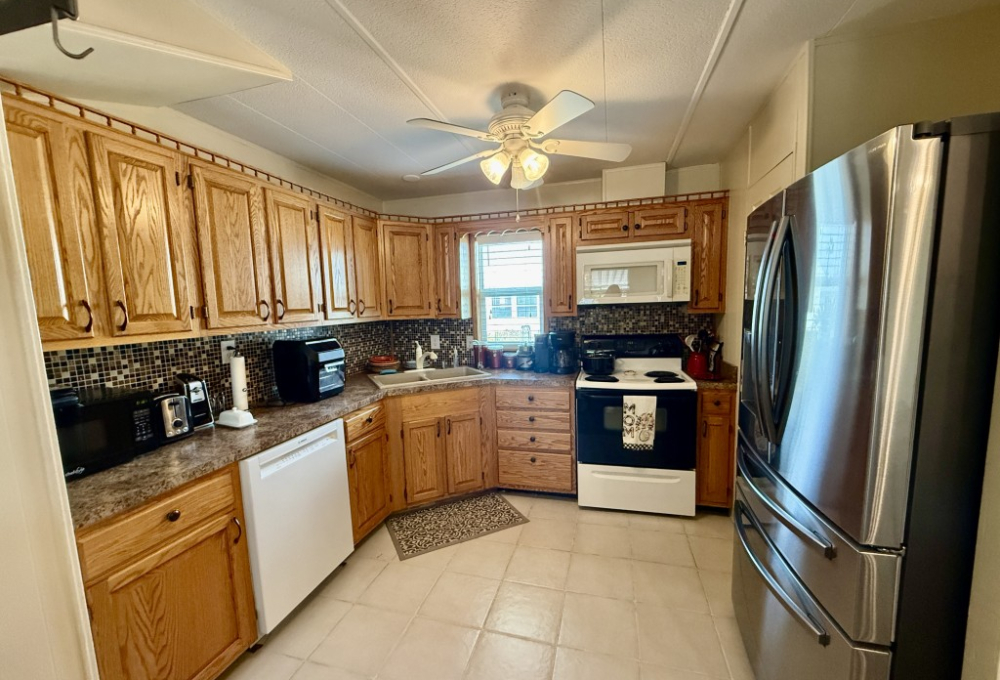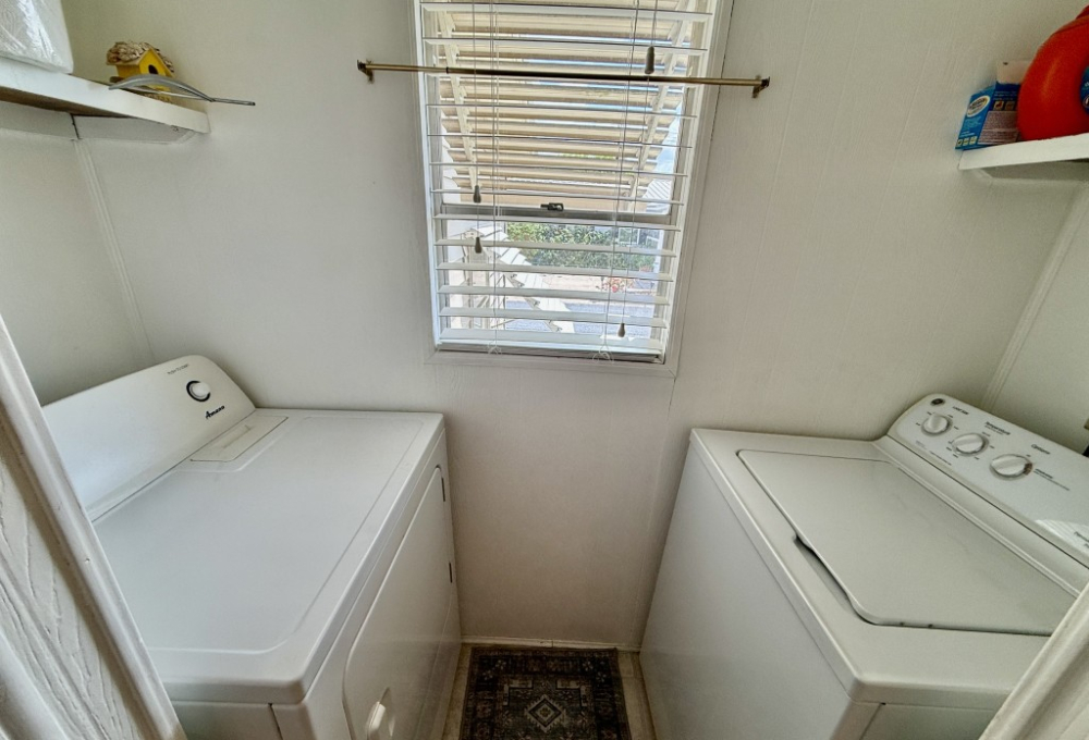 Inside, the beautifully appointed Texas room opens into a generously sized living area. Adjacent to the living room is the dining space, which leads to a well-equipped kitchen featuring abundant cabinetry and counterspace, as well as upgrades including a Bosch dishwasher and an Armoire refrigerator/freezer. The primary bedroom is spacious, tastefully decorated, and exudes a serene atmosphere. It includes an ensuite bathroom with a walk-in shower, double sinks with a vanity area, linen closets, and laundry appliances. Both bedrooms are thoughtfully decorated, have large closets, and offer an comfortable accommodation. The split-bedroom layout further enhances privacy by positioning the bedrooms at opposite ends of the home.