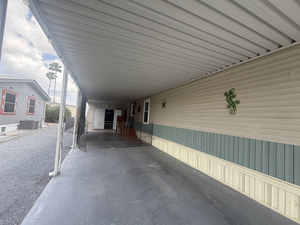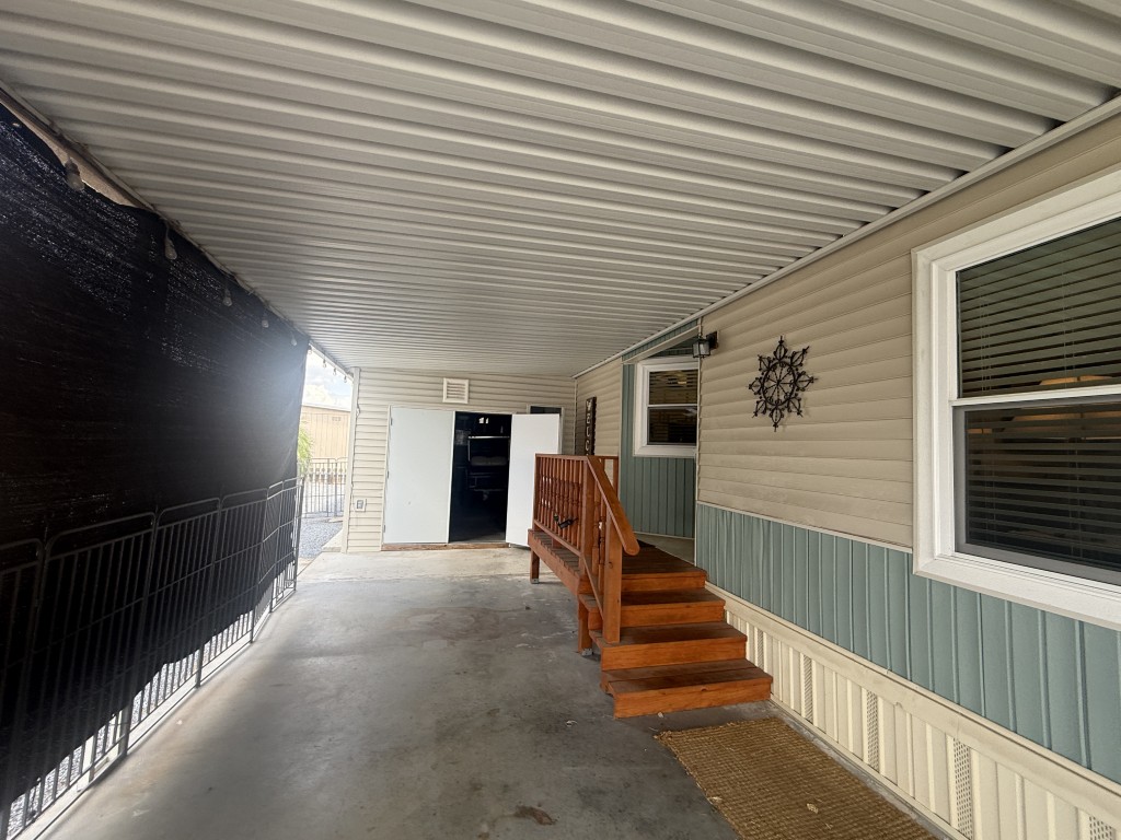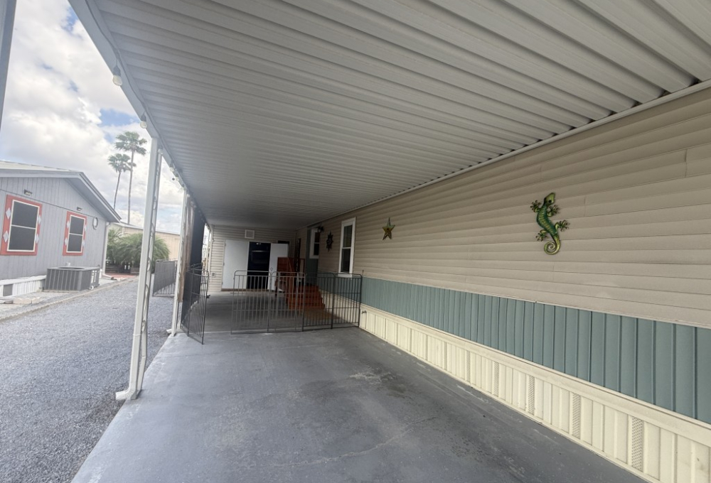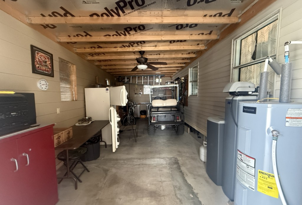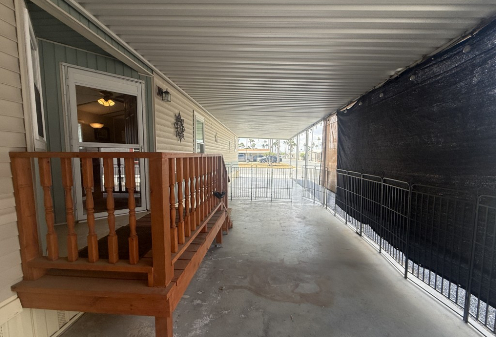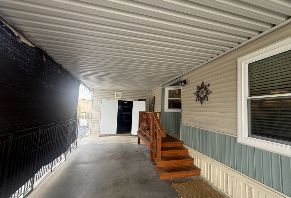 Outdoor living is a highlight, featuring an 11 x 31 carport/patio area with sunshades, perfect for relaxing after a day of activities. The 11 x 31 workshop includes electric service and double doors, offering excellent storage and easy access for a golf cart, a must‑have for park living.
