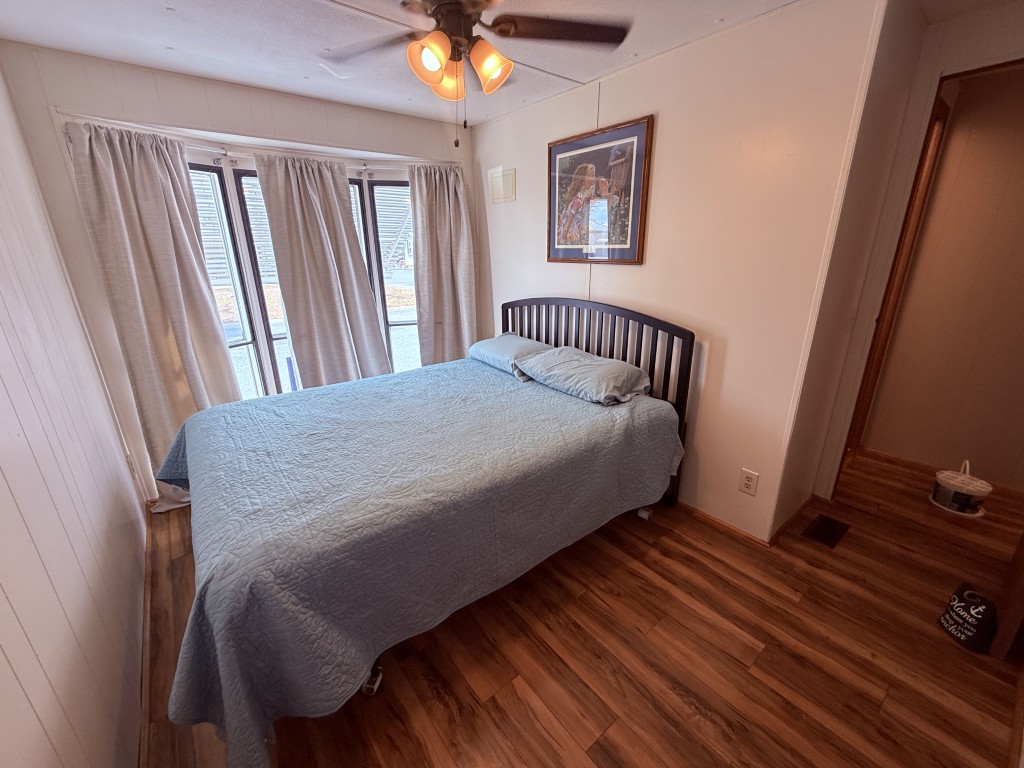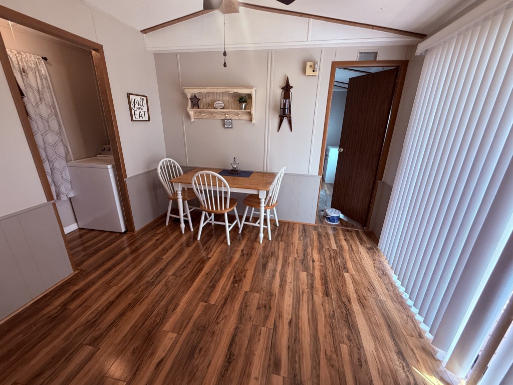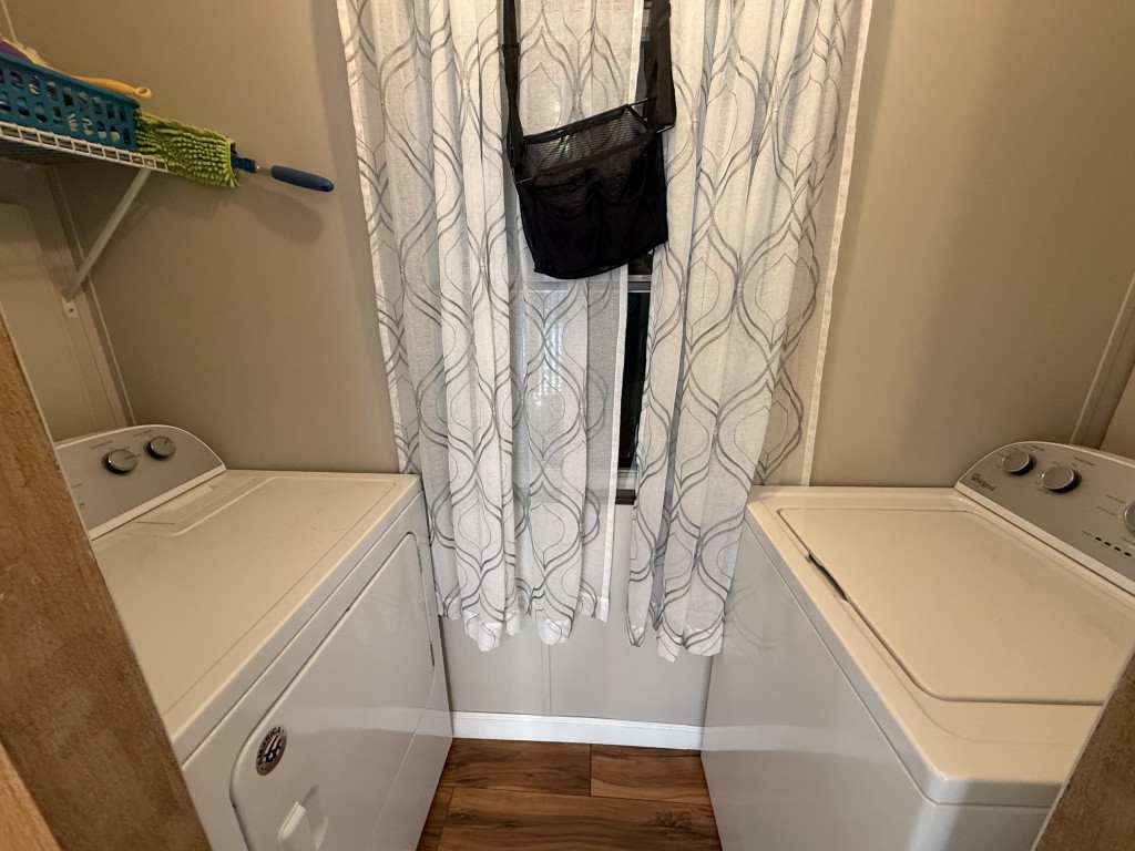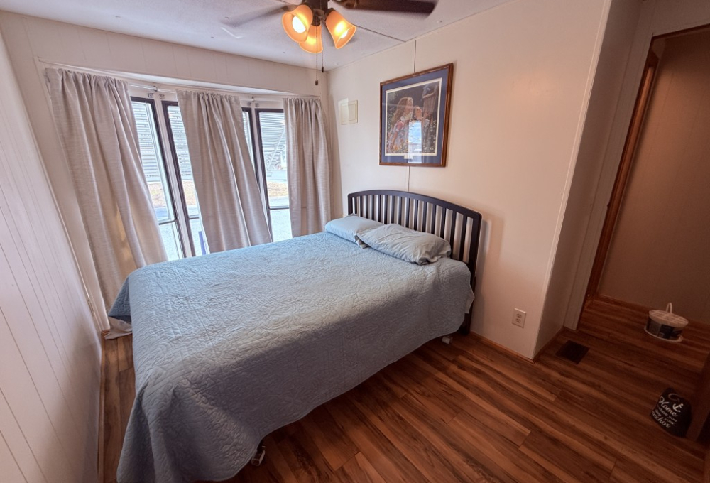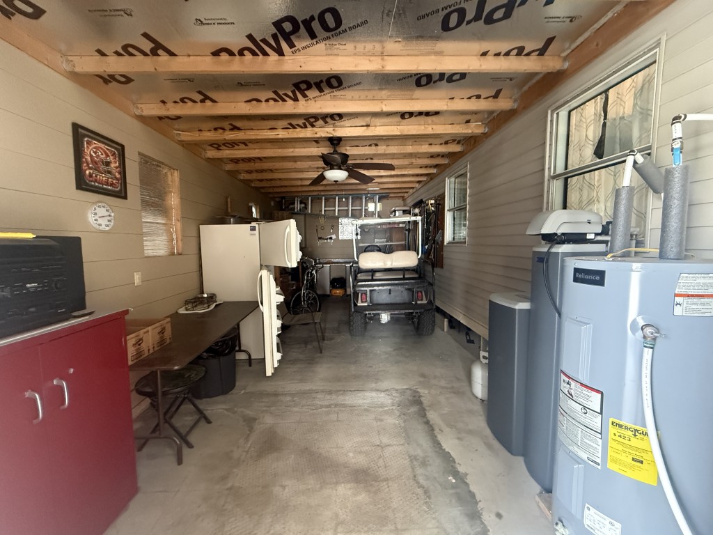 Outdoor living is a highlight, featuring an 11 x 31 carport/patio area with sunshades, perfect for relaxing after a day of activities. The 11 x 31 workshop includes electric service and double doors, offering excellent storage and easy access for a golf cart, a must‑have for park living.