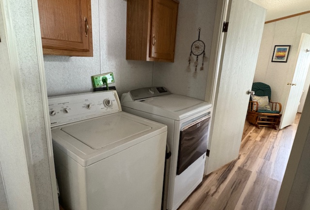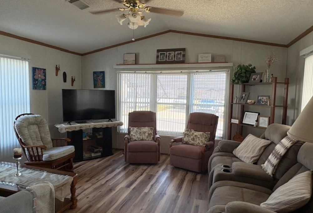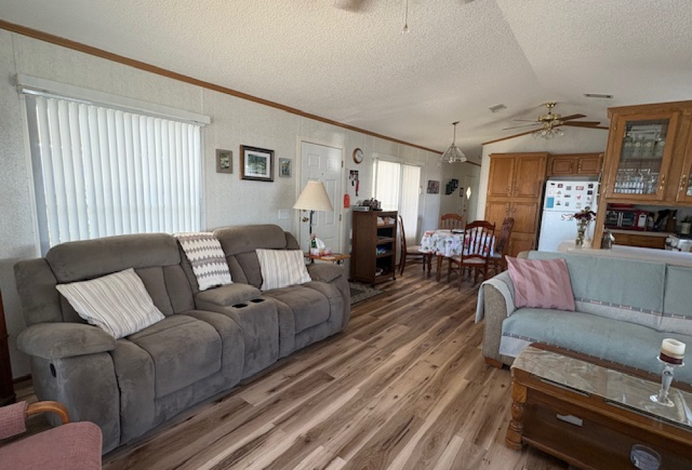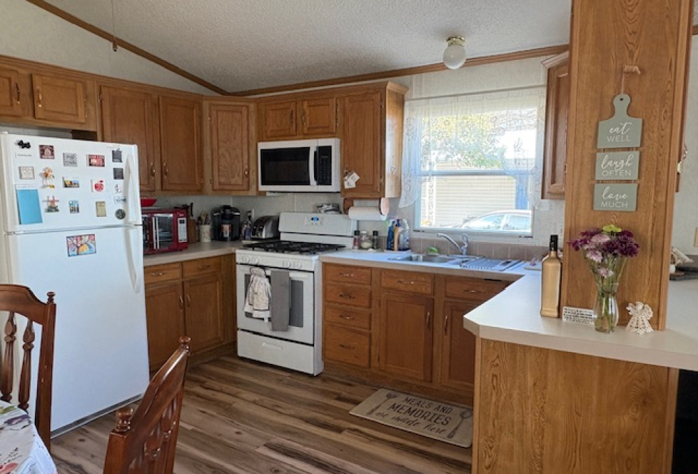 New flooring throughout, newer kitchen appliances, thermal windows, and a large carport for patio entertaining as well as vehicle parking. The golf cart, with new lithium battery, is also negotiable. The spacious front living room has several windows and is open to the center kitchen area. Appliances include a newer gas stove and microwave and there is a dining area that could seat 4 to 6 people.