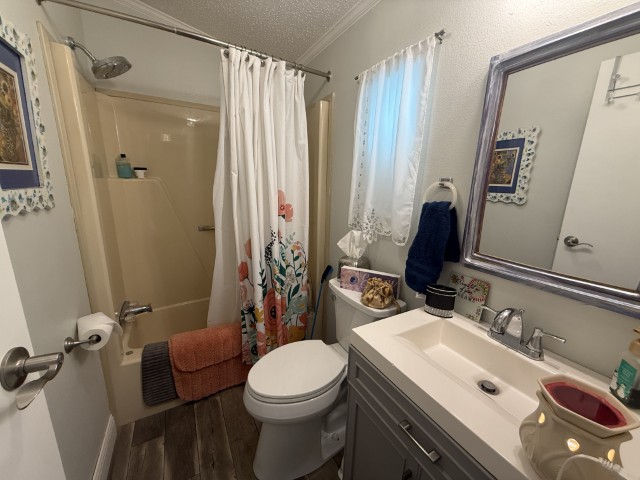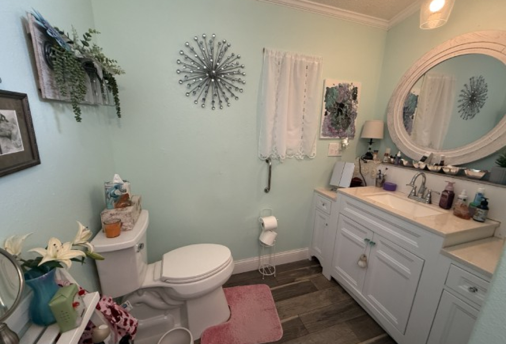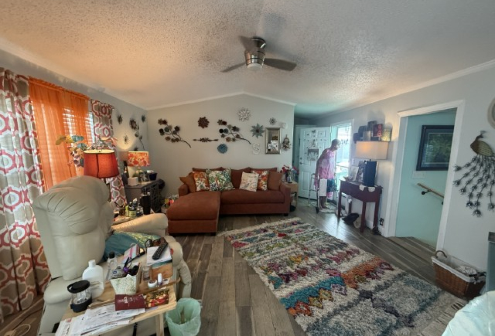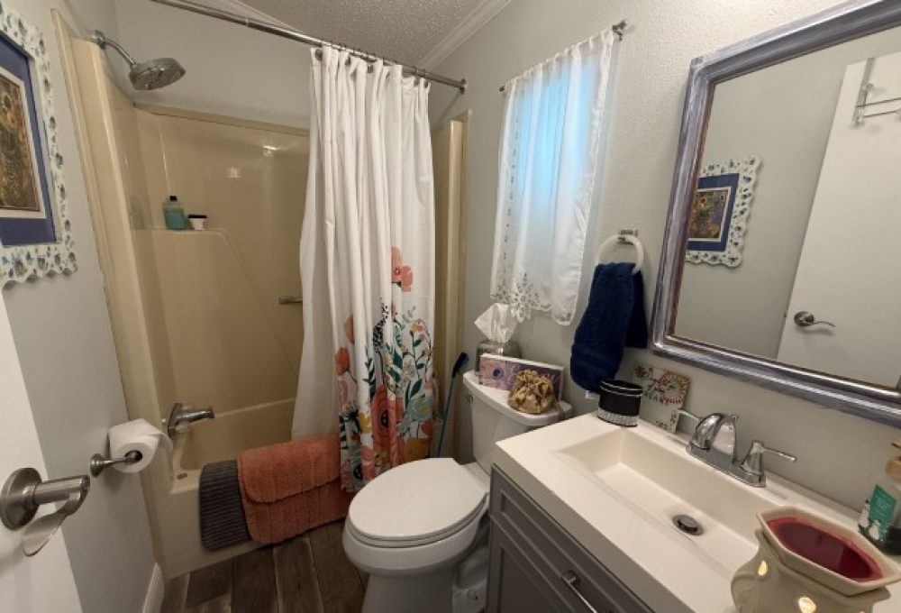 This home offers two large bedrooms and two full baths. The guest room, located at the front, is inviting and roomy, while the guest bath features a high-rise toilet, single sink vanity, and a convenient tub/shower combo. The heart of the home is the open living, dining, and kitchen area, where natural light pours in through a charming three-window bay. The kitchen is a chef’s delight, boasting resurfaced and freshly painted cabinets with new hardware, abundant counter space, and a welcoming atmosphere for gatherings.