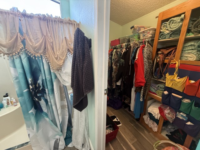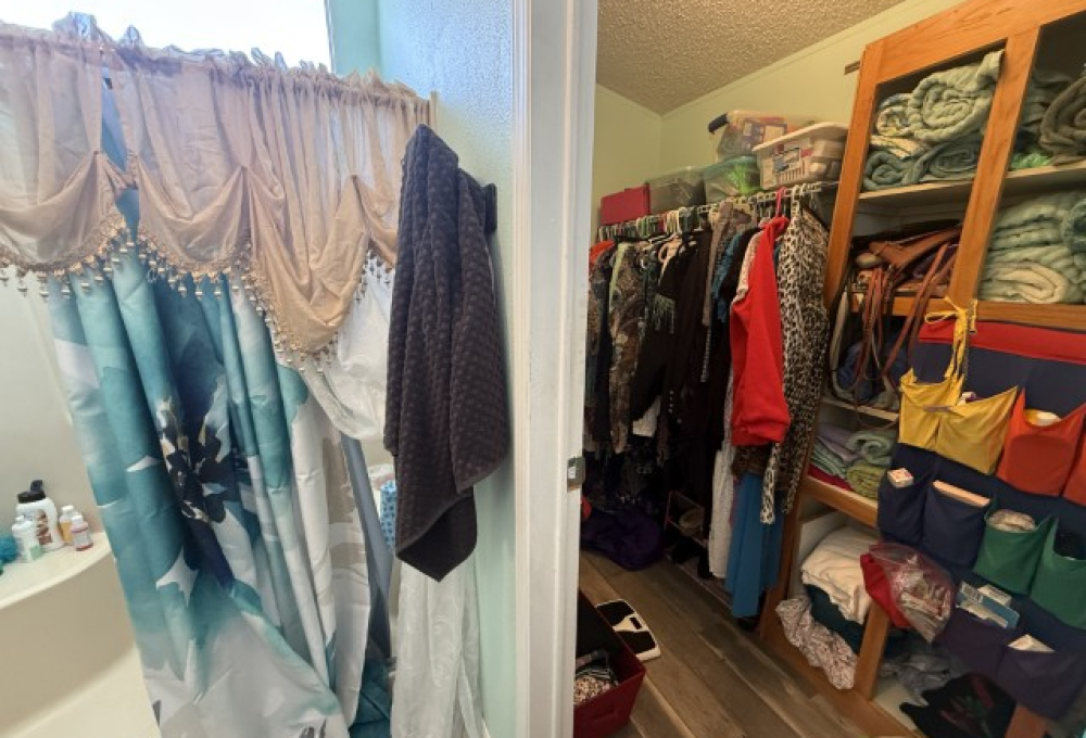 Down the hall, you’ll find a dedicated laundry room with a newer exterior door, leading to the master suite. The master bedroom features an impressive walk-in closet and a luxurious en-suite bath with a spacious walk-in shower, updated vanity and lighting (2023), and a high-rise toilet for added comfort.