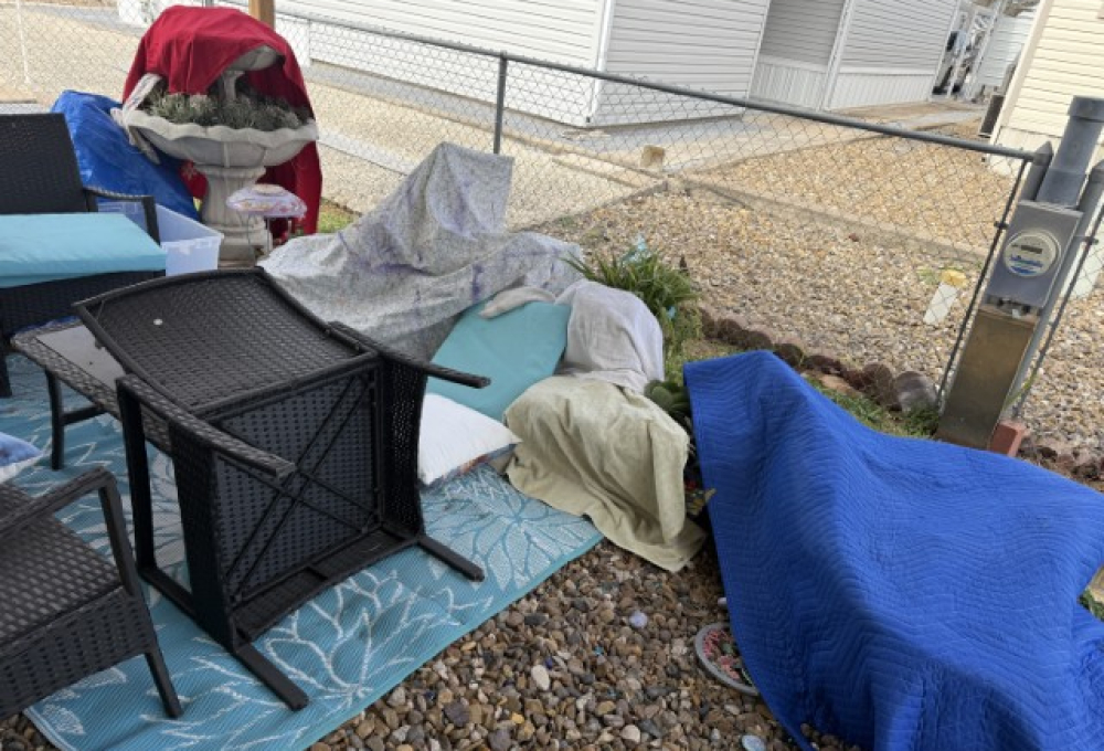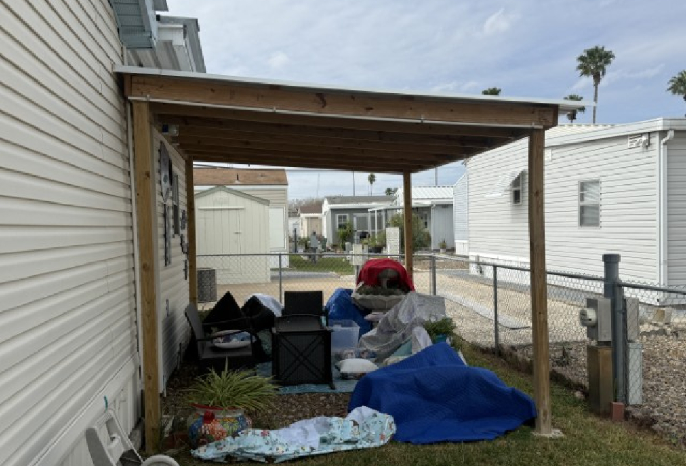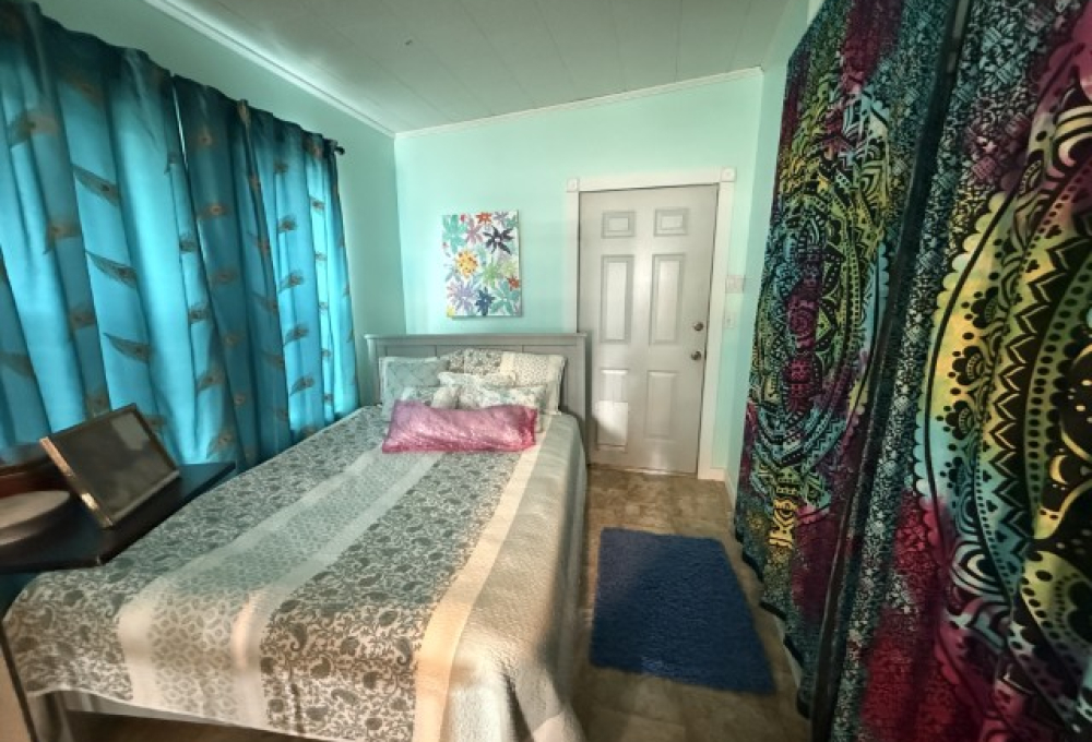 The Texas Room addition is currently set up as a versatile living area and bedroom, with double doors to the carport and a new (2023) door leading to a covered walkway to the large, electrified workshop. Beyond the workshop, a door opens to the yard, and a concrete walkway leads to the inviting 8 x 10 covered rock patio—ideal for outdoor relaxation.