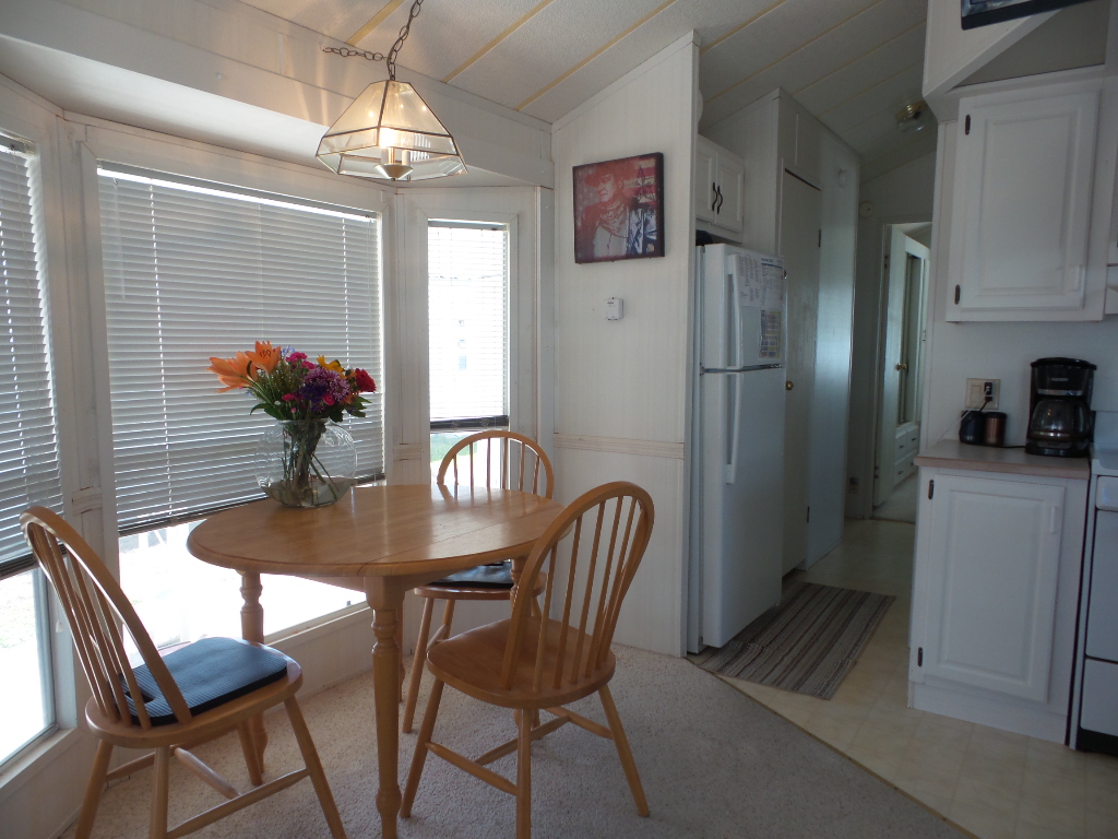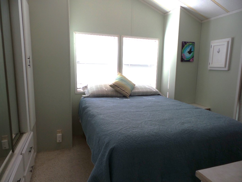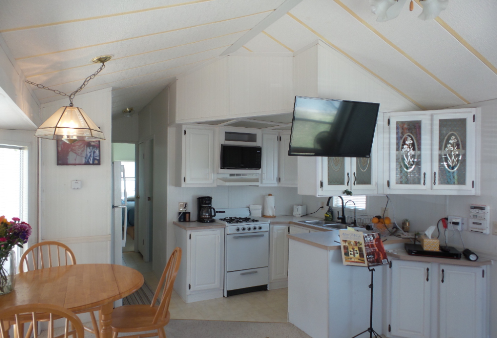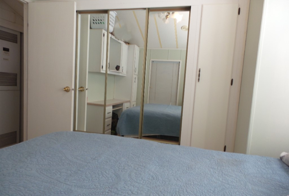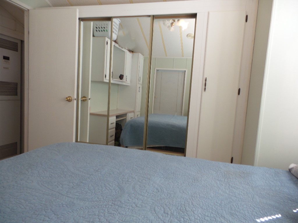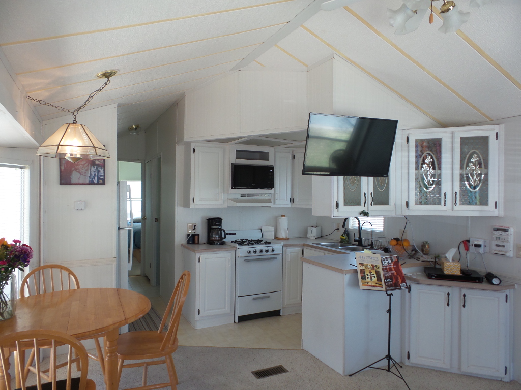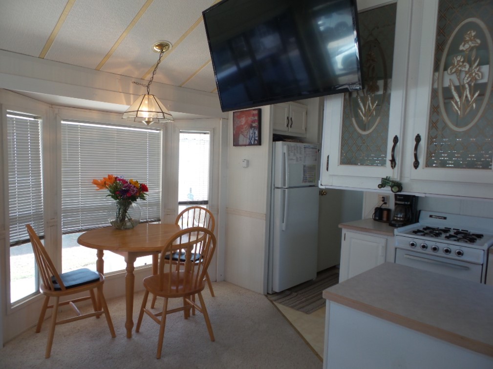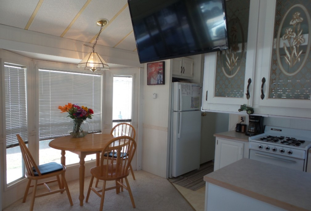 Town & Country 1997 1 bedroom 1 bathroom Park Model 12x33’ (396 sq ft) with a shed & great patio area. Entering the front Livingroom, you note a reclining loveseat facing the wall mounted TV, accessible to the dinette tucked into the bay window. The oak dinette is conveniently located with the galley style kitchen, including a gas stove, microwave, plus the fridge along the hallway adjacent to the pantry. The bathroom has a walk-in shower & linen closet with new fixtures here as well. A back door exit is across from the coat closet with the new quality Q mattress, within the master bedroom at the back of the home. A dresser & extensive closet provide storage. The full-size W/D are within the storage shed. A new steel roof, updated appliances & water heater provide low maintenance & energy efficiency.