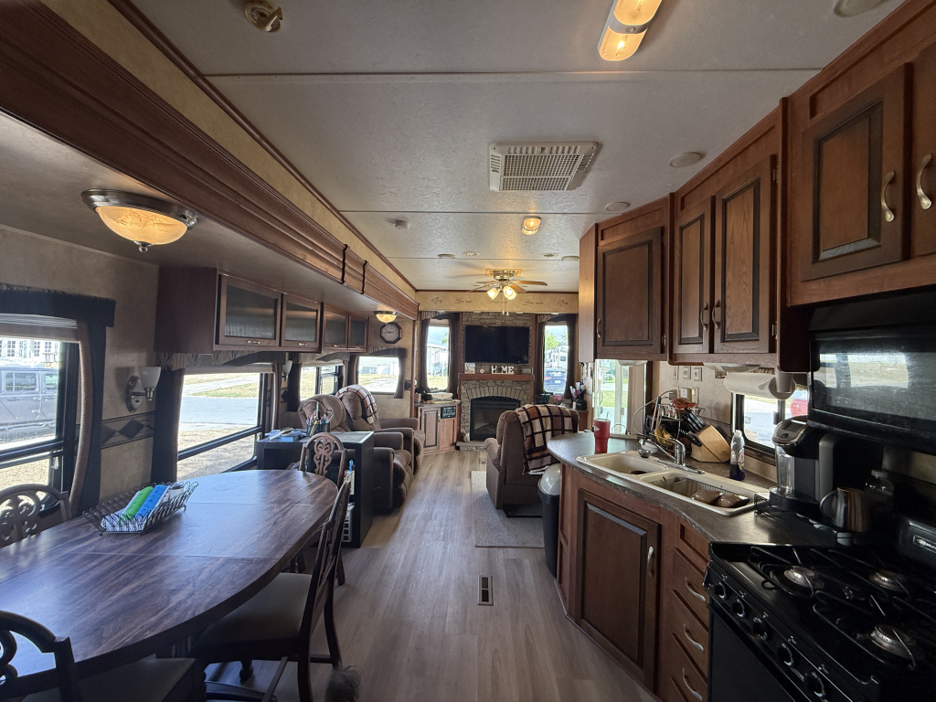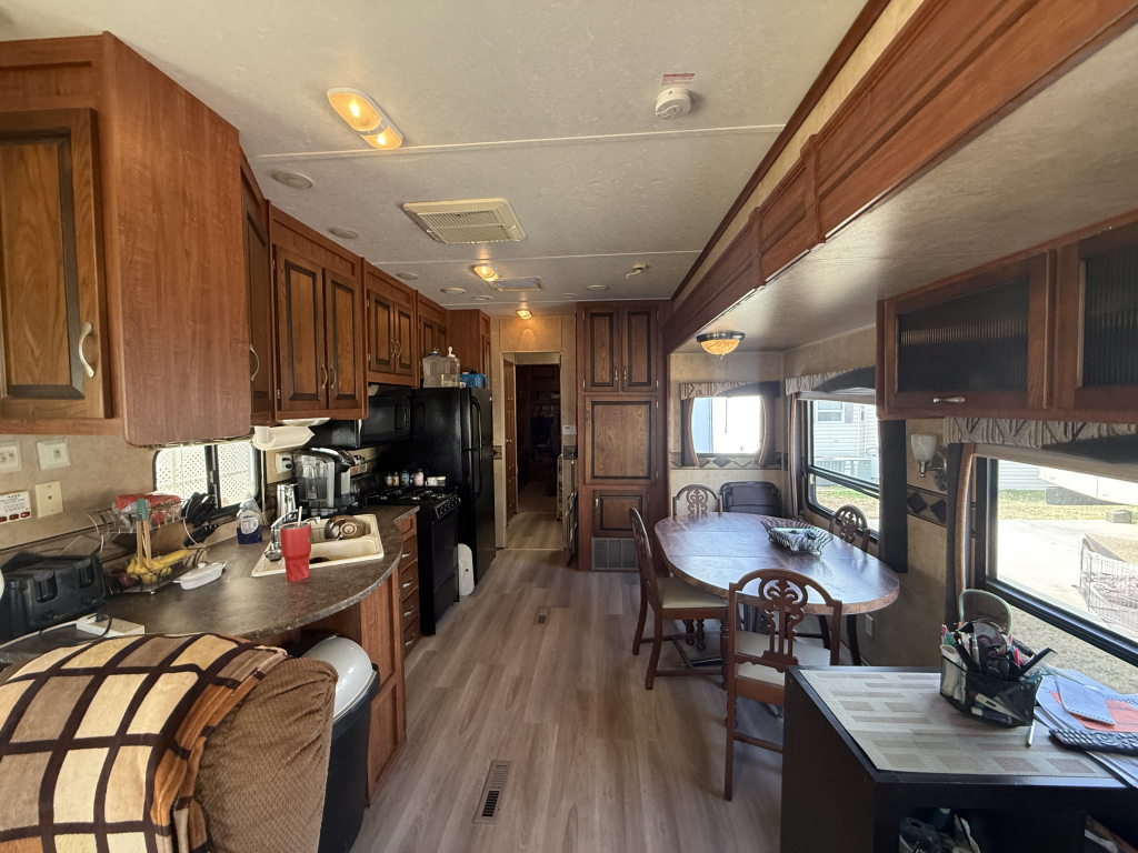 Inside the home, you’ll find new laminate wood‑look vinyl flooring, an electric fireplace, and abundant windows that fill the space with natural light. The living area is located at the front, flowing seamlessly into the dining area and kitchen. The kitchen features a full‑size refrigerator and freezer, gas stove, double sink, and plenty of counter and cabinet space for storage.