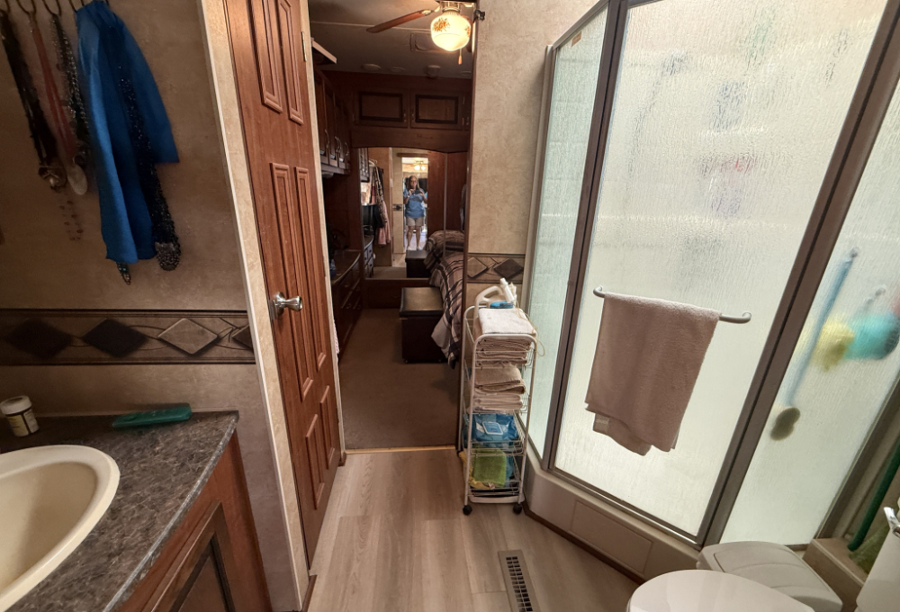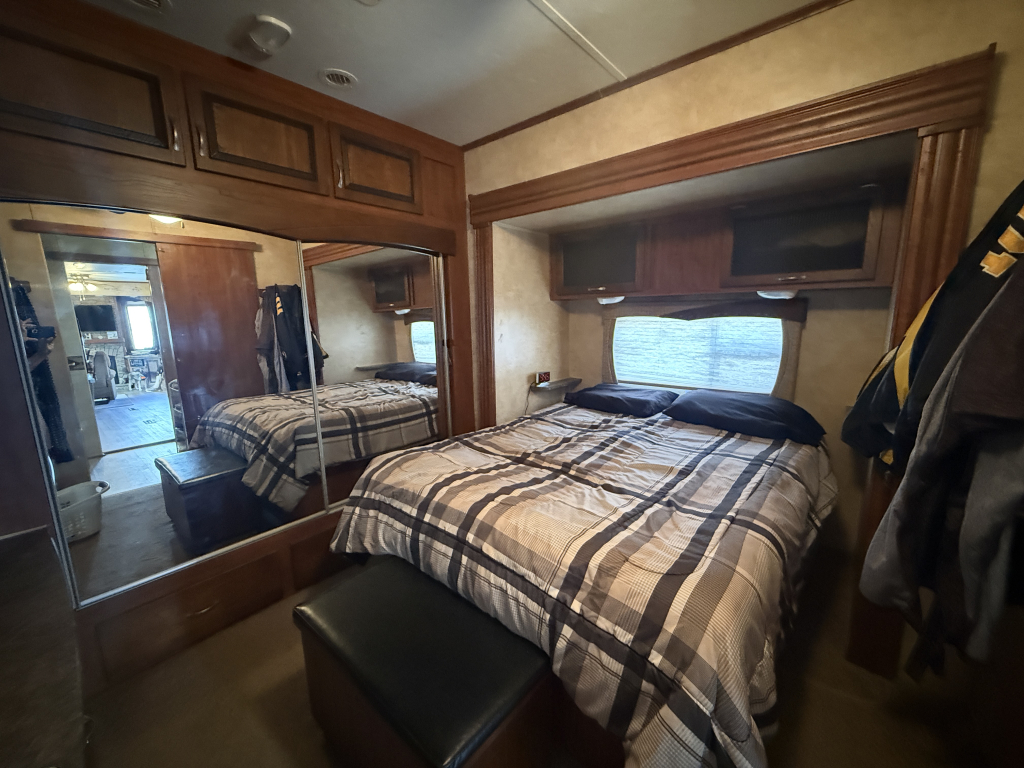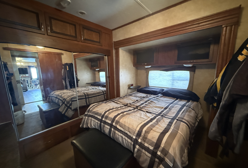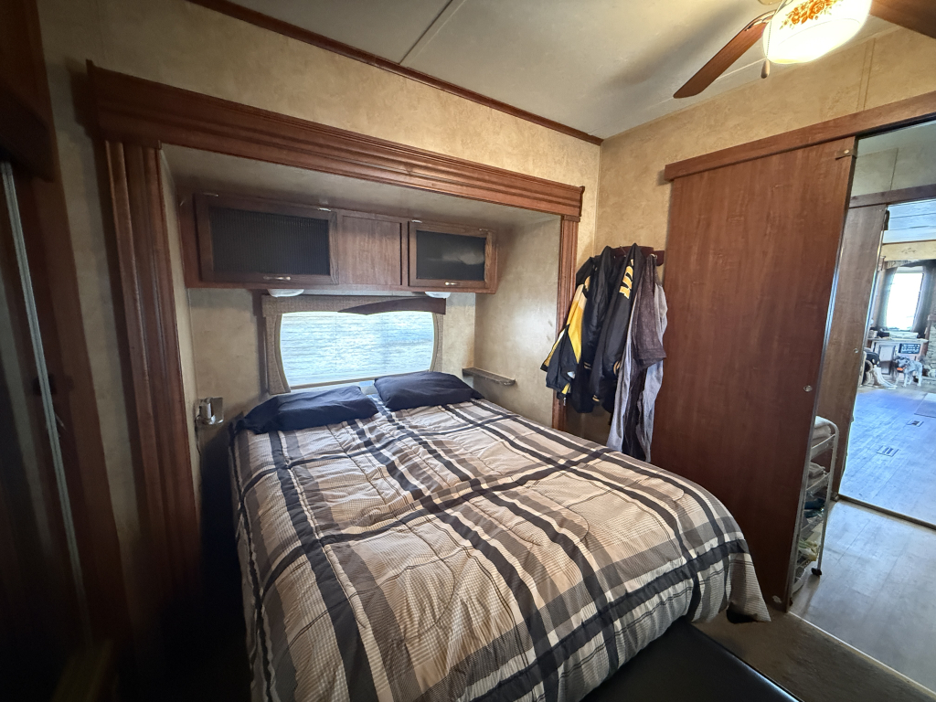 The bathroom is centrally located and has been updated with a new high‑rise toilet and a fiberglass walk‑in shower. The bedroom is located at the rear of the home and includes a queen‑size bed with storage underneath, large closet space, and multiple built‑in drawers.