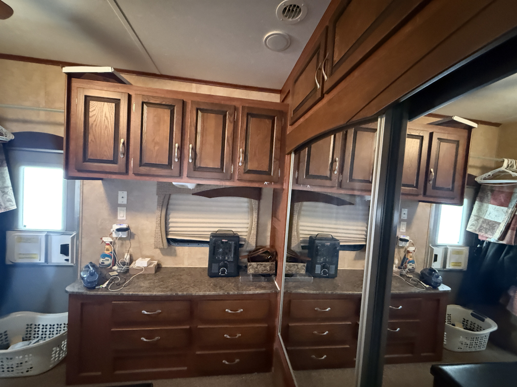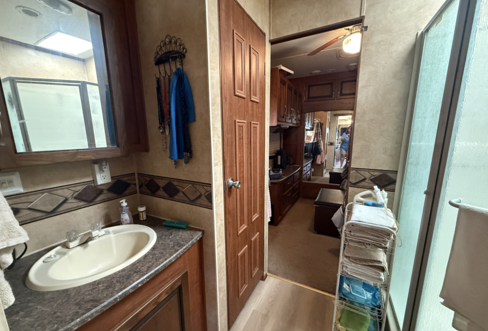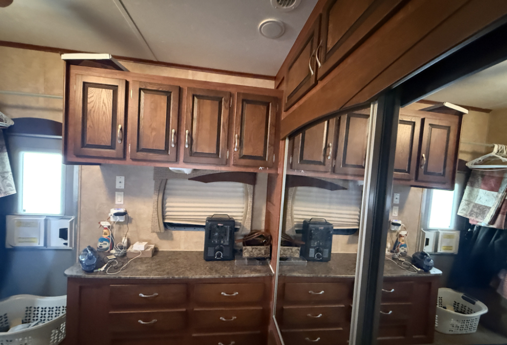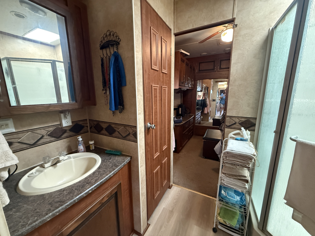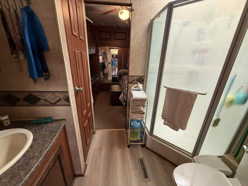 The bathroom is centrally located and has been updated with a new high‑rise toilet and a fiberglass walk‑in shower. The bedroom is located at the rear of the home and includes a queen‑size bed with storage underneath, large closet space, and multiple built‑in drawers.