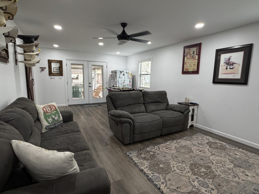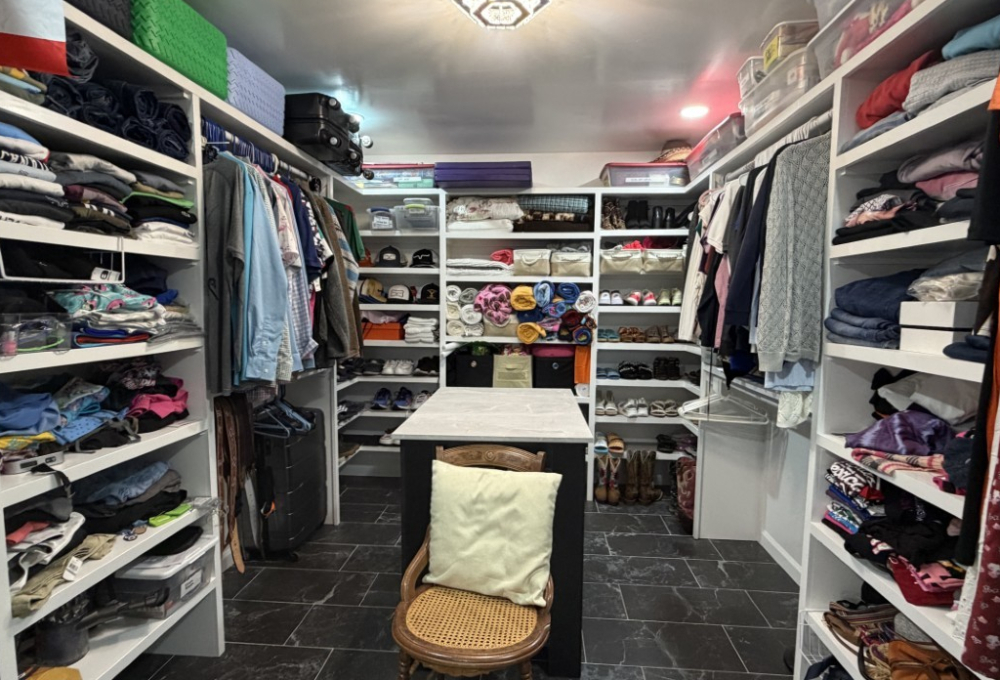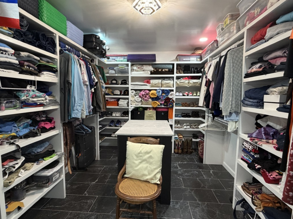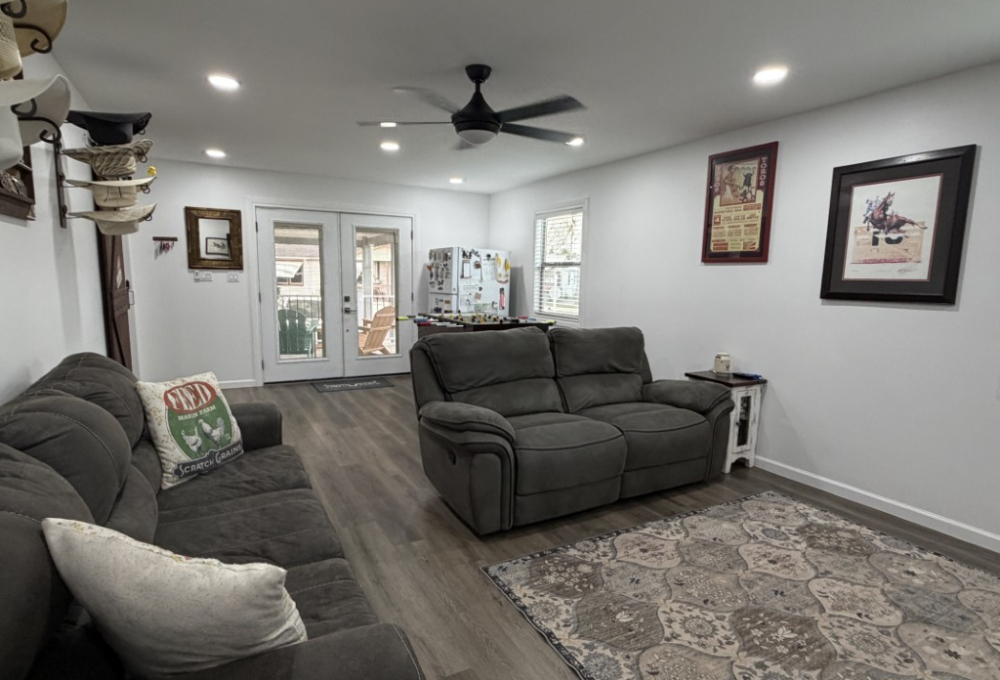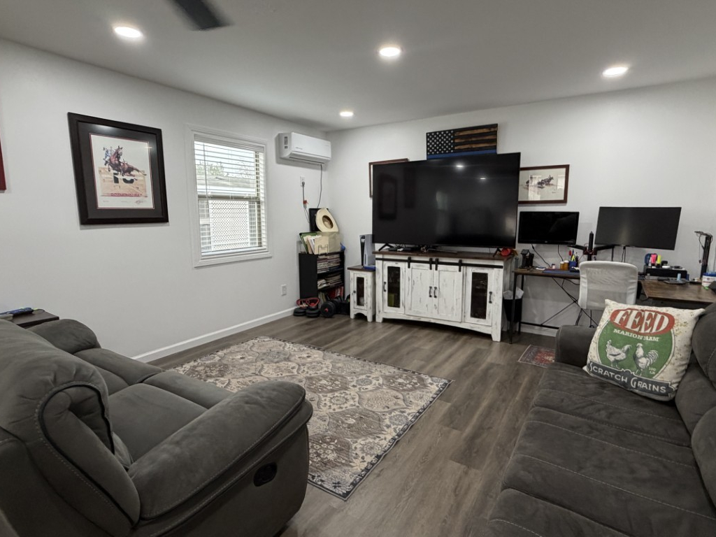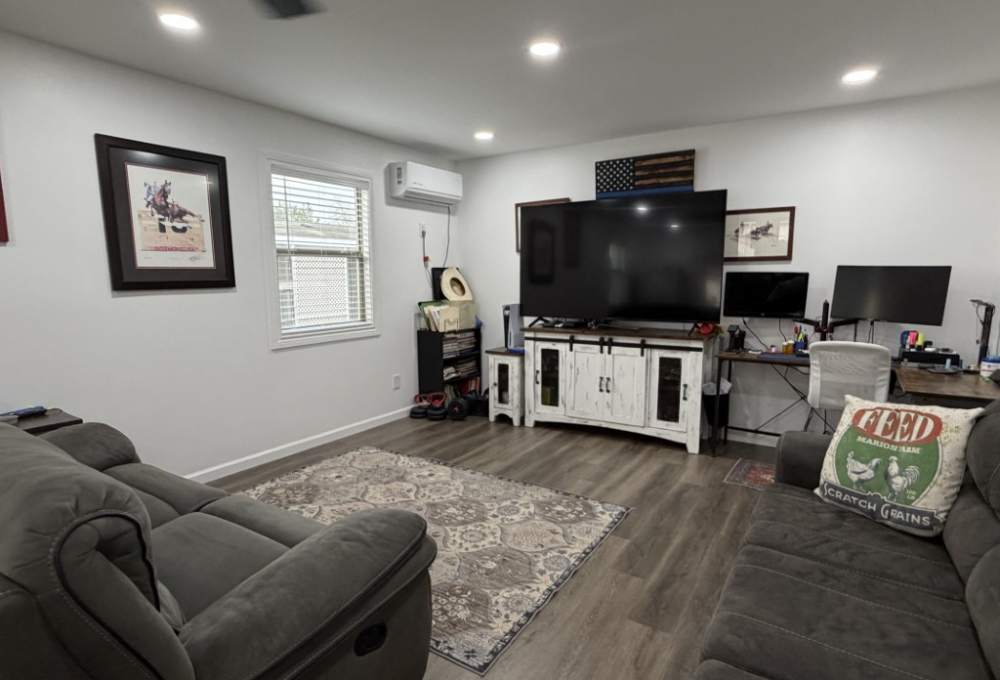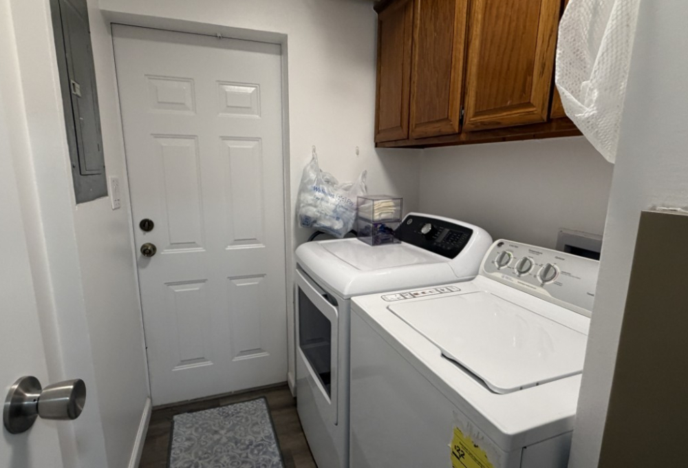 The Texas room adjacent to the kitchen is thoughtfully appointed with comfortable furnishings and a TV, offering ample space for gaming equipment if desired. The laundry room features a full-size washer and dryer for convenience.