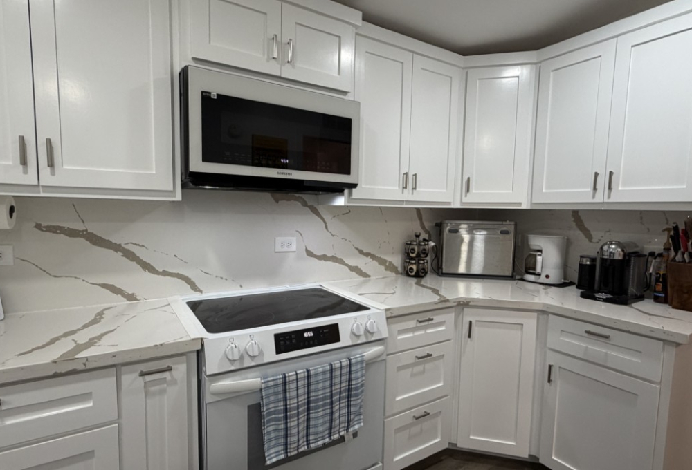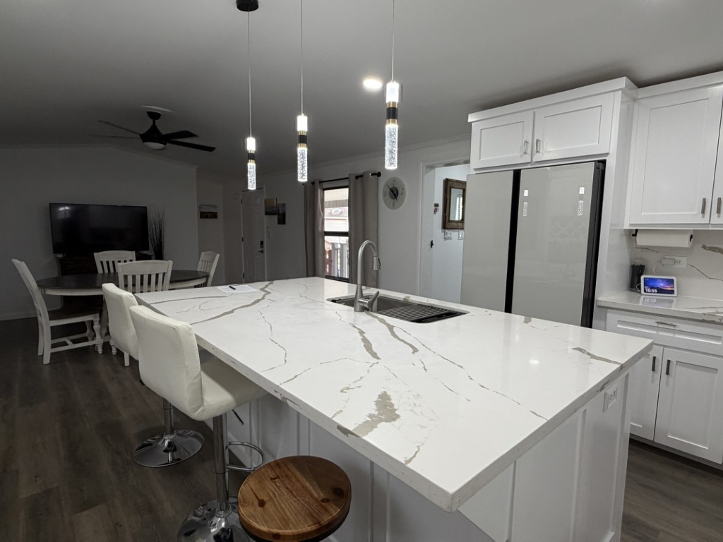 This all-electric, fully furnished residence showcases a modern kitchen with new appliances, granite countertops, and an elegant backsplash, centrally located beside a dedicated dining area. The master suite, situated at the rear of the home, includes a king-sized bed with dresser set, a luxurious tiled walk-in shower, a chair-height commode, and an expansive walk-in closet. The guest bedroom and bath are positioned at the front, with the guest bath also boasting a beautifully tiled walk-in shower.