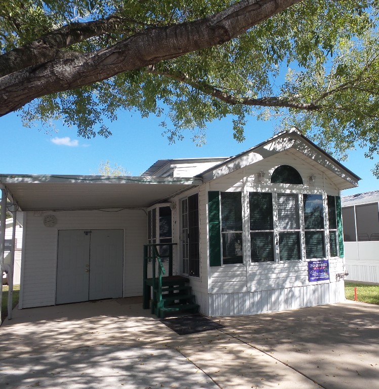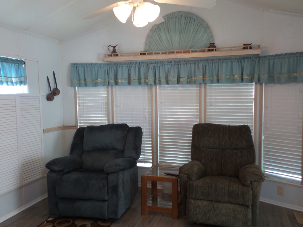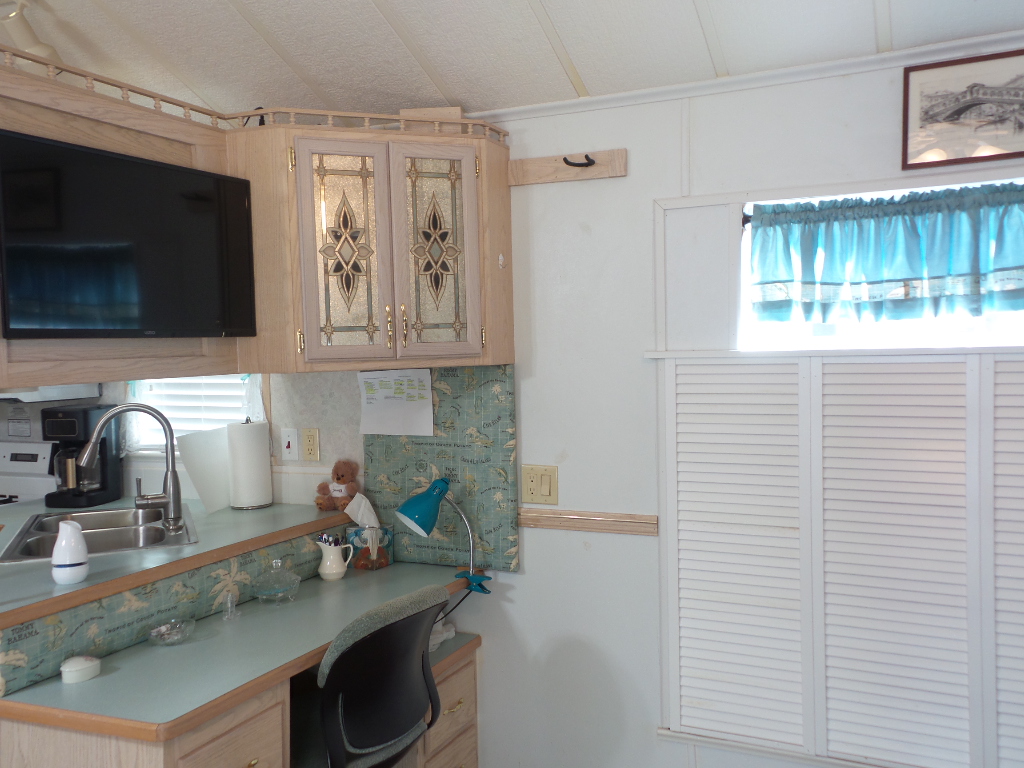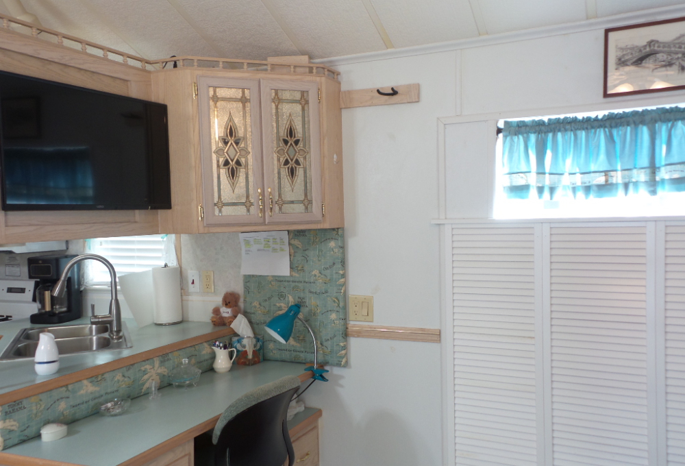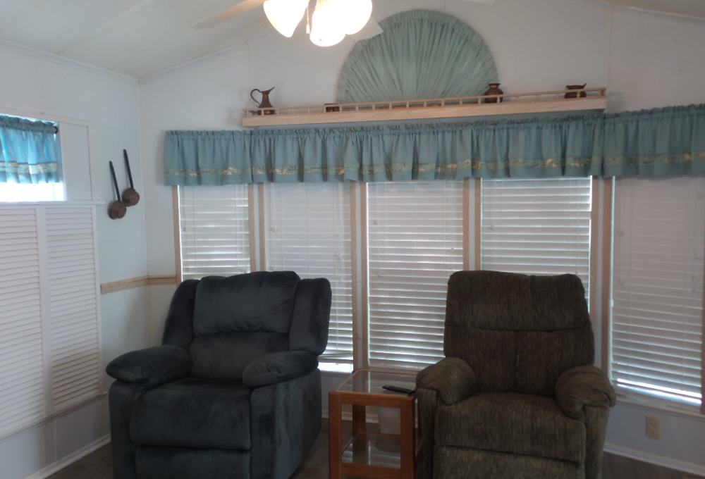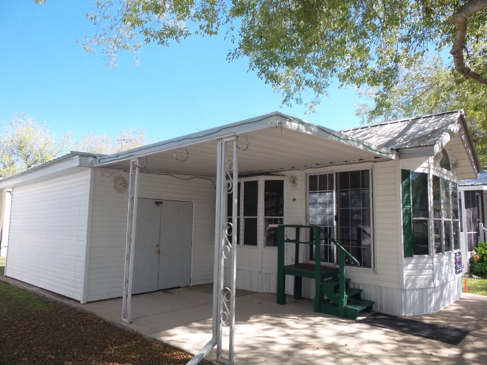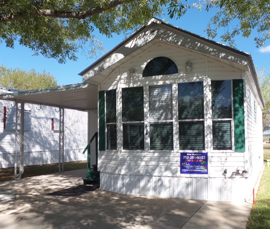 2000 Dutch 33x12’ (396 sq ft) Park Model, with 1 bedroom and 1 bathroom, plus an 18x12’ workshop. Numerous updates and customization have been lovingly added to this home. As you drive up the driveway, you notice the added cement providing room for extra parking and a golf cart. The covered area allows space for enjoying the patio and double doors to the workshop (containing the water heater) and storing a golf cart. Painted steps lead to the sliding patio door entrance to the Livingroom with high ceilings, color coordinated drapery, recliners facing the wall mounted tv, above a custom desk and new shuttered window. Tinted windows and blinds control the natural light, adding airiness to this open concept room, with a dinette in the bay window, convenient built-in cabinets line the wall and an L shaped kitchen features a newer Maytag fridge, microwave, updated kitchen faucet & the gas range. A pantry is adjacent to the stacked, newer washer and dryer set, across from the bathroom entrance. An updated walk-in shower (with handrail), hi-rise stool and extra white cabinets add to the bathroom renovations. To the back of the home is the twin beds or choose a Q bed arrangement with underbed storage, new lighting, a large, mirrored closet and drawers beneath, with a TV mounted above. The home features new laminate flooring, a metal roof with warranty, vinyl siding, an updated water heater and air conditioning, as well as several appliances. It has extra added insulation and new windows for energy efficiency. Established trees provide shade and mowing/w/s are included. Come golf and enjoy the amenities…….Call Rita at 712-281-9862 for a tour!