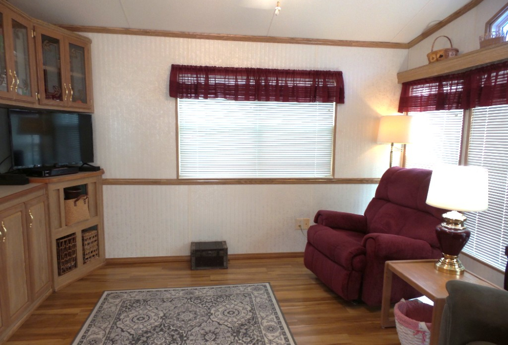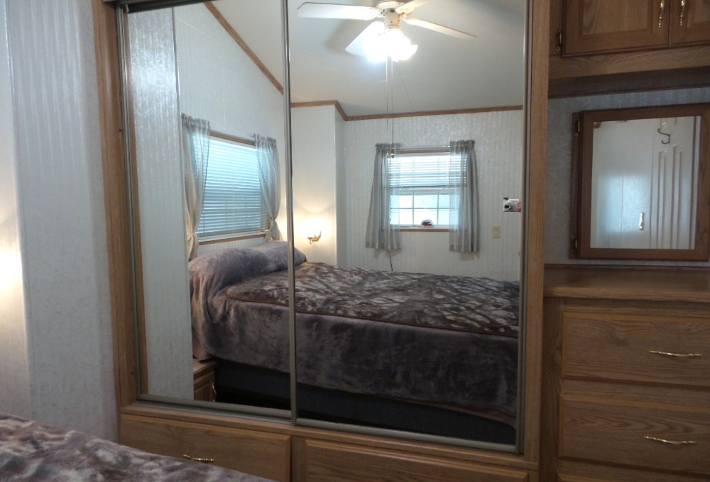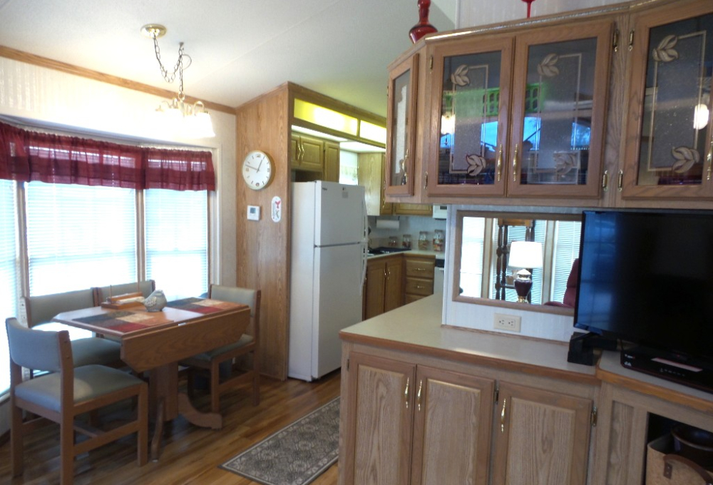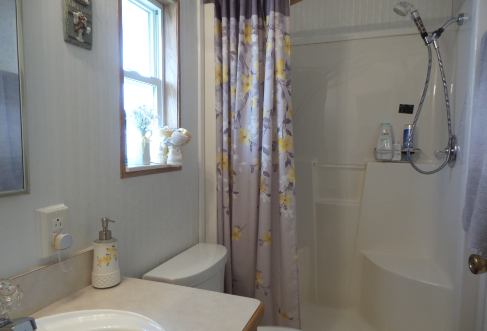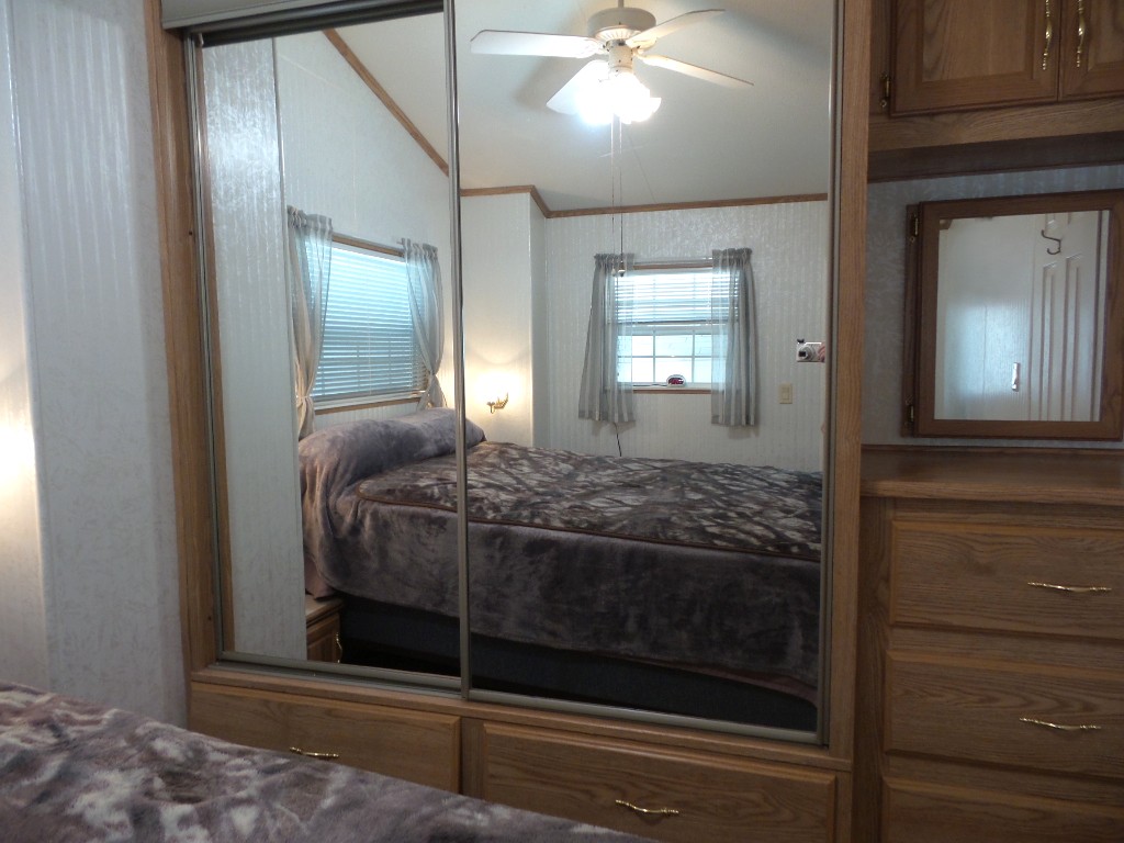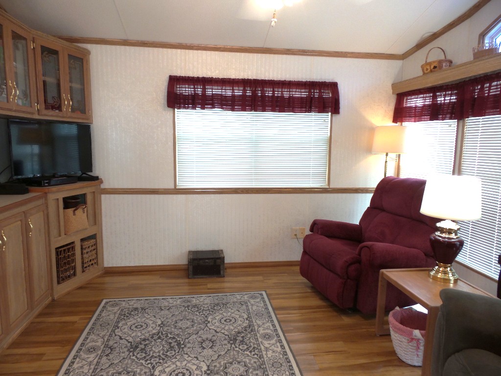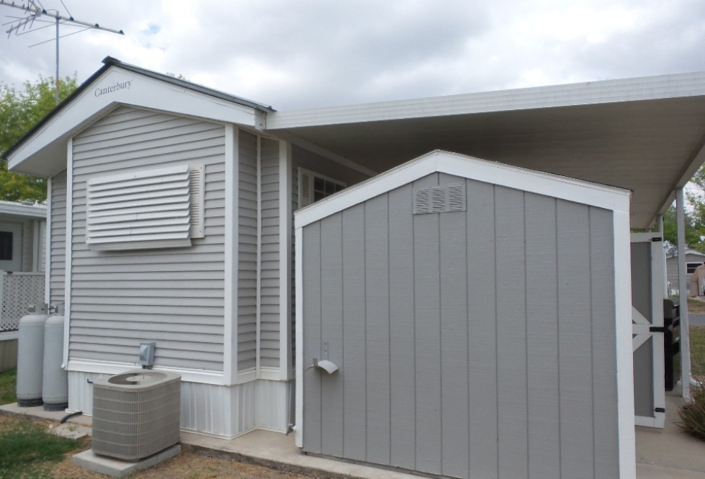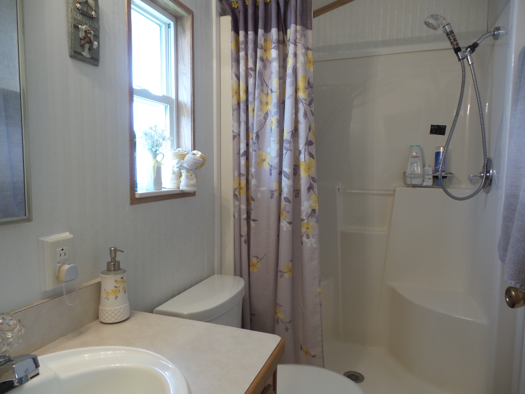 Canterbury 2002 1 bedroom, 1-bathroom 12x33’ (396 sq ft) park model with shed/workshop. Driving up to this home you note the steel gutter ramps for a smooth parking entry. Up a few painted steps you enter the front Livingroom thru a tinted patio door. Inside 2 recliners face the TV with an area rug, upon wood laminate flooring continuing throughout the home. A drop leaf dinette is within the bay window overlooking the patio. This is a walk-thru style kitchen with great lighting & more then ample cabinets. Appliances include the gas range, overhead microwave, fridge & ‘Dishmaster’ faucet set up to simplify washing dishes! Tucked around the corner is the bathroom featuring a walk-in shower adjacent to the Q bedroom. A mirrored closet & drawers beneath, plus an extra built-in dresser add clothing storage. The back door leads to a shed with a full-size washer, dryer, workbench, and storage. This home is well maintained on cement & nicely painted, in addition to light & bright. It’s energy efficient with thermal windows, ceramic sills, awnings & a steel roof. Located in a friendly park with extensive amenities including a golf course, RC track, indoor pickleball, arts & crafts, etc. Call Rita for a tour of all at 712-281-9862.