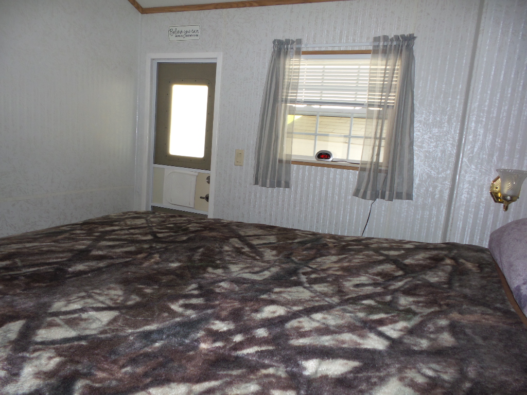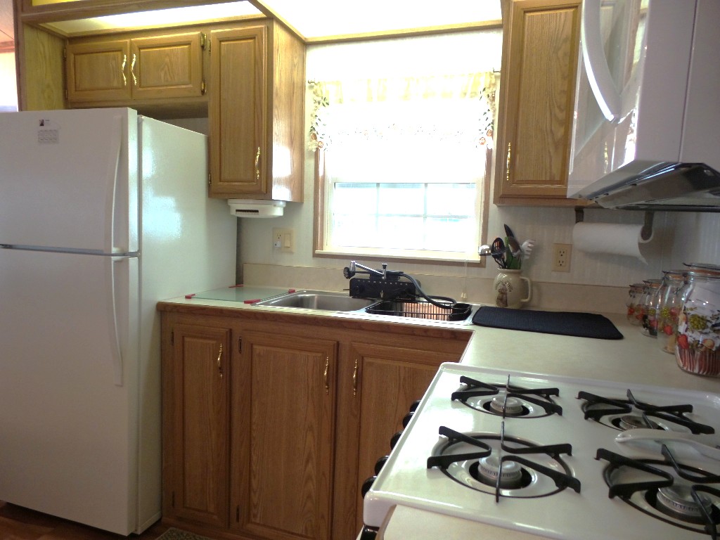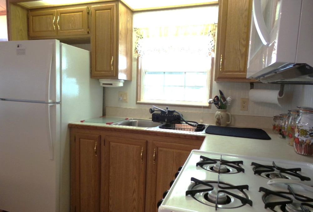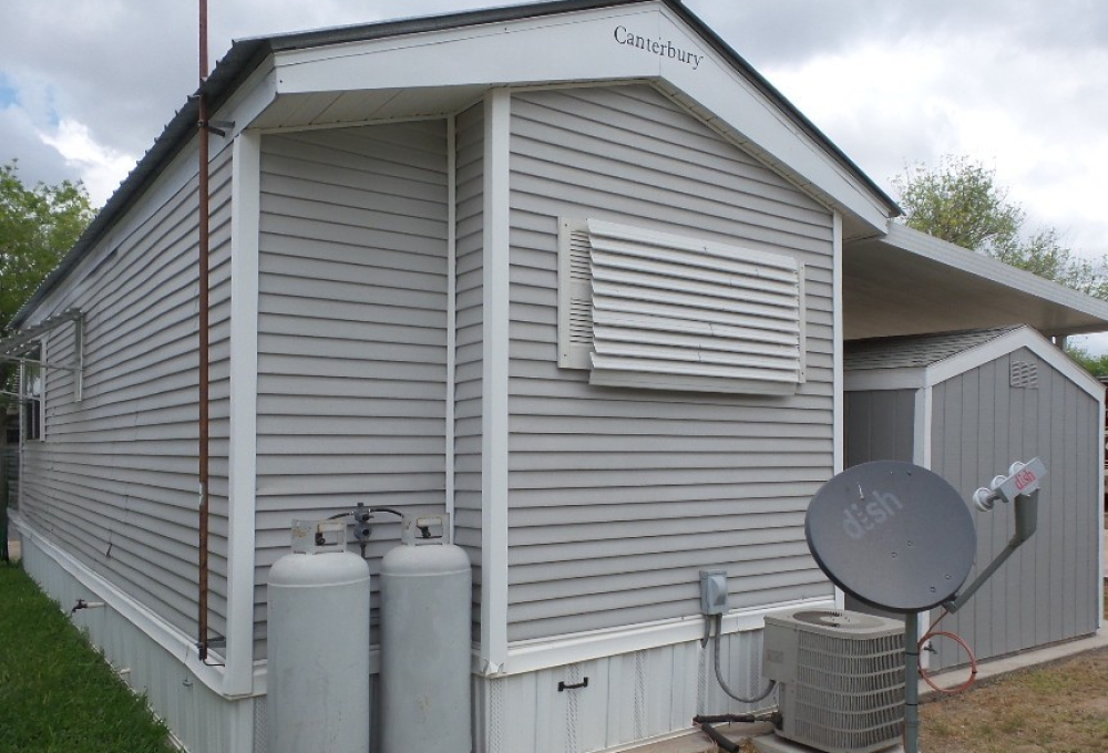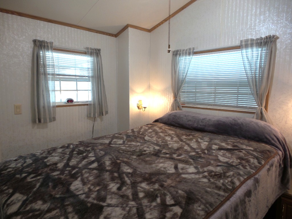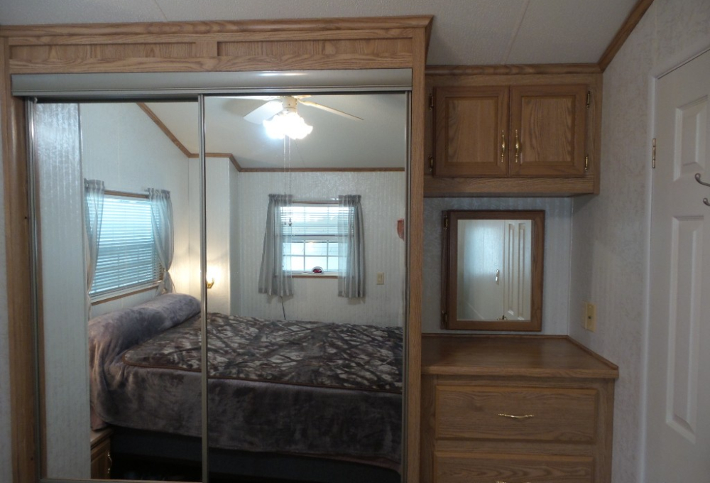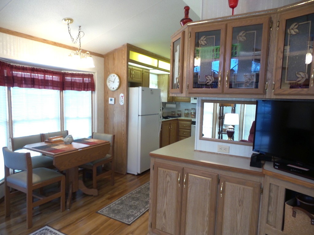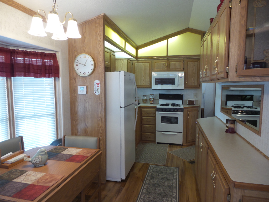 Canterbury 2002 1 bedroom, 1-bathroom 12x33’ (396 sq ft) park model with shed/workshop. Driving up to this home you note the steel gutter ramps for a smooth parking entry. Up a few painted steps you enter the front Livingroom thru a tinted patio door. Inside 2 recliners face the TV with an area rug, upon wood laminate flooring continuing throughout the home. A drop leaf dinette is within the bay window overlooking the patio. This is a walk-thru style kitchen with great lighting & more then ample cabinets. Appliances include the gas range, overhead microwave, fridge & ‘Dishmaster’ faucet set up to simplify washing dishes! Tucked around the corner is the bathroom featuring a walk-in shower adjacent to the Q bedroom. A mirrored closet & drawers beneath, plus an extra built-in dresser add clothing storage. The back door leads to a shed with a full-size washer, dryer, workbench, and storage. This home is well maintained on cement & nicely painted, in addition to light & bright. It’s energy efficient with thermal windows, ceramic sills, awnings & a steel roof. Located in a friendly park with extensive amenities including a golf course, RC track, indoor pickleball, arts & crafts, etc. Call Rita for a tour of all at 712-281-9862.