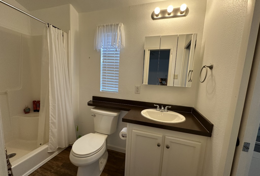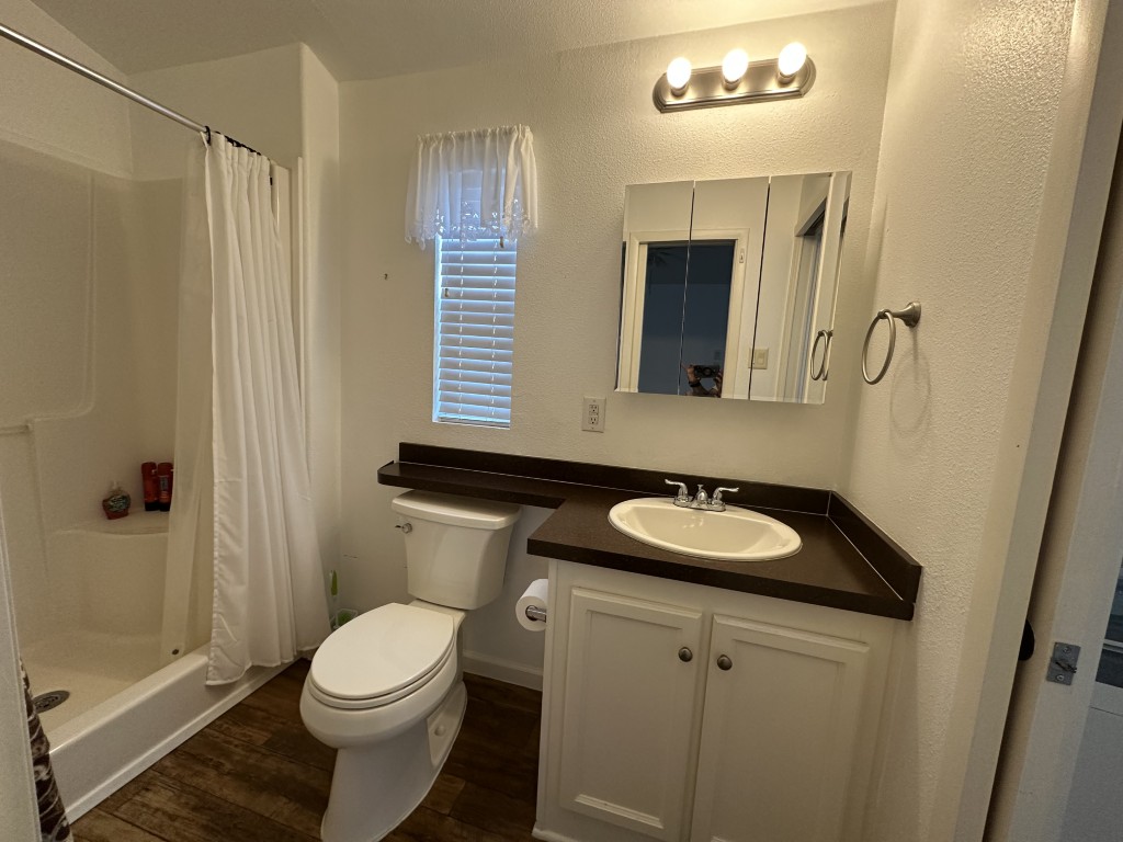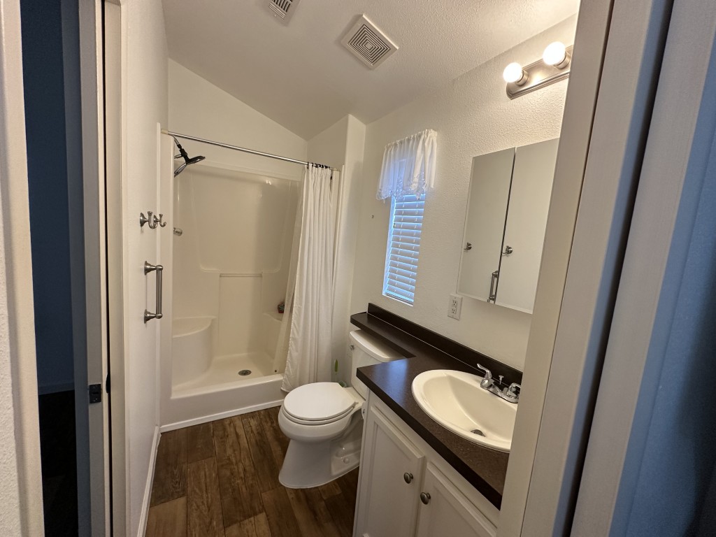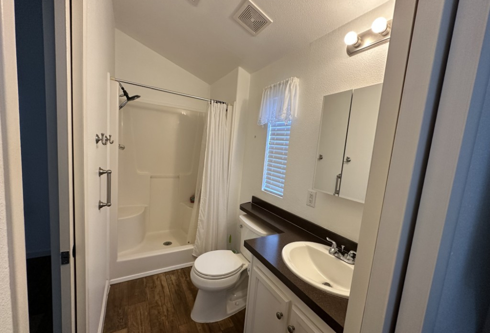 - Restroom with a walk-in shower and dual access doors connecting both the living area and bedroom