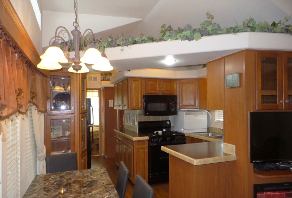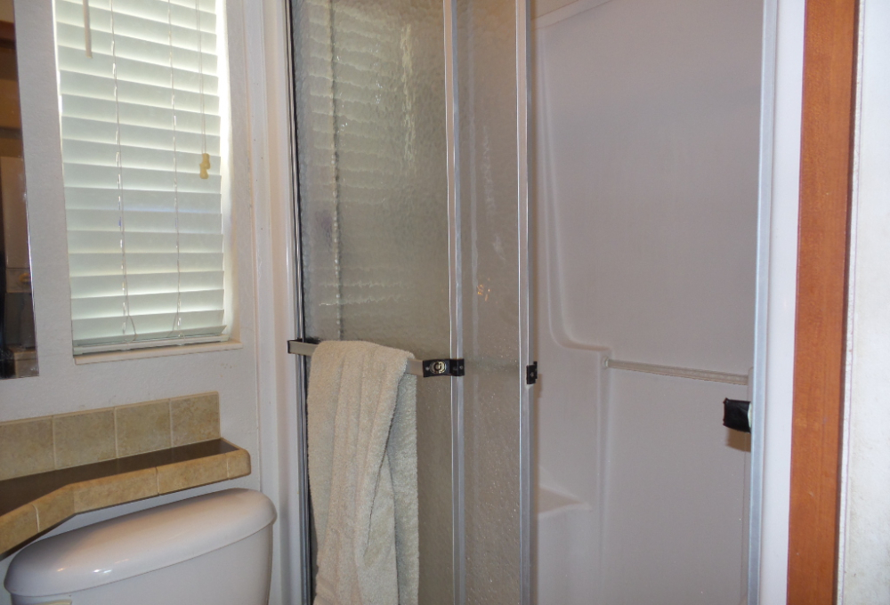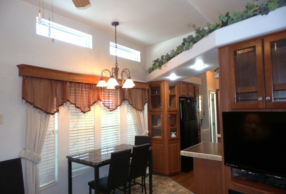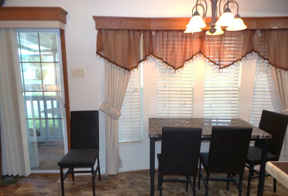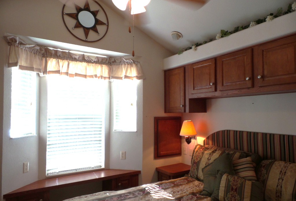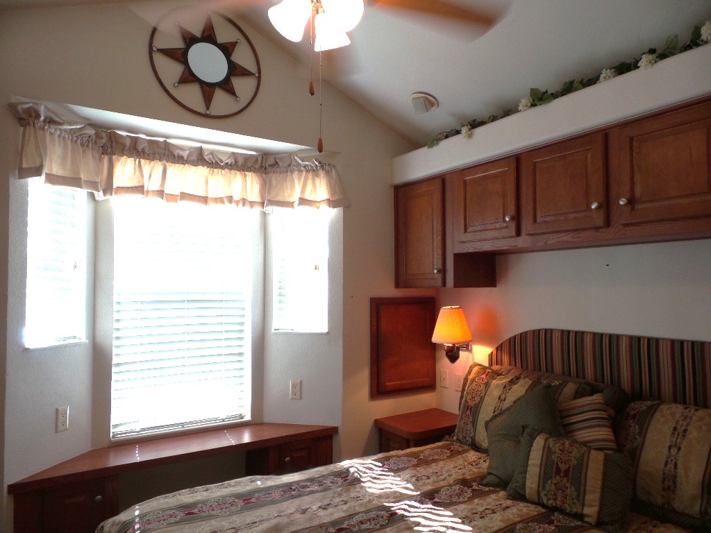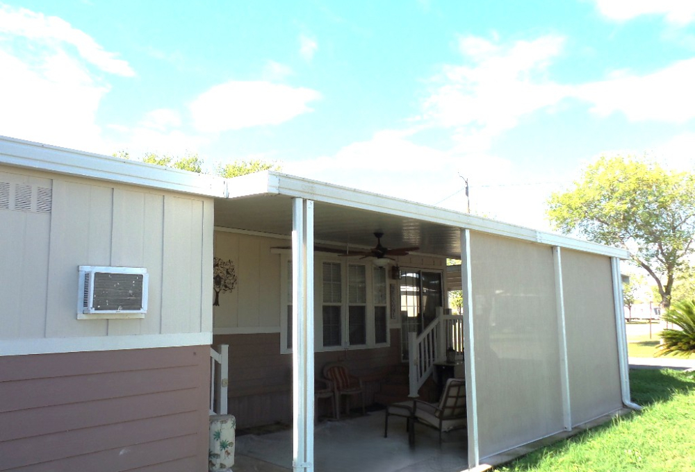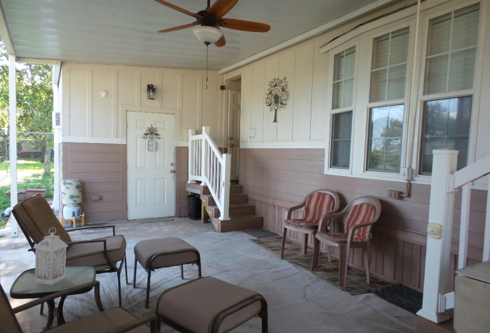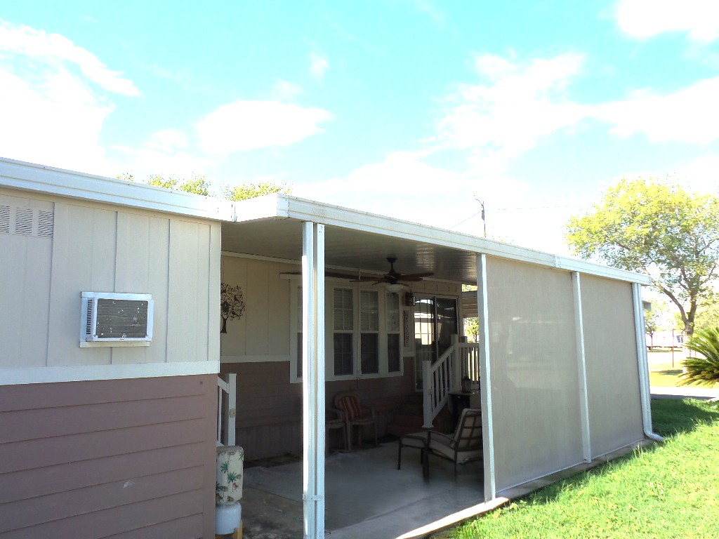 Athens 2009 12x33’ (396 sq ft) 1 bedroom, 1- bathroom Exquisite Park model, with a beautiful patio, plus carport & attached shed. Driving up to this park model you notice many extras! An extended dbl insulated carport with sturdy steel beams & patio with sun-screening for privacy. It includes all patio furniture, to enjoy the outdoors & entertaining. Trek steps/white railing take you up to the front sliding door entrance to the Livingroom. With textured walls, high ceilings & dormer (stained glass) & sun-screened windows, this has an abundance of natural light & welcome airiness. An electric fireplace & TV with a reclining loveseat, plus new flooring add comfort to the rich wood cabinetry in the adjoining galley kitchen. A gas stove & all appliances are convenient to the modern dinette within the bay window, overlooking the patio. Along the hallway is a pantry & added cabinets, plus the stackable W/D. The bathroom features a walk-in shower & extra cabinets. The bedroom is at the back of the home near the backdoor exit to the patio. The Q bed provides comfort with reading lites/bedside tables. A vanity area is included as well with extensive cabinets above/below & a triple mirrored closet which opens to a built-in dresser & tv as well. The 10x8’ shed includes more storage, with an A/C unit. This home has everything you could want & is energy efficient with direct MVEC service & low maintenance with a home warranty, updated water heater, maintained A/C unit, newer shingled roof & gutters, hurricane shutters, a mirrored patio door, sun screened windows, Trex deck/steps & more! Please call Rita at 712-281-9862 for a tour of this home & a friendly, fun activity filled resort community!