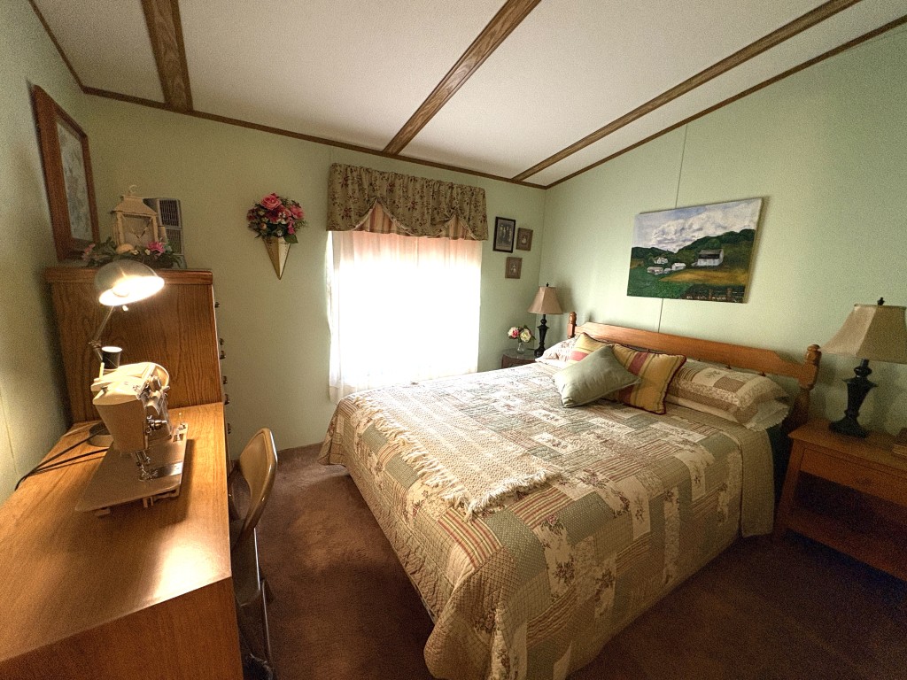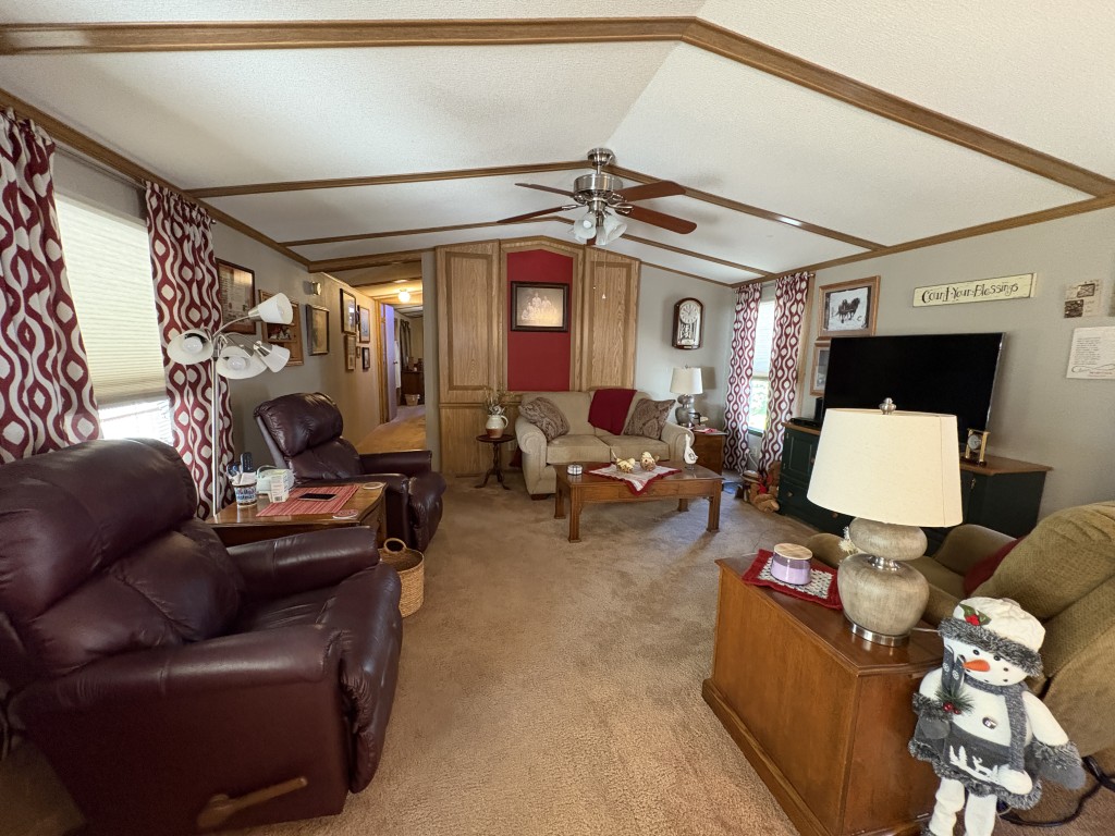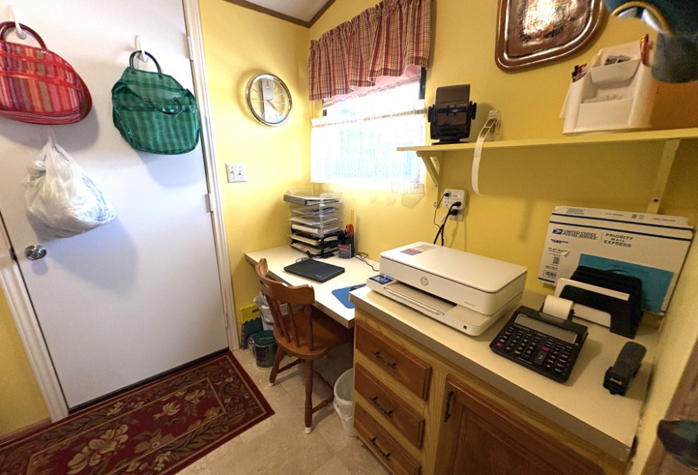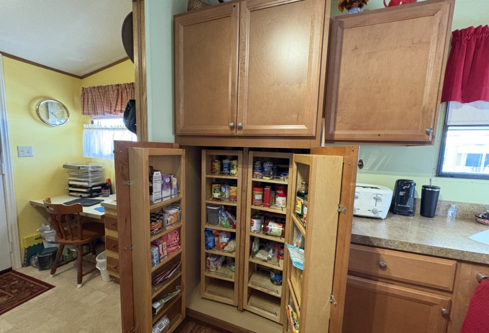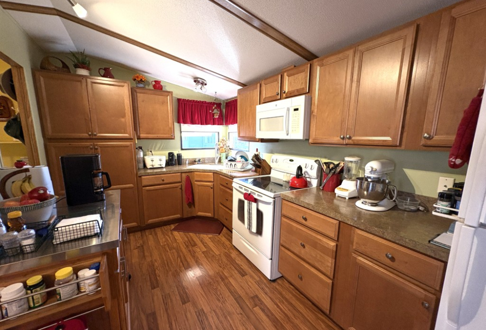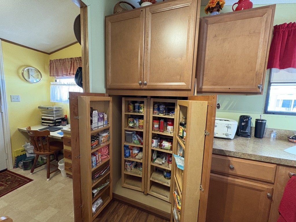Nestled on a quiet dead-end street, this well-maintained 16x68 Palm Harbor home (1,054 QFT) offers comfort, convenience, and thoughtful upgrades throughout. From the moment you step inside, you'll appreciate the open, airy layout and the pride in ownership that shines in every detail. The front kitchen is a true standout, featuring custom self-closing cabinets and drawers, a unique pantry, and a seamless flow into the dining and living areas--perfect for everyday living and hosting friends. Just off the kitchen, a tucked away laundry room provides easy access to the back door while keeping household tasks discreetly out of sight. The guest bedroom offers comfortable accommodations with close access to a full guest bath complete with a walk-in-shower. The spacious Master Suite is a retreat of its own, boasting two generous walk-in-closets and a beautifully updated master bath featuring a walk-in-shower with decorative glass doors, double sinks, and an upgraded vanity. Outside you'll find one of the home's most versatile features: a large covered carport thoughtfully divided to create a spacious patio area ideal for relaxing or entertaining. An attached storage shed sits safely under the carport awning, offering extra room for tools, hobbies, or seasonal items. This home blends comfort, functionality, and charm--an inviting space ready for its next owner to enjoy the best of this friendly 55+ friendly community living.