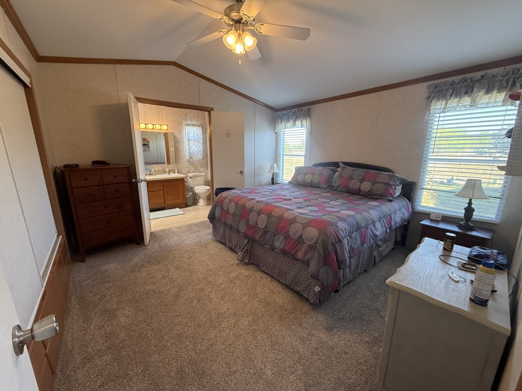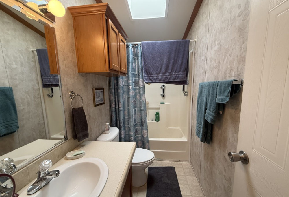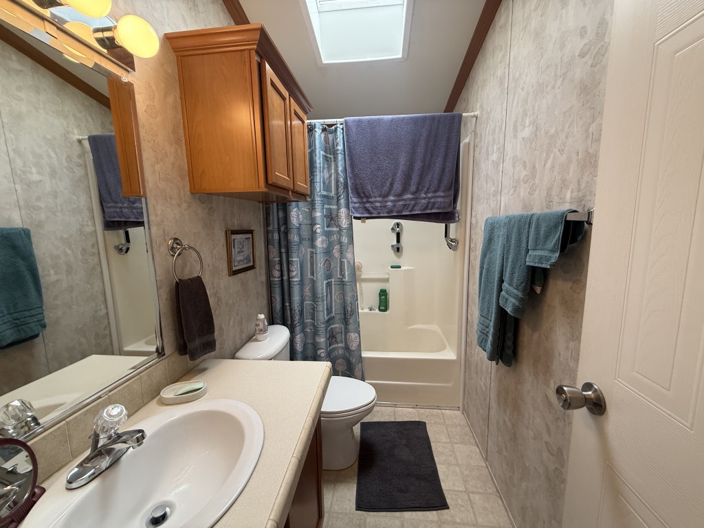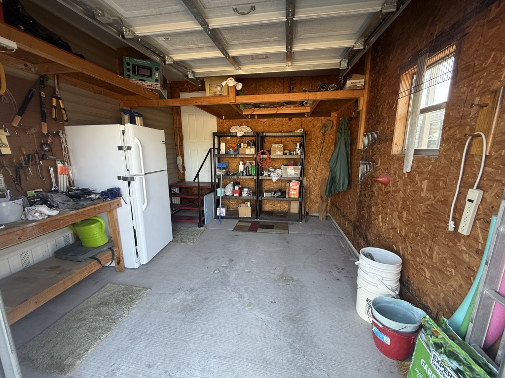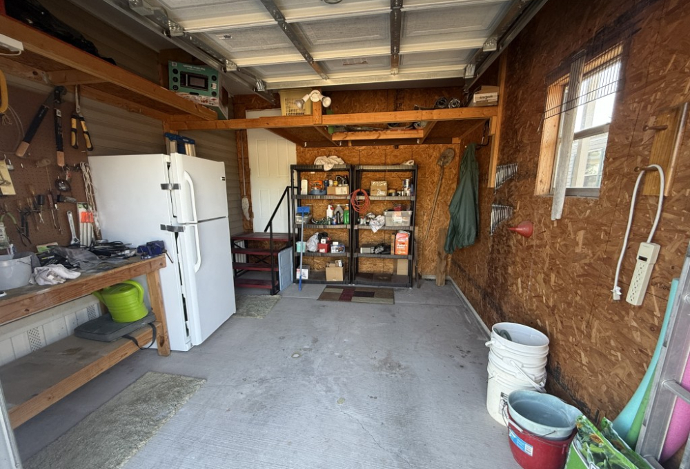 Both bathrooms include skylights, allowing for natural light and a bright, open feel. The garage is accessible through the Texas room or from the rear of the home and includes additional counters, a refrigerator, and attic storage space, making it ideal for extra storage or a workshop area.