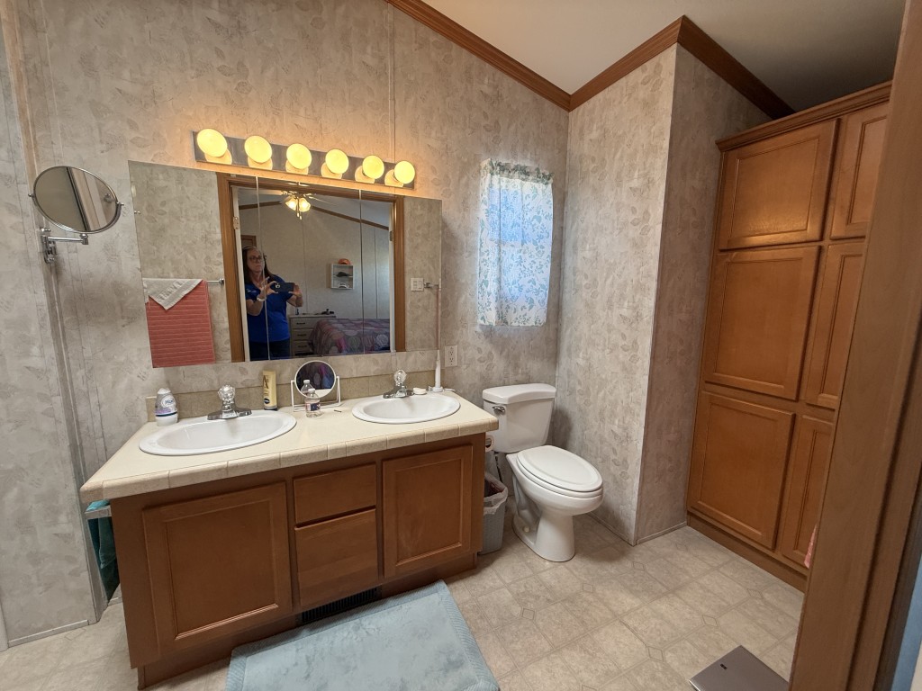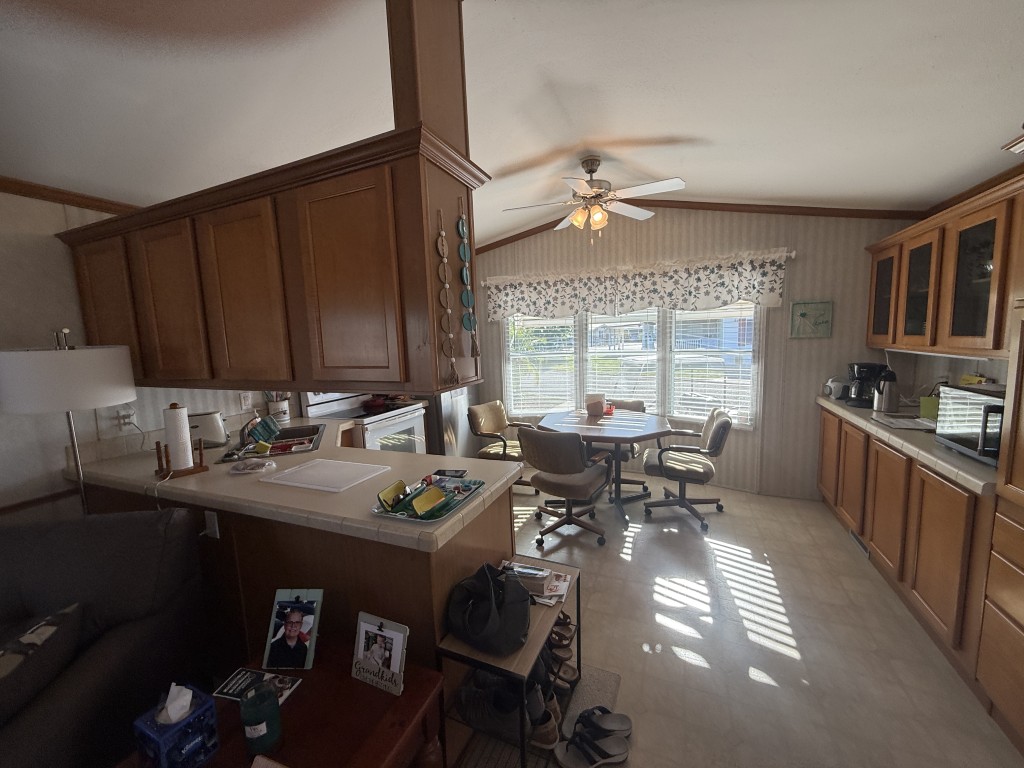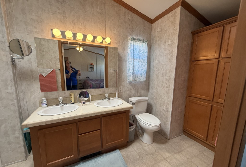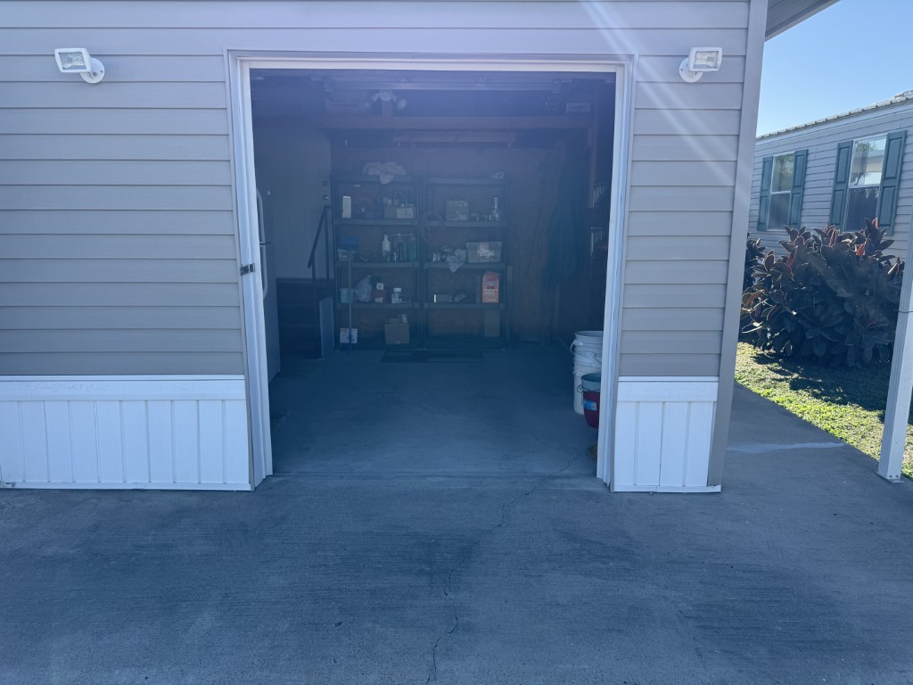 Both bathrooms include skylights, allowing for natural light and a bright, open feel. The garage is accessible through the Texas room or from the rear of the home and includes additional counters, a refrigerator, and attic storage space, making it ideal for extra storage or a workshop area.