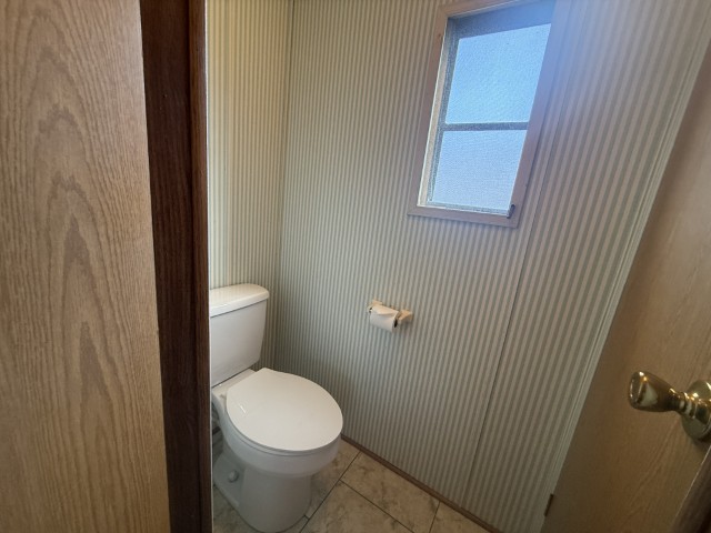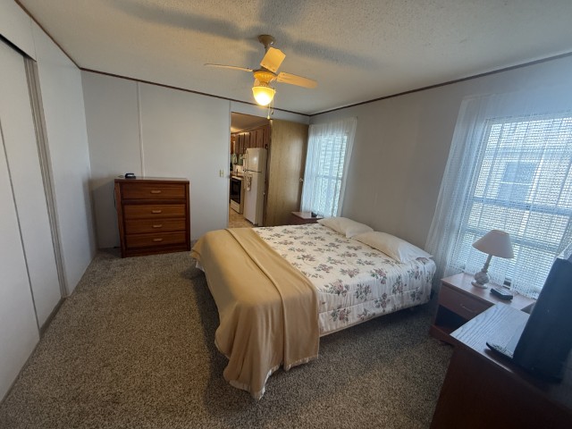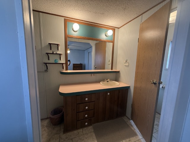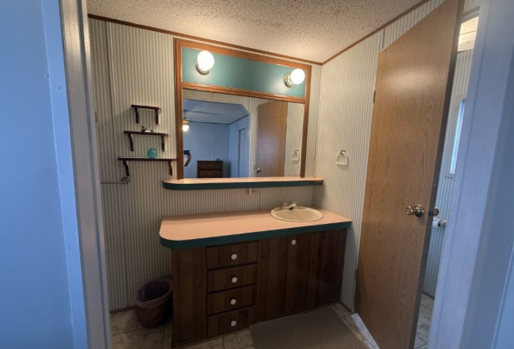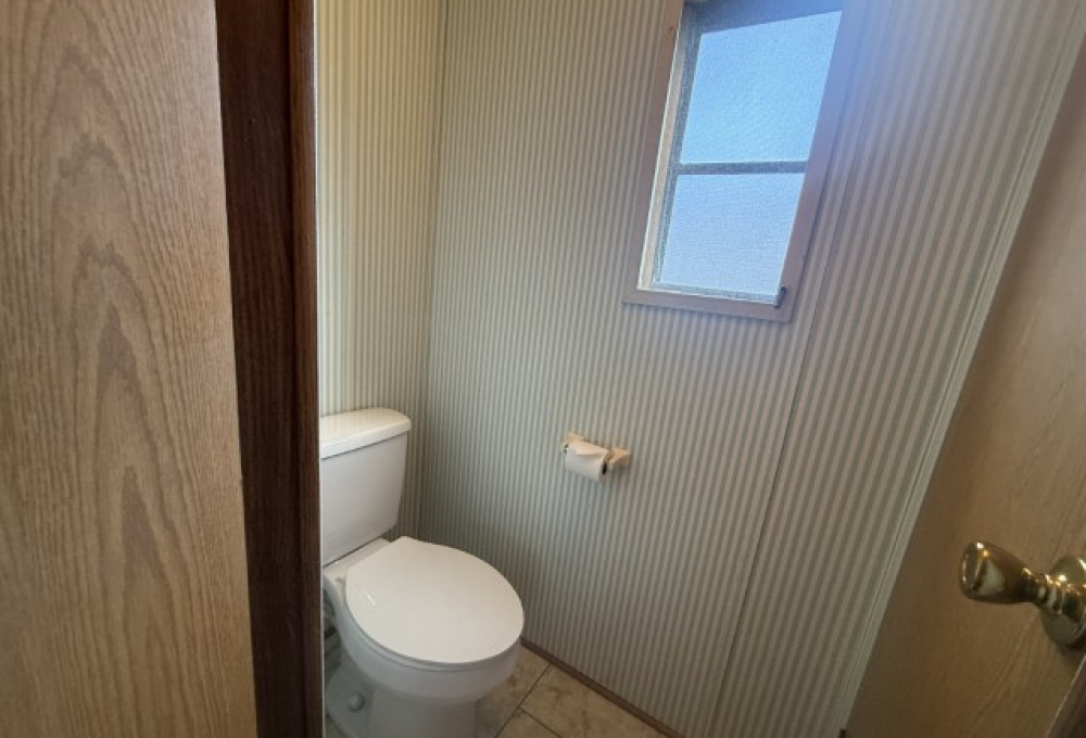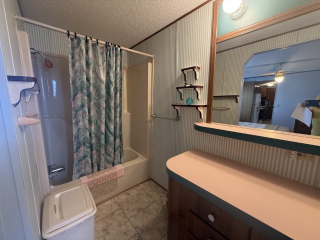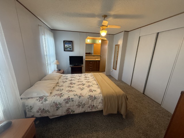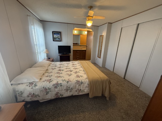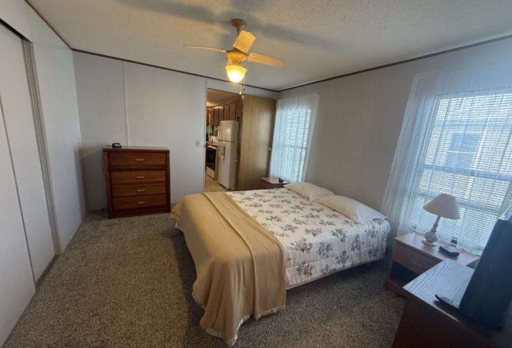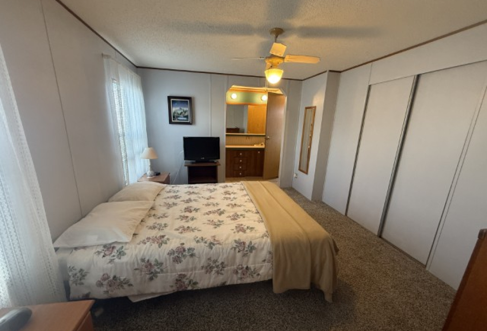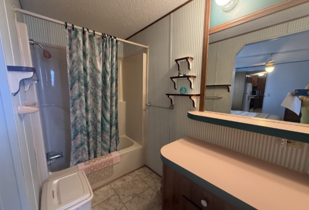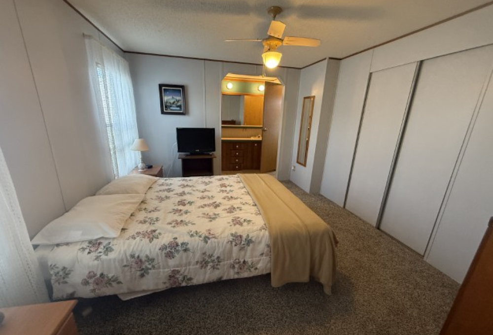 The main section of the home offers a well-maintained, fully furnished living space. The master bedroom is generously sized and features an en-suite bathroom, including a tub/shower combo, a single sink vanity, and a separate enclosed space for the toilet. The second bedroom, located at the front of the home, benefits from abundant natural light and ample room. Adjacent to this bedroom is the guest bathroom, which is equipped with a tub/shower combo, single sink vanity, and toilet.