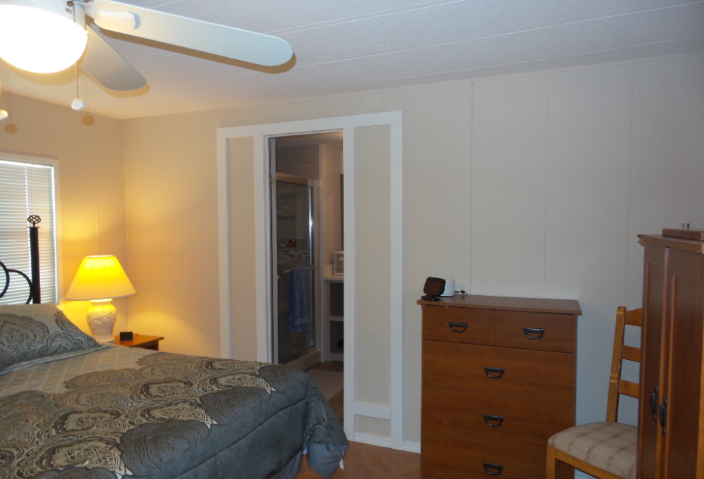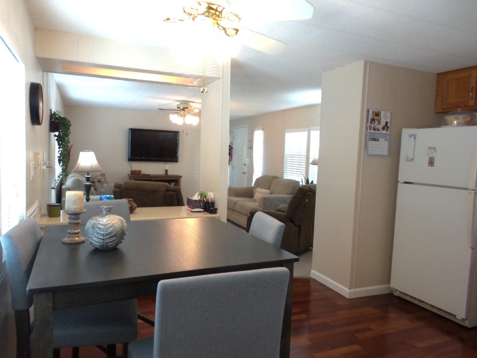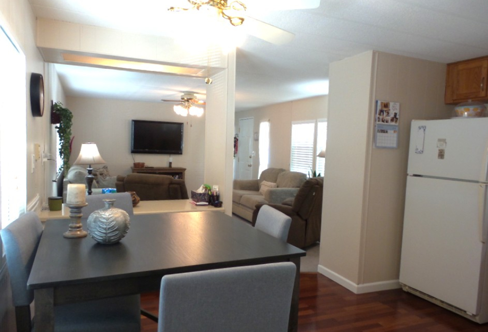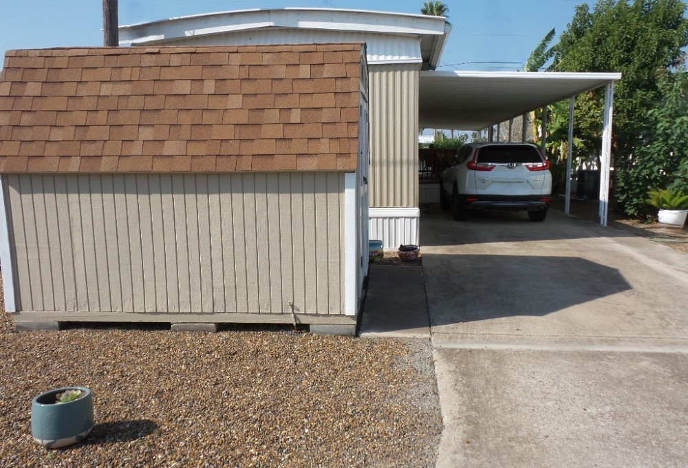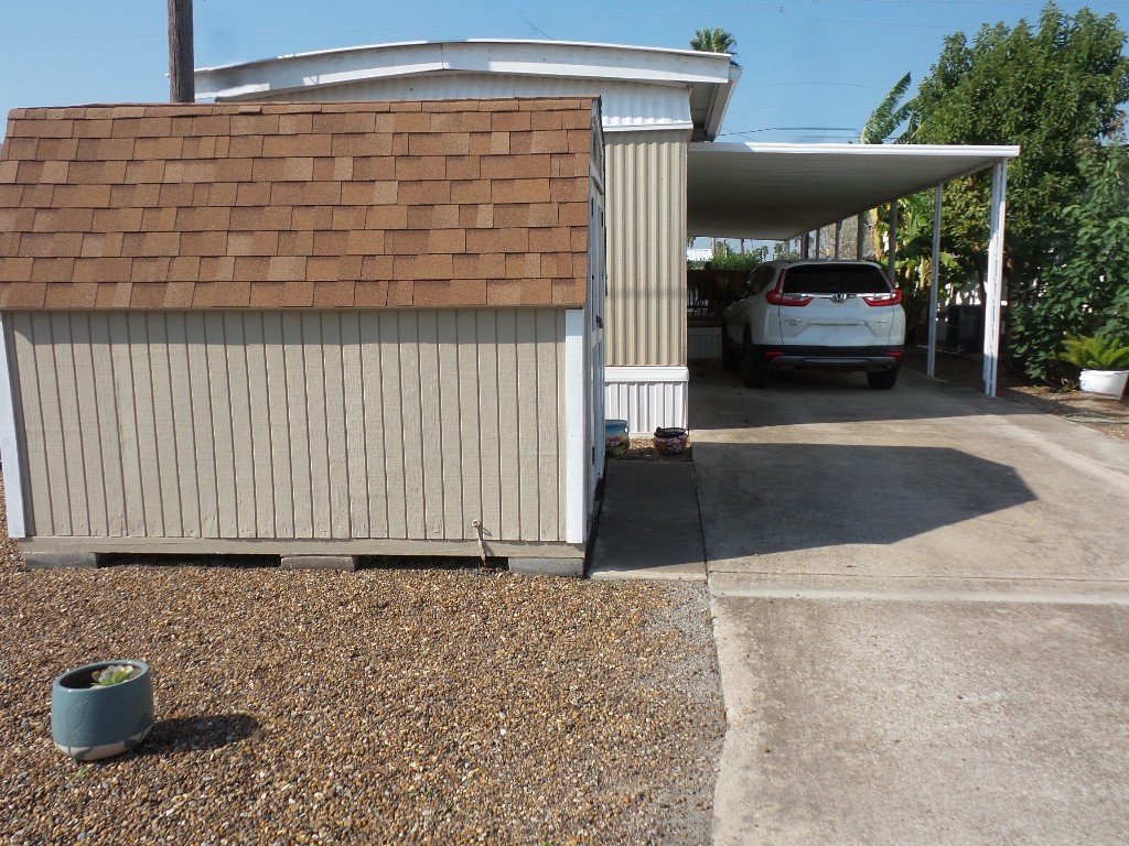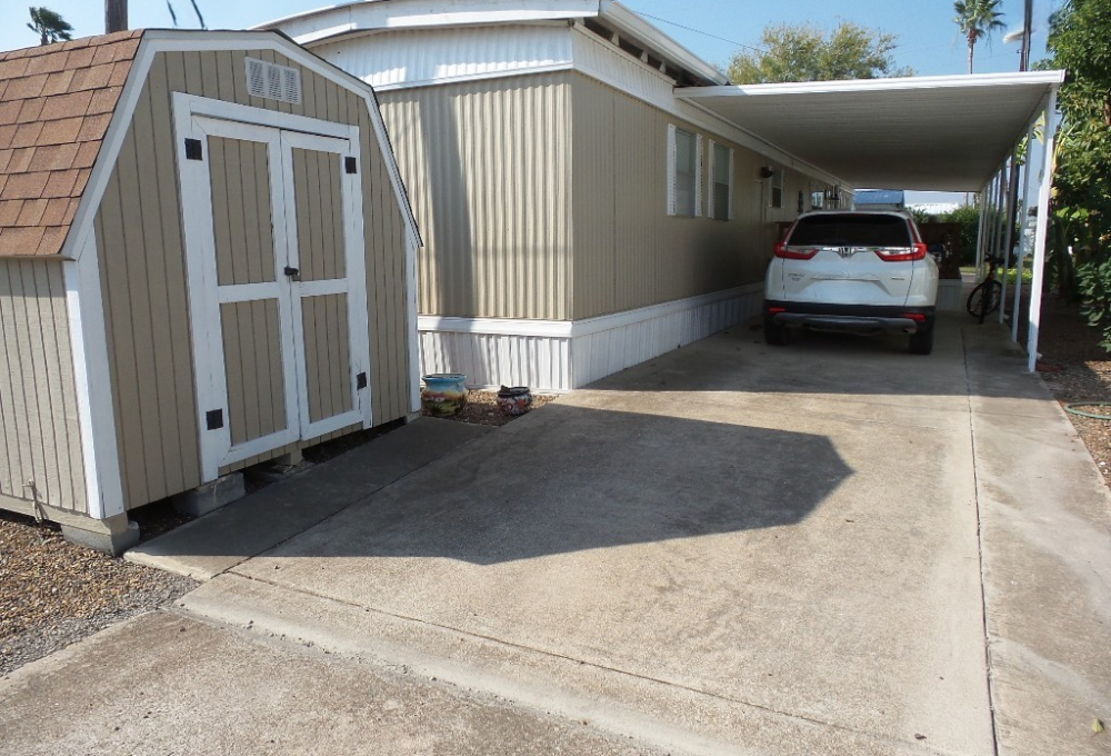 Deerfield 14x72’ (1008 sq ft) 2-bedroom, 2 bathroom manufactured home with great deck. A small parking or covered patio is in front of the deck with another & the carport behind the deck, providing auto parking at the back. Plus, a storage shed! An extensive deck welcomes guests to sit & enjoy the TX weather. An entry door opens to the Livingroom with a sofa, loveseat & recliners facing the wall mounted TV. Dividing counters separate the Kitchen/Dining area with display & storage areas. Corean counters & ample cabinets surround the newer gas range/overhead microwave, fridge & a pantry. The hi-top table is enhanced with cherry wood LVP flooring in this remodeled kitchen. Freshly painted walls continue throughout, as you go along the hallway to the Maytag W/D adjacent to the back door. Further is the Master bedroom with a walk-in closet K bed & en suite bathroom completely renovated with new vanity, storage cabinets, flooring & a luxury tiled walk-in shower/seat! At the front of the home is the guest room with Dbl bed, dresser & closets presently with an art table. The corner front bathroom is accessible to the deck, guests & Lvgrm. With newer updated appliances, renovations, painted & fresh coated roof, with a rock yard this home is low maintenance, spacious & appealing! Call Rita at 712-281-9862 for tour appt!