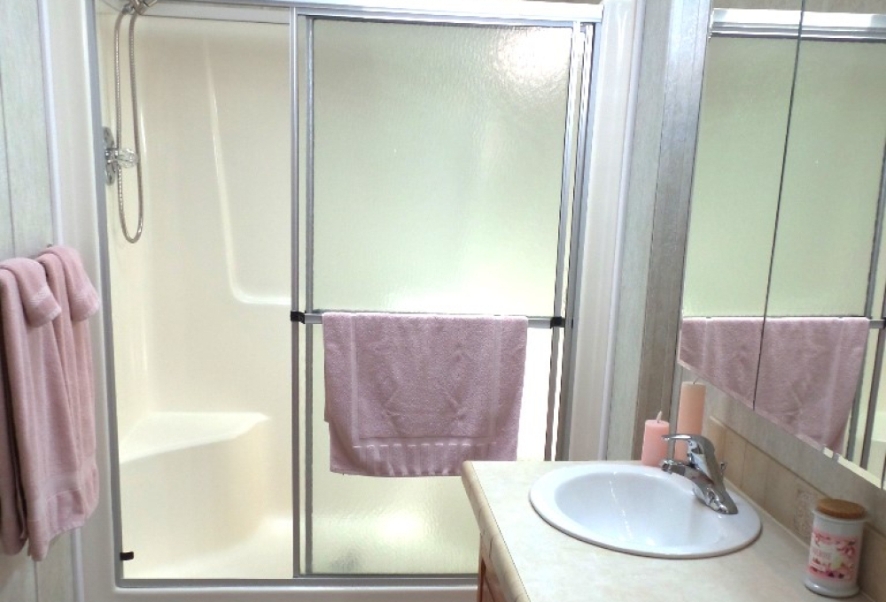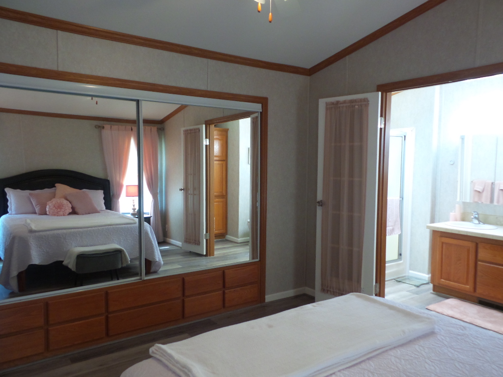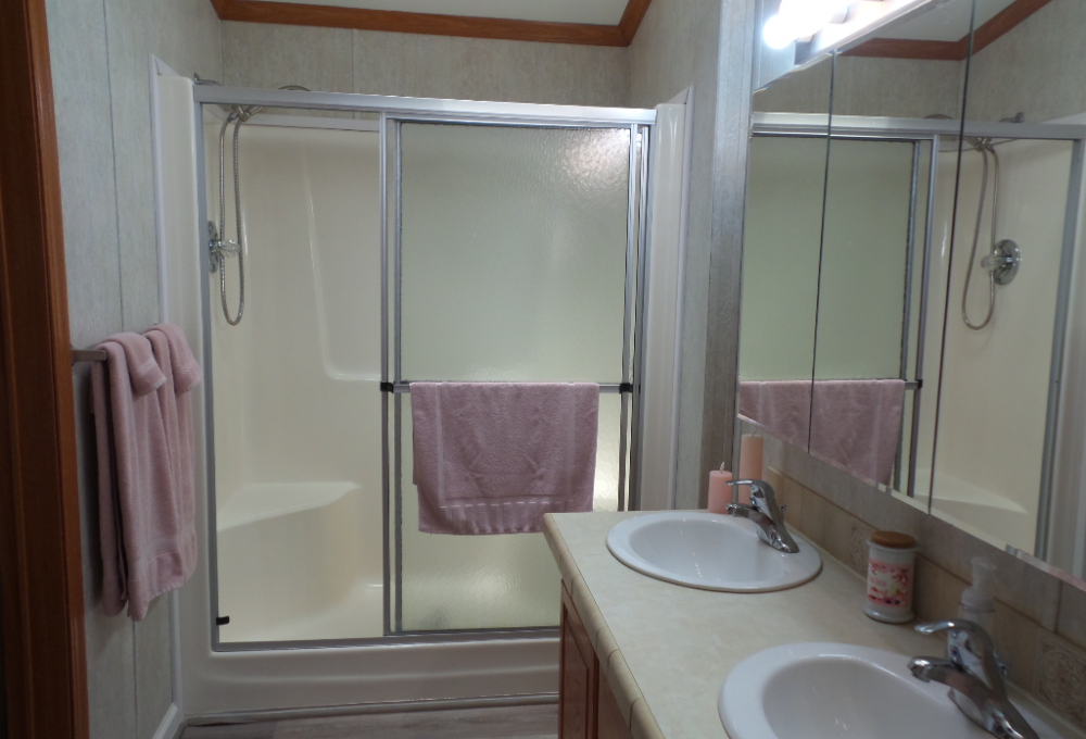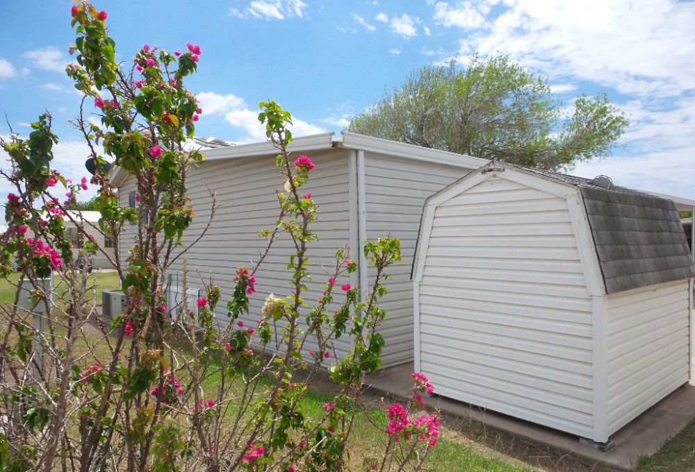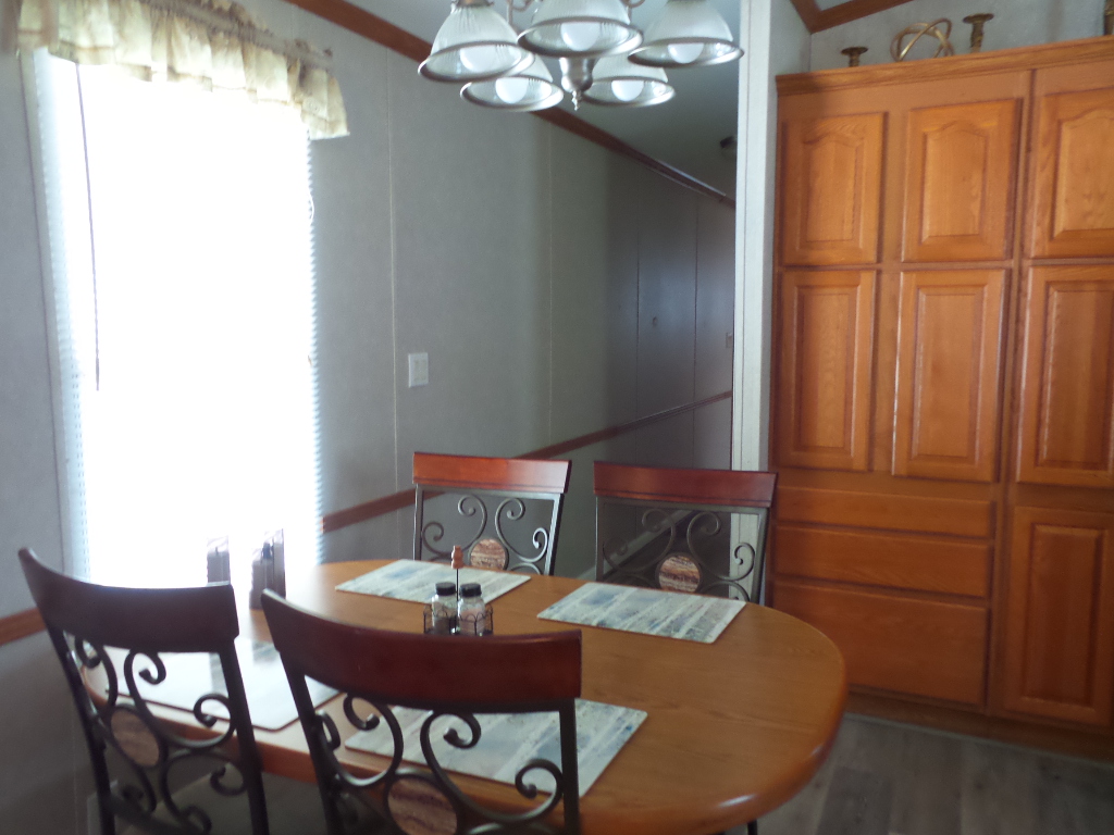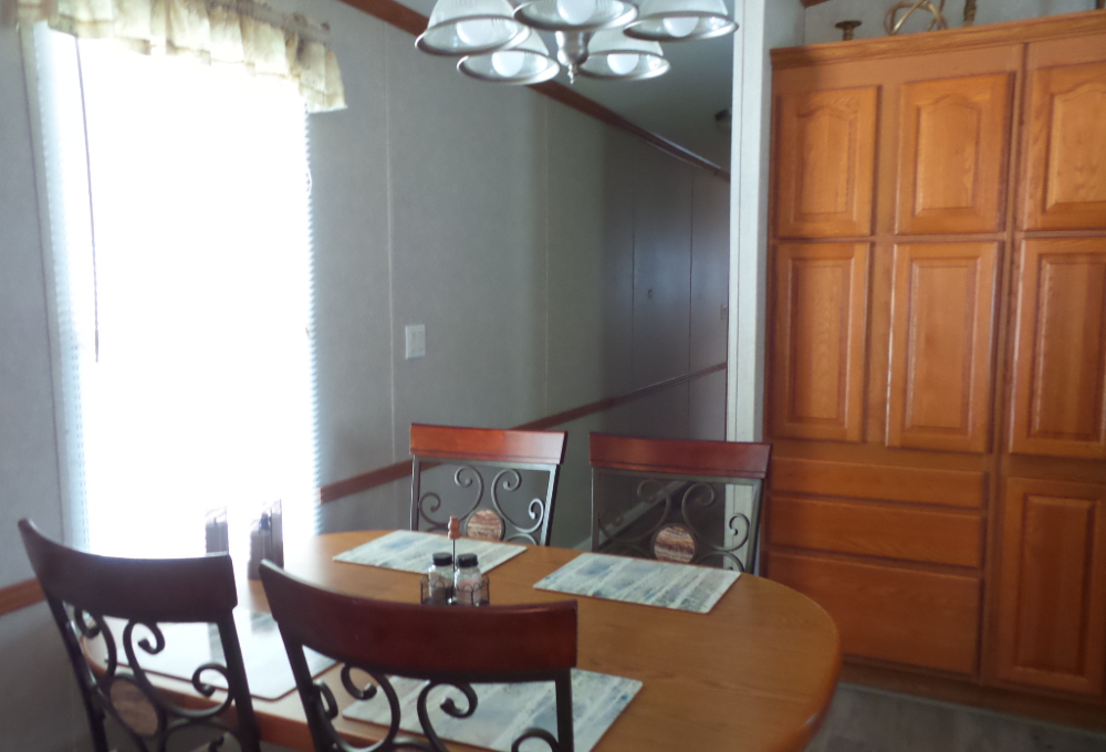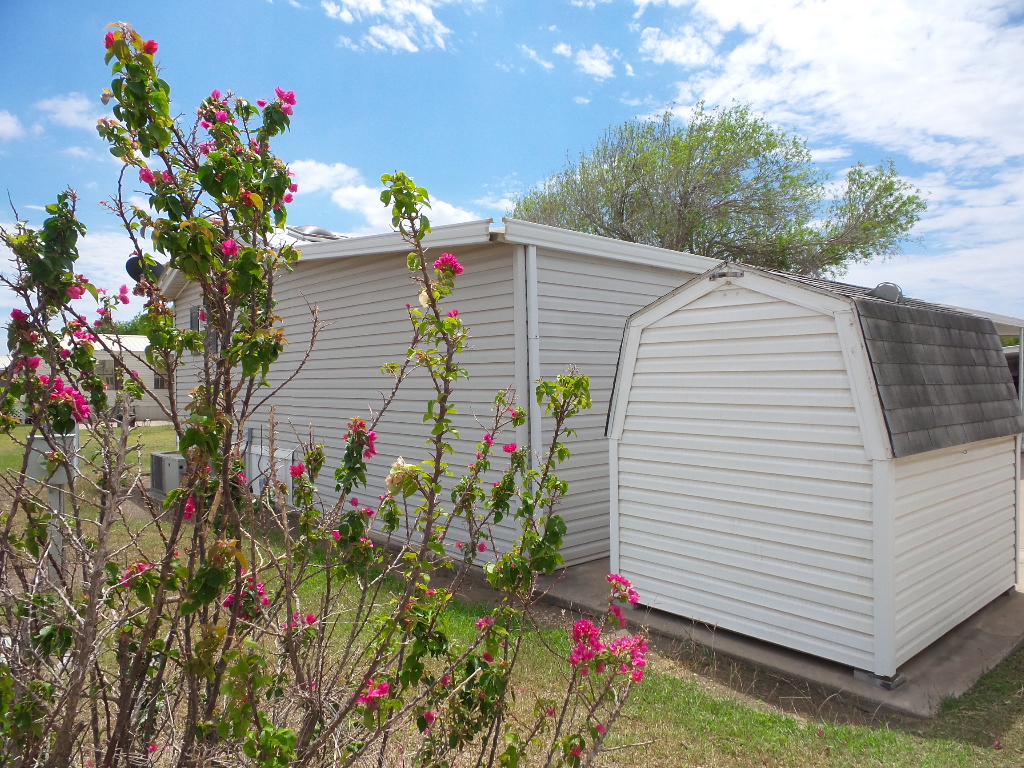 Skyline 2001 18x68’ 2-3 bedroom, 2 bathroom Manufactured home 1224 sq ft + Tx Room adds 440 more for a total of 1664 sq ft of Living space! Driving up to this home you notice a lengthy carport with a raised wood deck in front of the Texas room. Entering the home via a sliding patio door into the Living room you’ll find leather furniture with 2 recliners matching the sofa & a side chair facing the TV. A dividing bar with stools separates the dine in kitchen with the table & rolling chairs looking over the deck. A built-in hutch & island provides more storage. The newer fridge & range, plus a dishwasher & microwave provide efficiency in this vast kitchen with extensive countertops & cabinetry. Along the hall to the back of the home, to the L is W/D laundry & entrance to the Texas room where desks & craft tables are placed with a reading chair & exit to the deck. A large storage room awaits within this room. Straight back from the kitchen is the furnished Master bedroom with a walk-in closet, dressers, TV & King size bed, plus the en suite bathroom featuring a walk-in shower long vanity & extensive storage. At the front of the home is a guest room with a separate additional A/C unit for extra cool sleeping. The main bathroom has a tub/shower adjacent to the guest room & near the Livingroom. Outside at the back of the home is the storage shed. This home is energy efficient with thermal windows, a metal roof, updated appliances including a new W/H & more. A golf cart is available but sold separately. Call Rita for an appointment to see 712-281-9862!