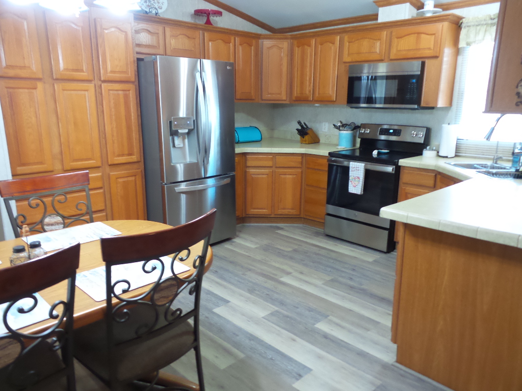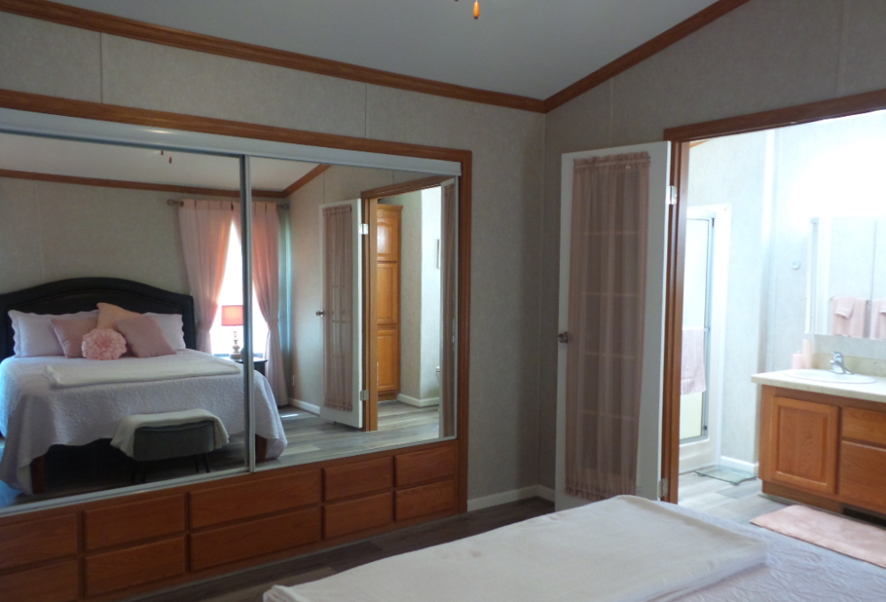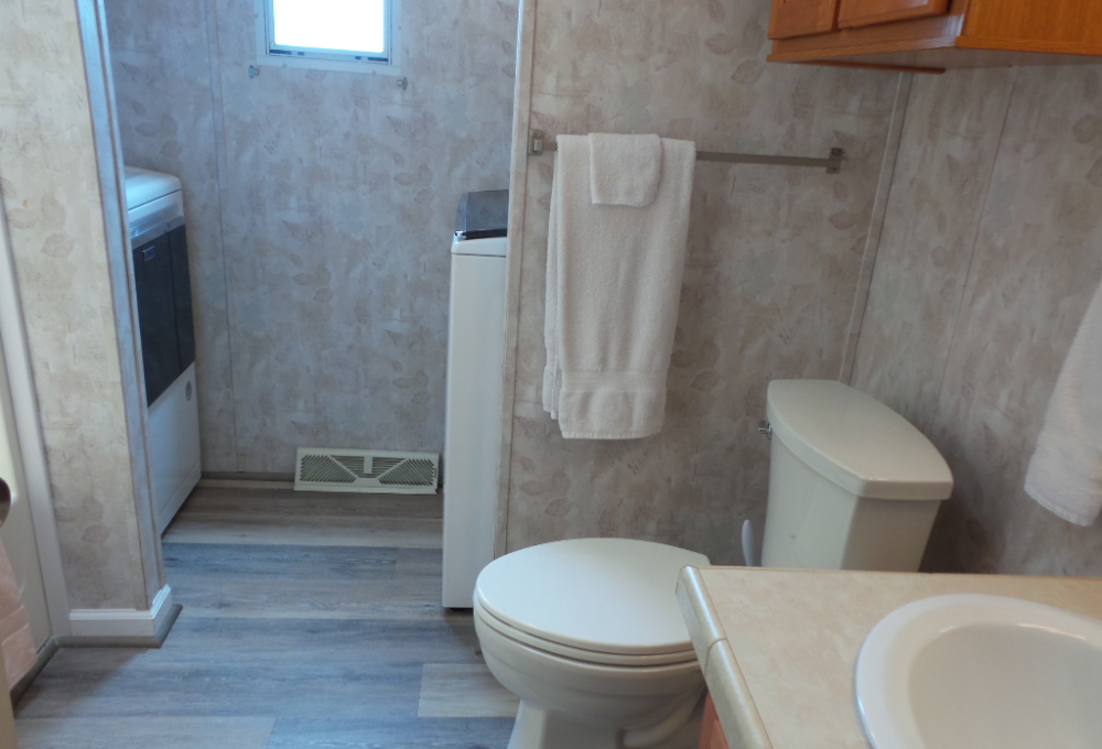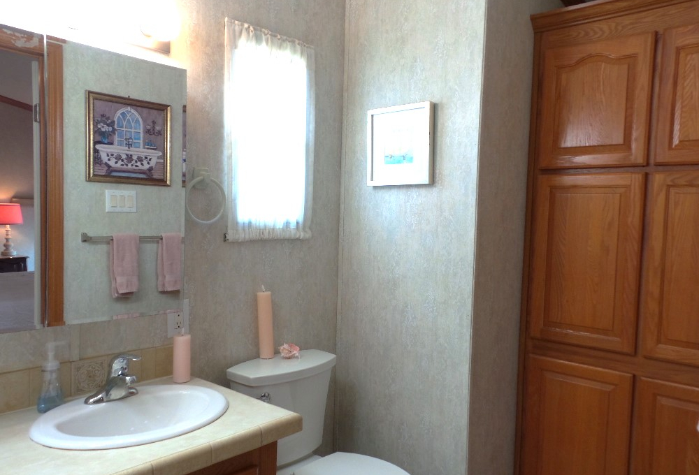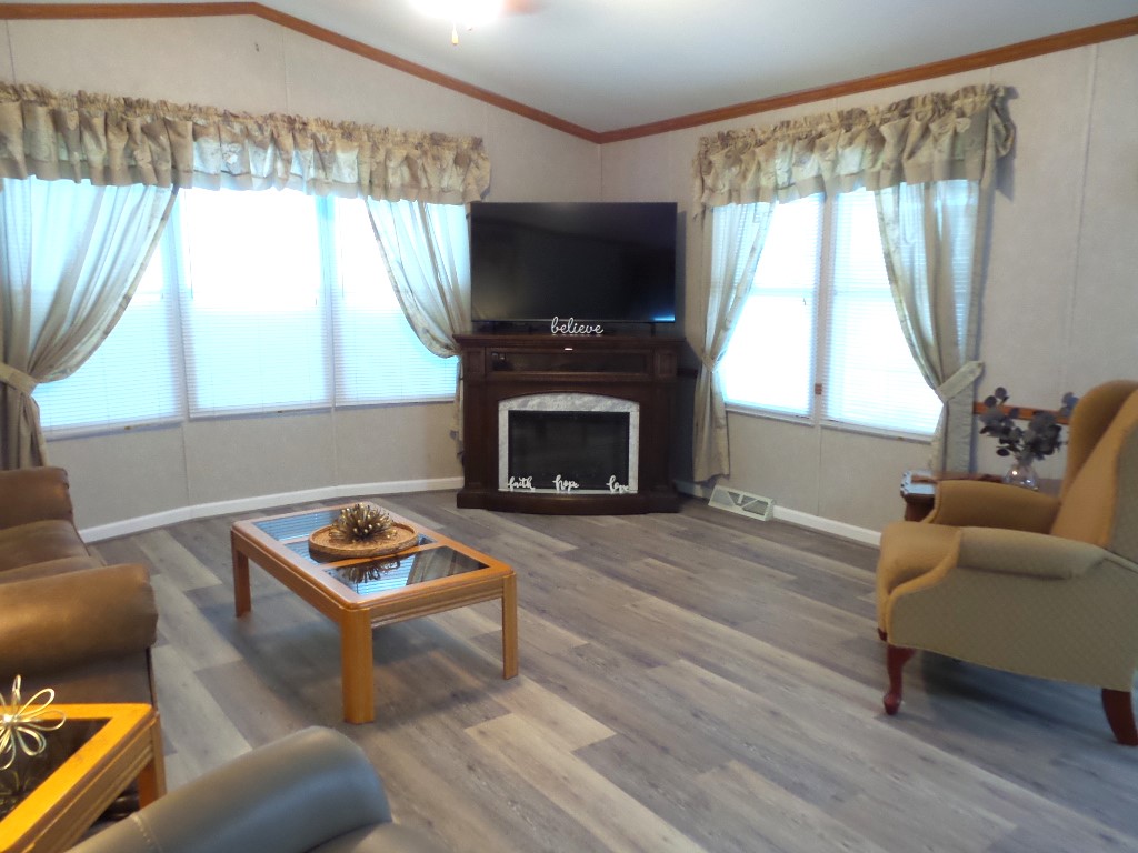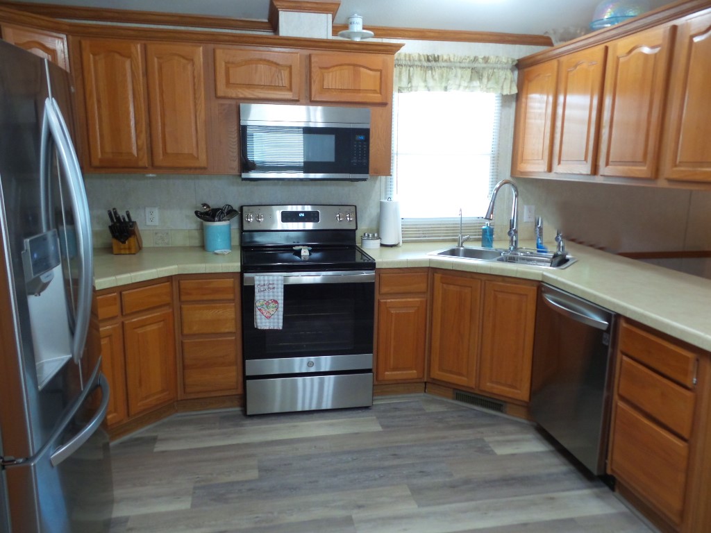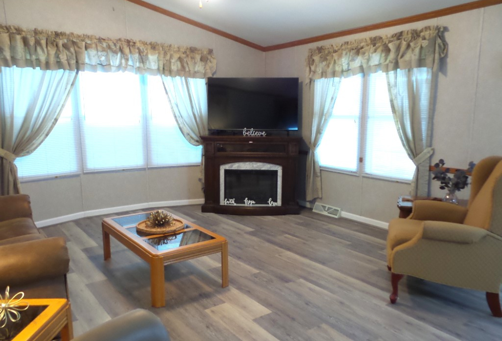 Skyline 2001 18x68’ 2-3 bedroom, 2 bathroom Manufactured home 1224 sq ft + Tx Room adds 440 more for a total of 1664 sq ft of Living space! Driving up to this home you notice a lengthy carport with a raised wood deck in front of the Texas room. Entering the home via a sliding patio door into the Living room you’ll find leather furniture with 2 recliners matching the sofa & a side chair facing the TV. A dividing bar with stools separates the dine in kitchen with the table & rolling chairs looking over the deck. A built-in hutch & island provides more storage. The newer fridge & range, plus a dishwasher & microwave provide efficiency in this vast kitchen with extensive countertops & cabinetry. Along the hall to the back of the home, to the L is W/D laundry & entrance to the Texas room where desks & craft tables are placed with a reading chair & exit to the deck. A large storage room awaits within this room. Straight back from the kitchen is the furnished Master bedroom with a walk-in closet, dressers, TV & King size bed, plus the en suite bathroom featuring a walk-in shower long vanity & extensive storage. At the front of the home is a guest room with a separate additional A/C unit for extra cool sleeping. The main bathroom has a tub/shower adjacent to the guest room & near the Livingroom. Outside at the back of the home is the storage shed. This home is energy efficient with thermal windows, a metal roof, updated appliances including a new W/H & more. A golf cart is available but sold separately. Call Rita for an appointment to see 712-281-9862!