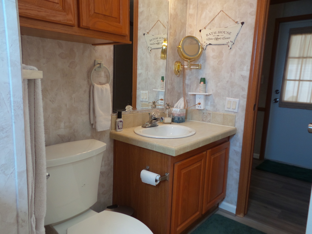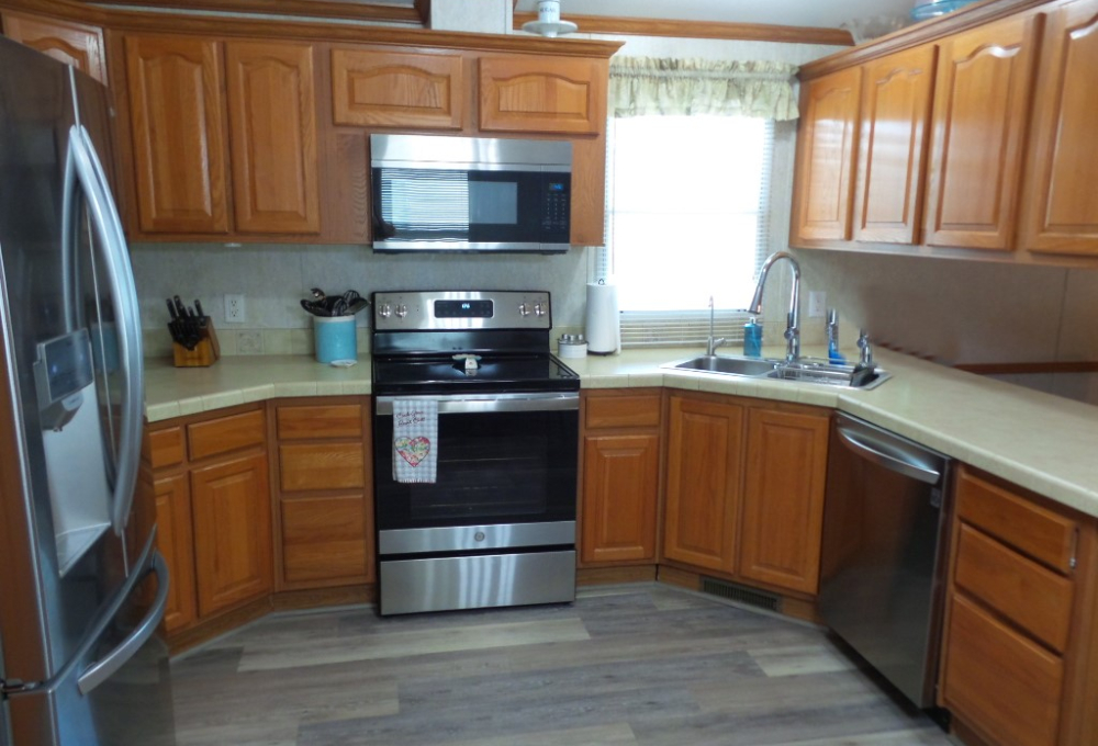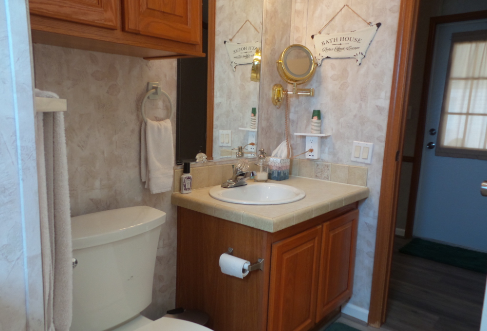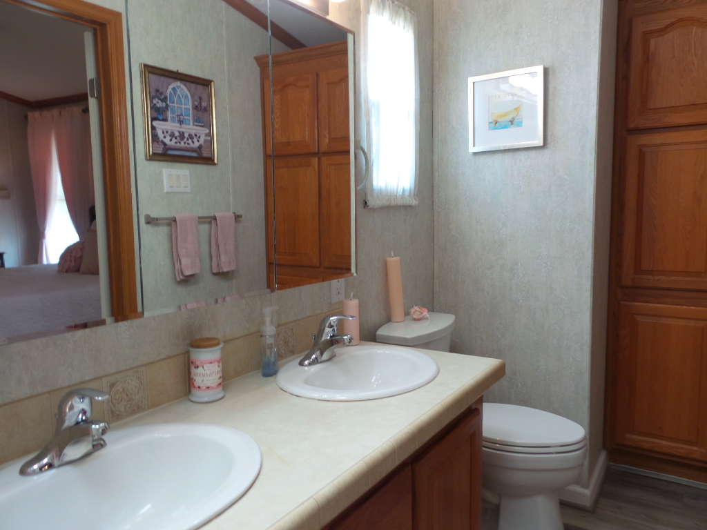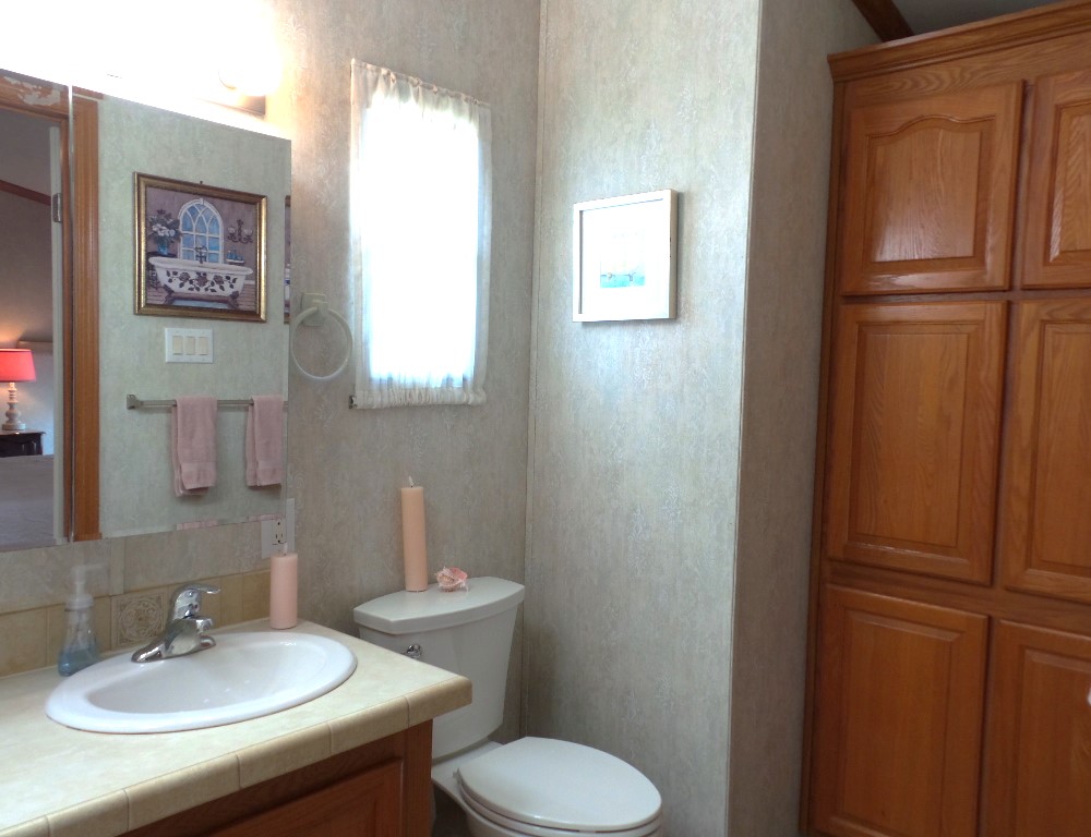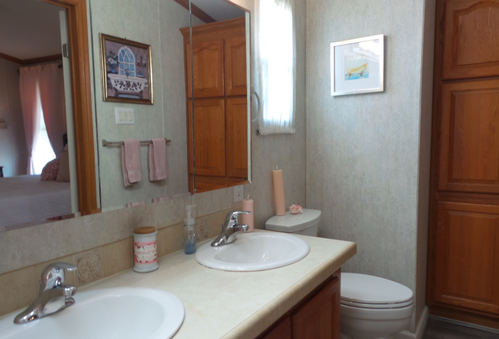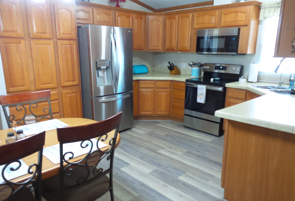 Skyline 2001 18x68’ 2-3 bedroom, 2 bathroom Manufactured home 1224 sq ft + Tx Room adds 440 more for a total of 1664 sq ft of Living space! Driving up to this home you notice a lengthy carport with a raised wood deck in front of the Texas room. Entering the home via a sliding patio door into the Living room you’ll find leather furniture with 2 recliners matching the sofa & a side chair facing the TV. A dividing bar with stools separates the dine in kitchen with the table & rolling chairs looking over the deck. A built-in hutch & island provides more storage. The newer fridge & range, plus a dishwasher & microwave provide efficiency in this vast kitchen with extensive countertops & cabinetry. Along the hall to the back of the home, to the L is W/D laundry & entrance to the Texas room where desks & craft tables are placed with a reading chair & exit to the deck. A large storage room awaits within this room. Straight back from the kitchen is the furnished Master bedroom with a walk-in closet, dressers, TV & King size bed, plus the en suite bathroom featuring a walk-in shower long vanity & extensive storage. At the front of the home is a guest room with a separate additional A/C unit for extra cool sleeping. The main bathroom has a tub/shower adjacent to the guest room & near the Livingroom. Outside at the back of the home is the storage shed. This home is energy efficient with thermal windows, a metal roof, updated appliances including a new W/H & more. A golf cart is available but sold separately. Call Rita for an appointment to see 712-281-9862!