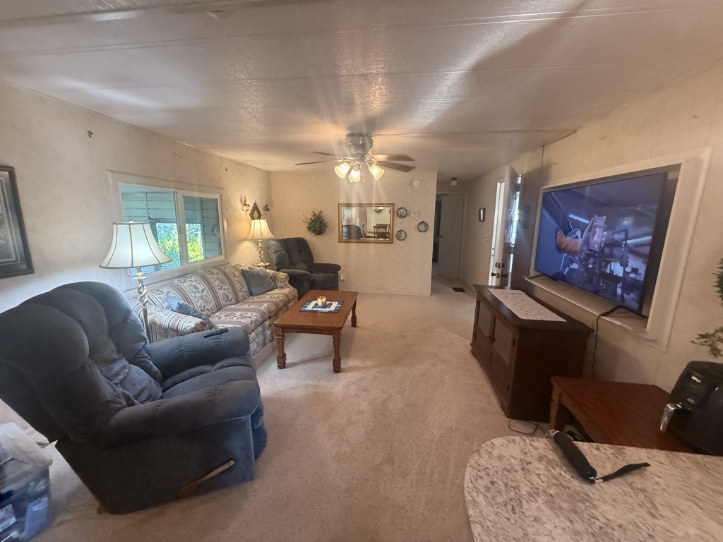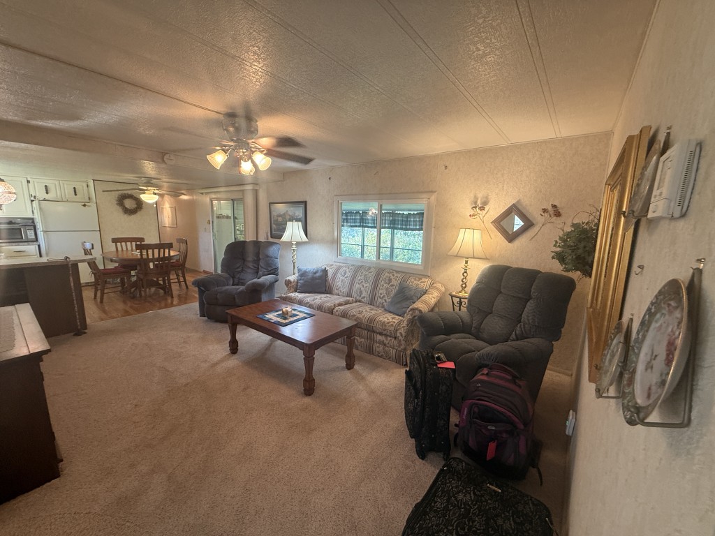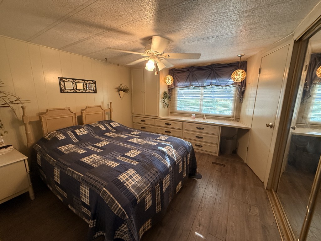 From the carport, access is provided to the 8 x 19 front Texas room, which features abundant natural light and serves as an entry point to the home. This Marlette manufactured home measures 14 x 74, providing 1,036 square feet of living space. The guest room is located at the front of the house and includes an en-suite bathroom with a walk-in shower, single-sink vanity, and toilet.