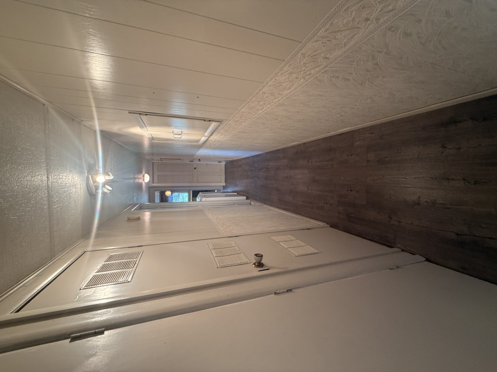 Down the hallway is the second of three bedrooms, suitable for use as an office or craft room. The laundry area is conveniently located in the hallway, equipped with overhead cupboards. The main bathroom follows, complete with a walk-in shower, toilet, and single-sink vanity. At the end of the home is the primary bedroom, which offers generous space with built-in drawers and closet areas.