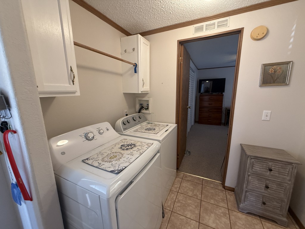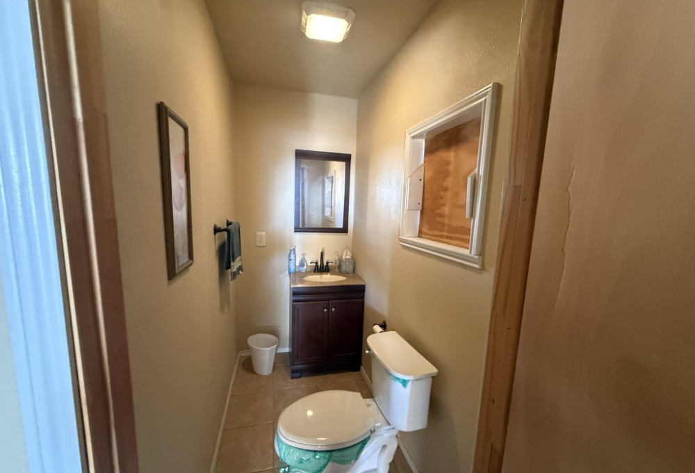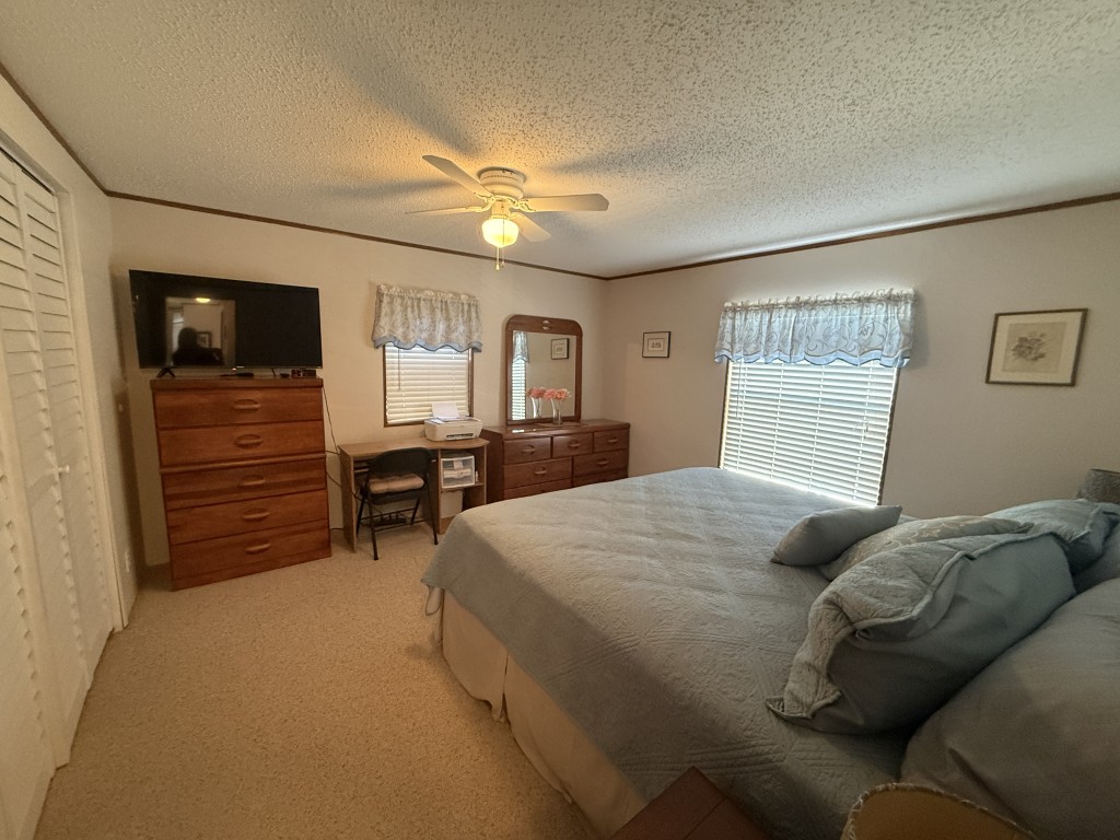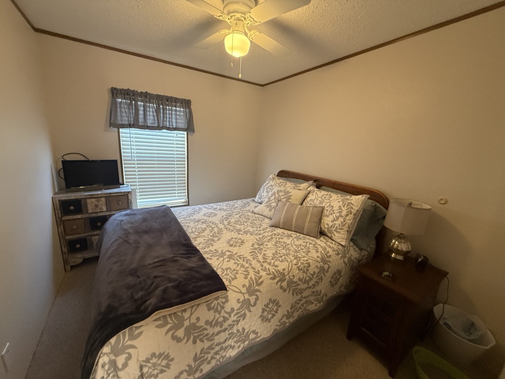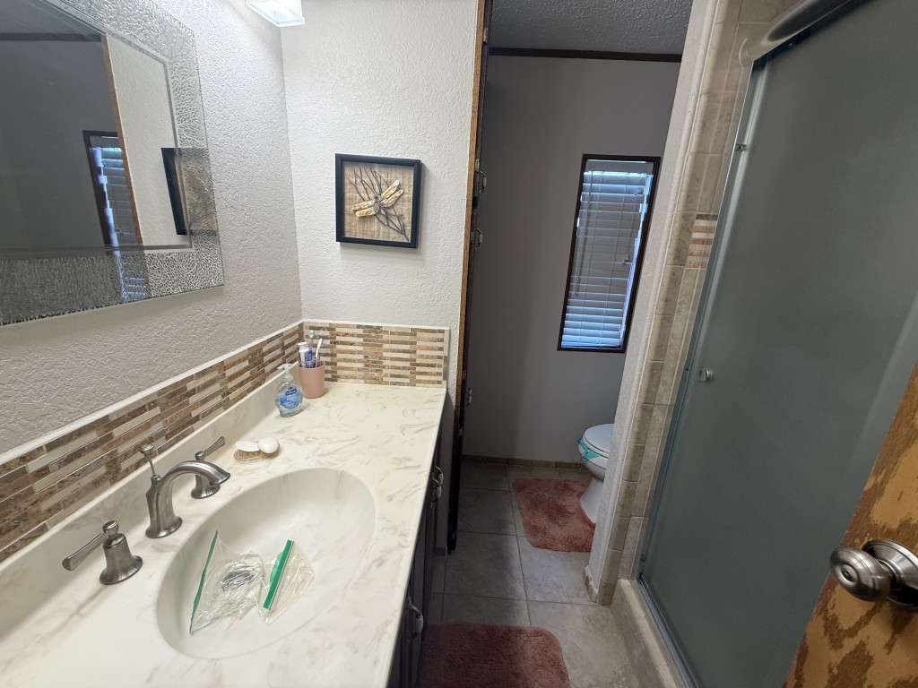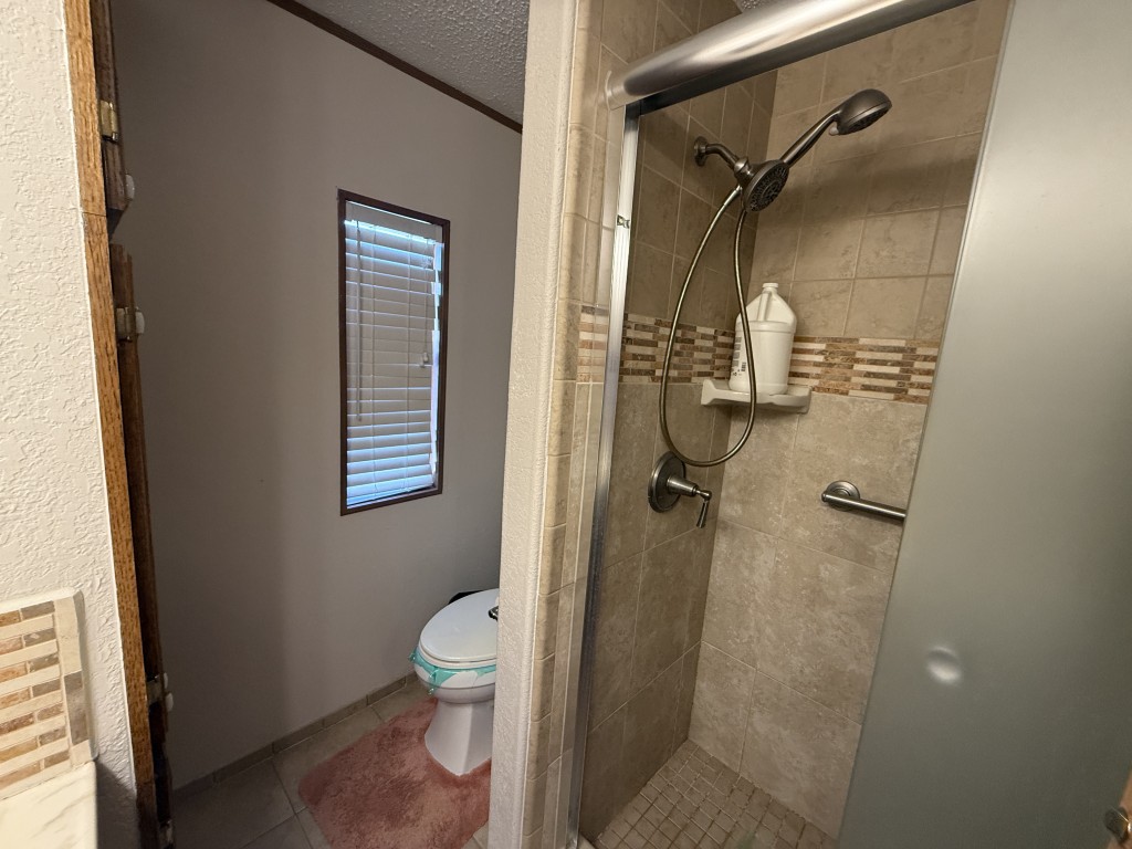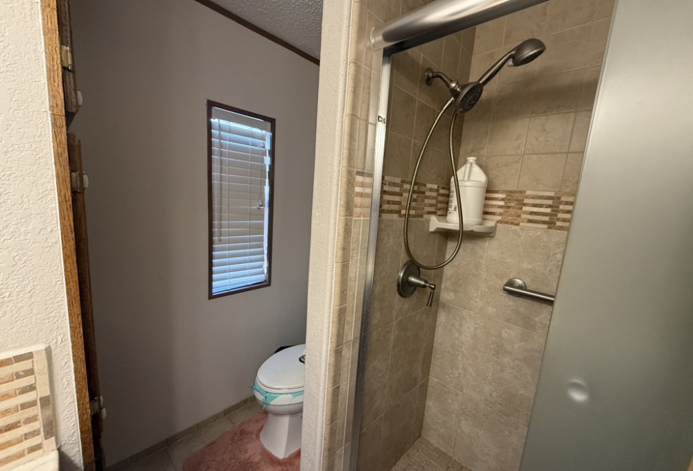 Down the hallway, you’ll find the guest bedroom, followed by the updated bathroom, which includes a single‑sink vanity, toilet, and a tiled walk‑in shower. The bathroom was remodeled in 2016. The spacious primary bedroom is located at the rear of the home and offers ample closet space.