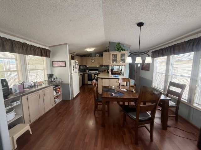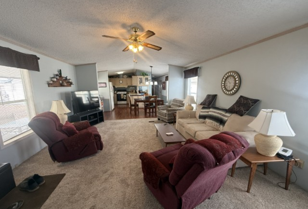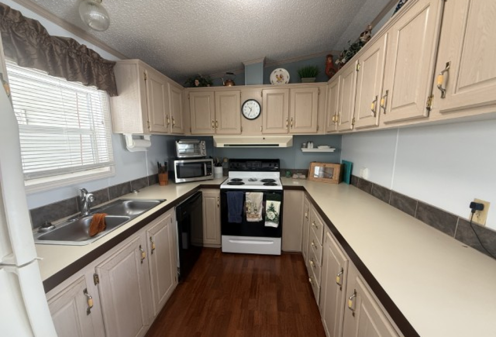Step inside and you’re welcomed into an open concept living, dining, and kitchen area. The living room is very large, bright, and fully furnished, creating a cheerful and comfortable atmosphere. Just past the living area is a built in buffet, providing storage and serving space, and directly across is the dining area. To the left sits a practical galley style kitchen with plenty of cupboards and counter space for all your cooking needs.