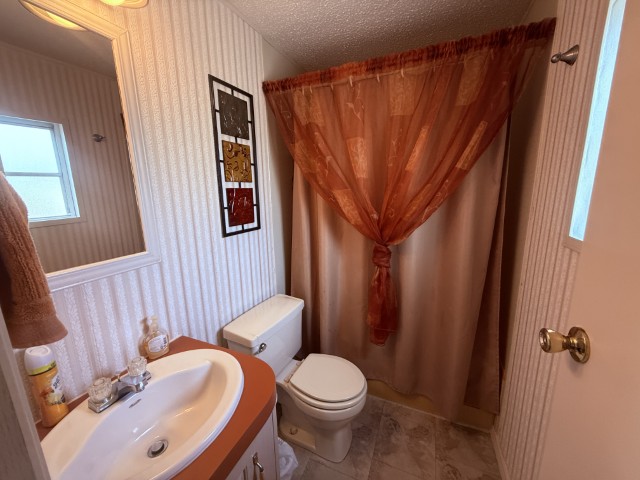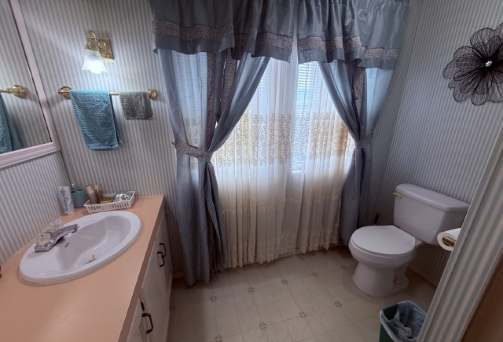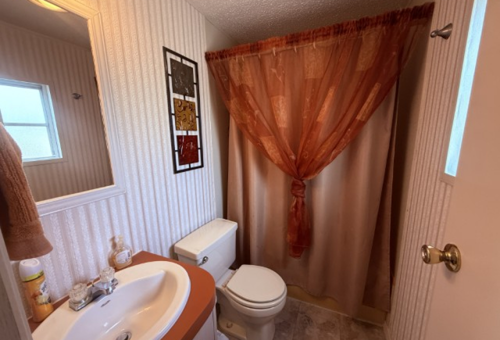 Down the hallway, you’ll find a convenient laundry room, followed by a cozy guest bathroom equipped with a single vanity, tub/shower combo, and toilet. The guest bedroom, located at the rear of the home, offers privacy and peacefulness, perfect for visiting friends or family.
