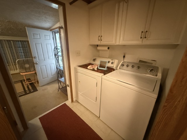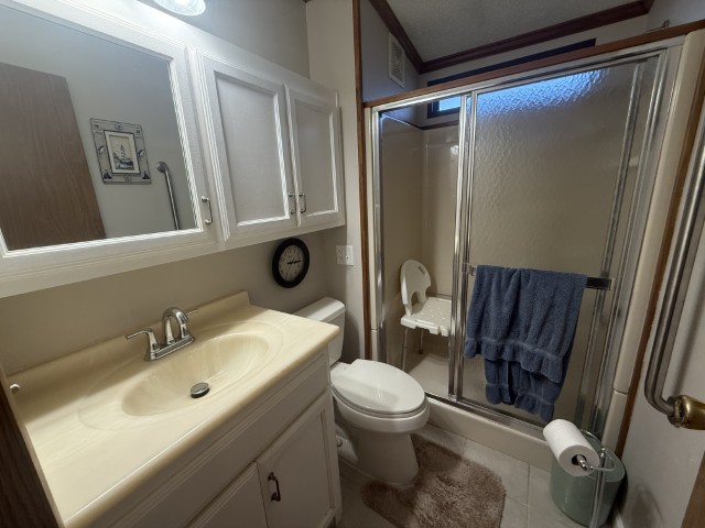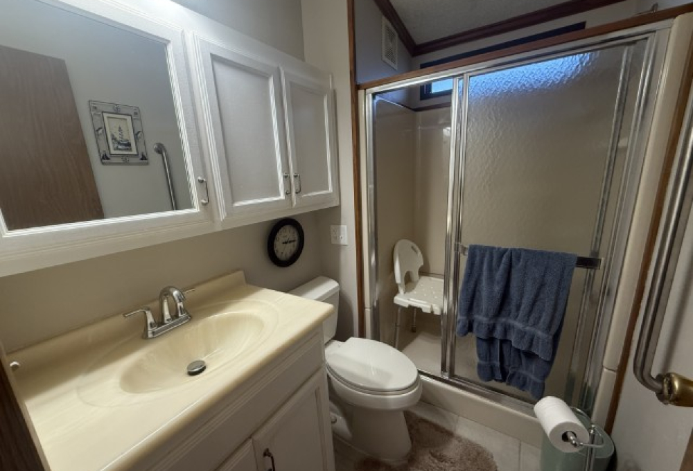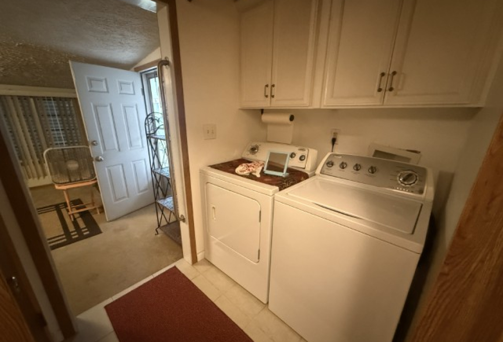 Down the hall, you'll find a guest bedroom and a guest bath featuring a walk‑in shower, single‑sink vanity, and toilet. The laundry room, complete with a washer and dryer, is conveniently located across the hall. The master bedroom sits at the rear of the home and includes an ensuite bathroom with a tub/shower combo and single‑sink vanity.