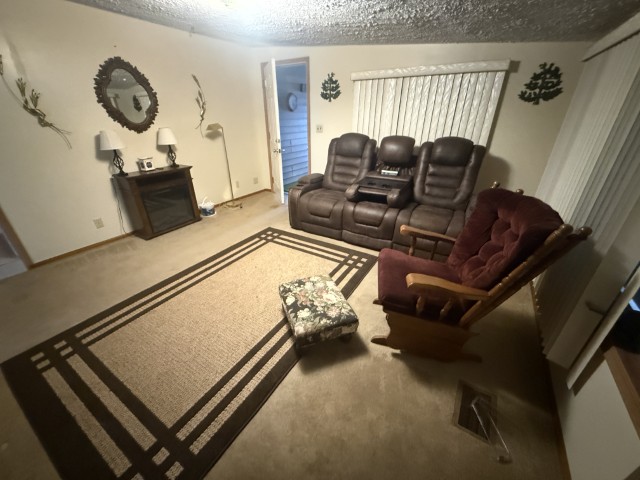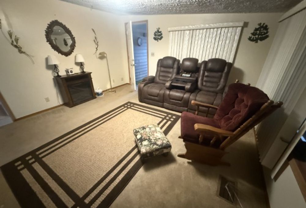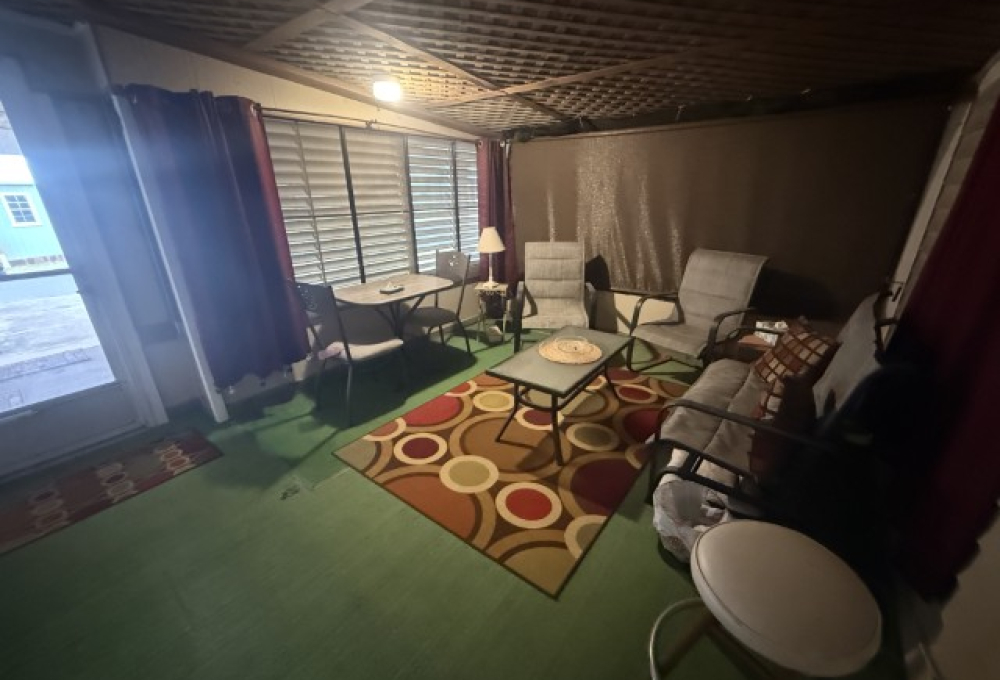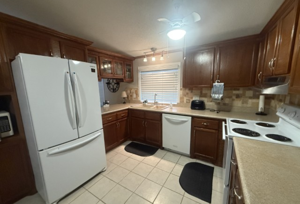 Inside, the home feels open and inviting. The front‑facing kitchen offers ample counter space and cabinet storage, along with a newer 2020 armoire‑style refrigerator/freezer. Just beyond the kitchen is a comfortable living room, perfect for relaxing or entertaining.