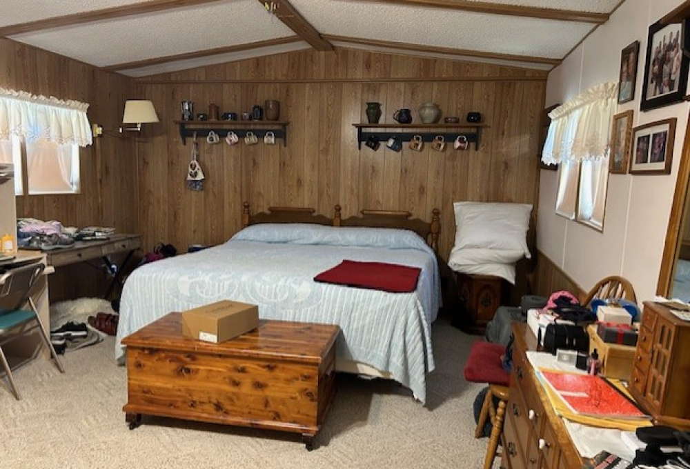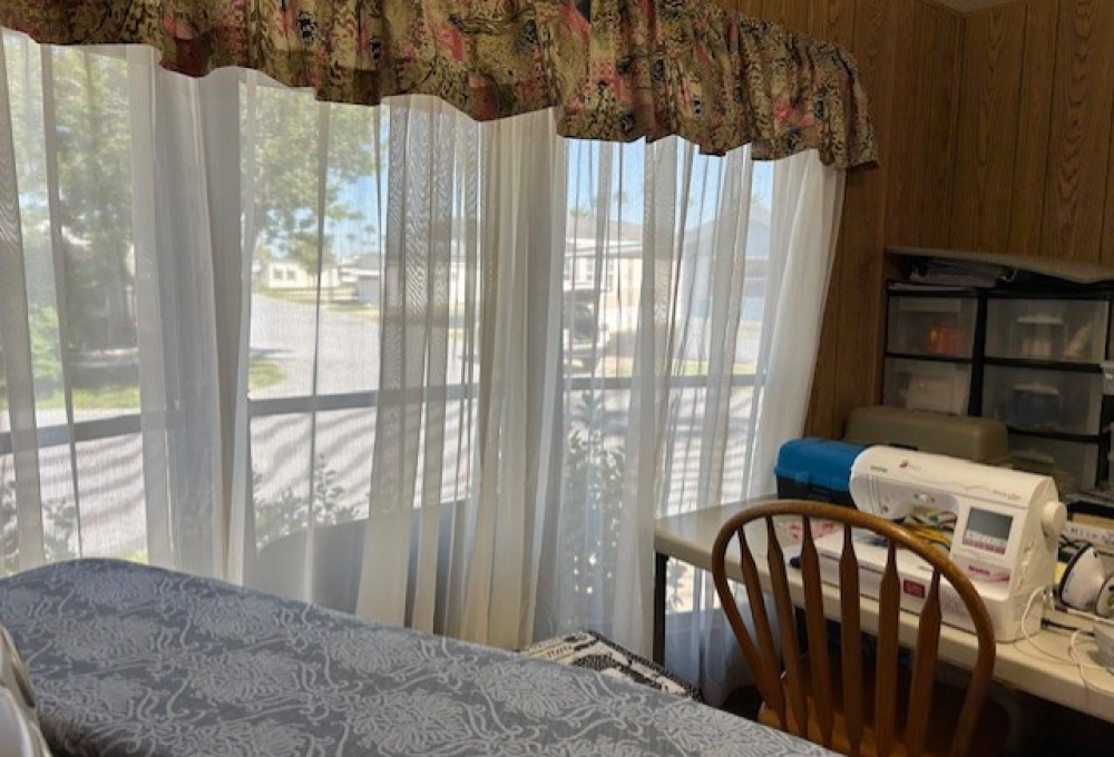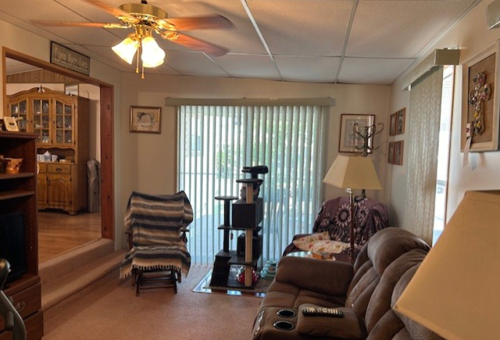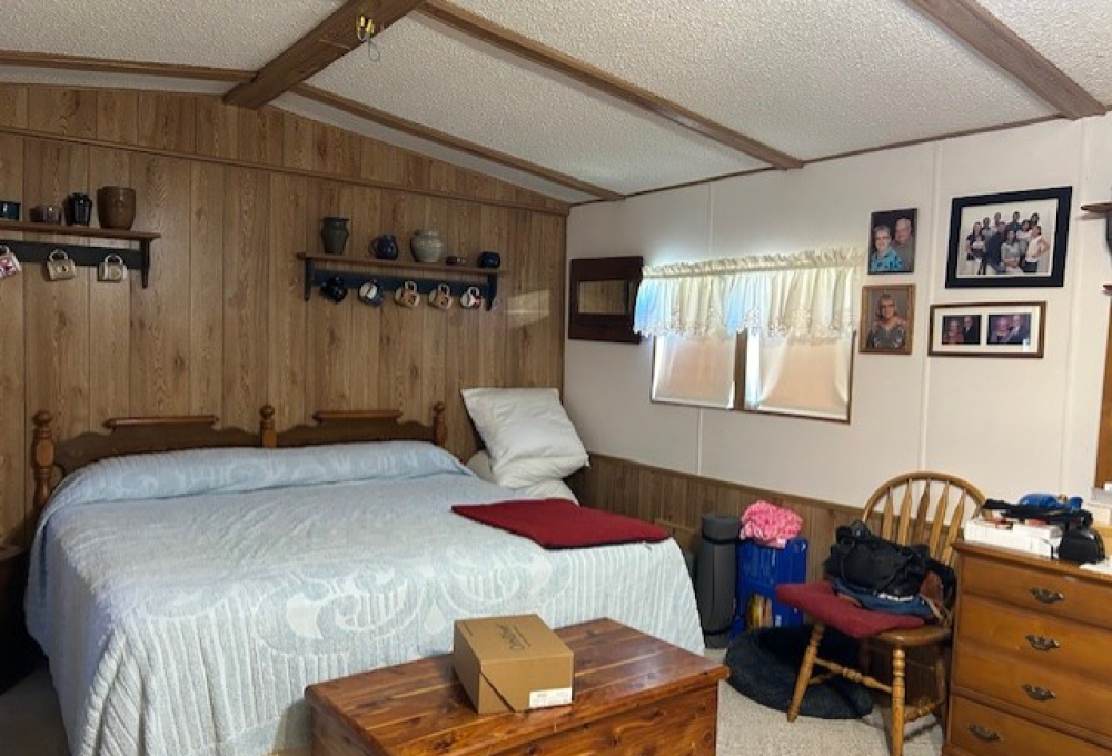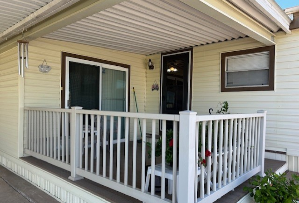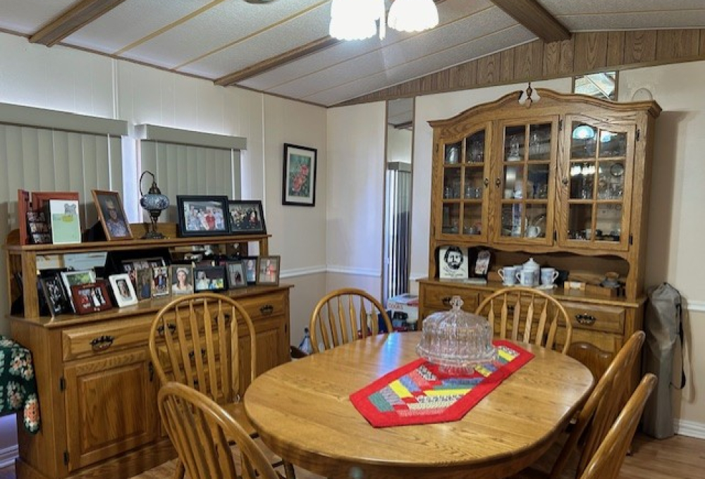 2 bedroom mobile home in 55+ community, Park Place Estates in Harlingen. The double lot allows for a 11'X45' carport for 2 vehicle parking, Texas room addition, and front porch/deck. House has 1,122 square feet of living space. A sliding door opens to large living room adjacent to the dining room which will accommodate a 6 to 8 seat dining table and buffet/hutch. The split bedroom plan has the smaller bedroom/craft room in the front and a 1/2 (2 piece) bath. The kitchen is open to the dining area and is well equipped with electric range/oven, refrigerator, and dishwasher, along with plenty of counter space. There is an abundance of cabinets and a pantry. The hall bath has a tub/shower, newer sink/vanity, and has a separate entrance to the master bedroom. The large primary bedroom is 14'X18' with king bed, dresser, and chest of drawers.