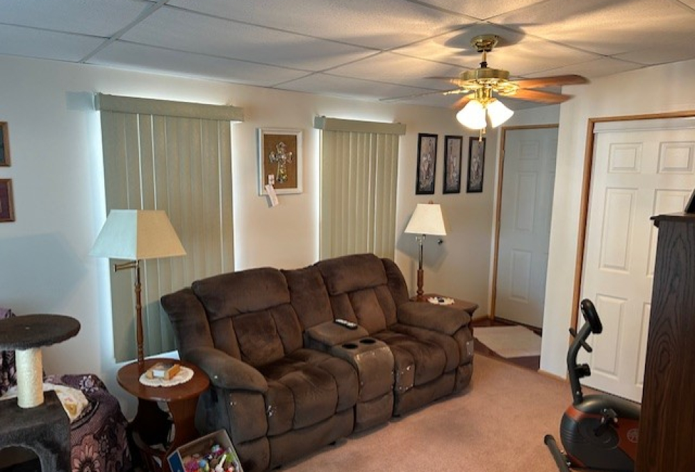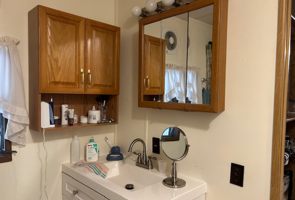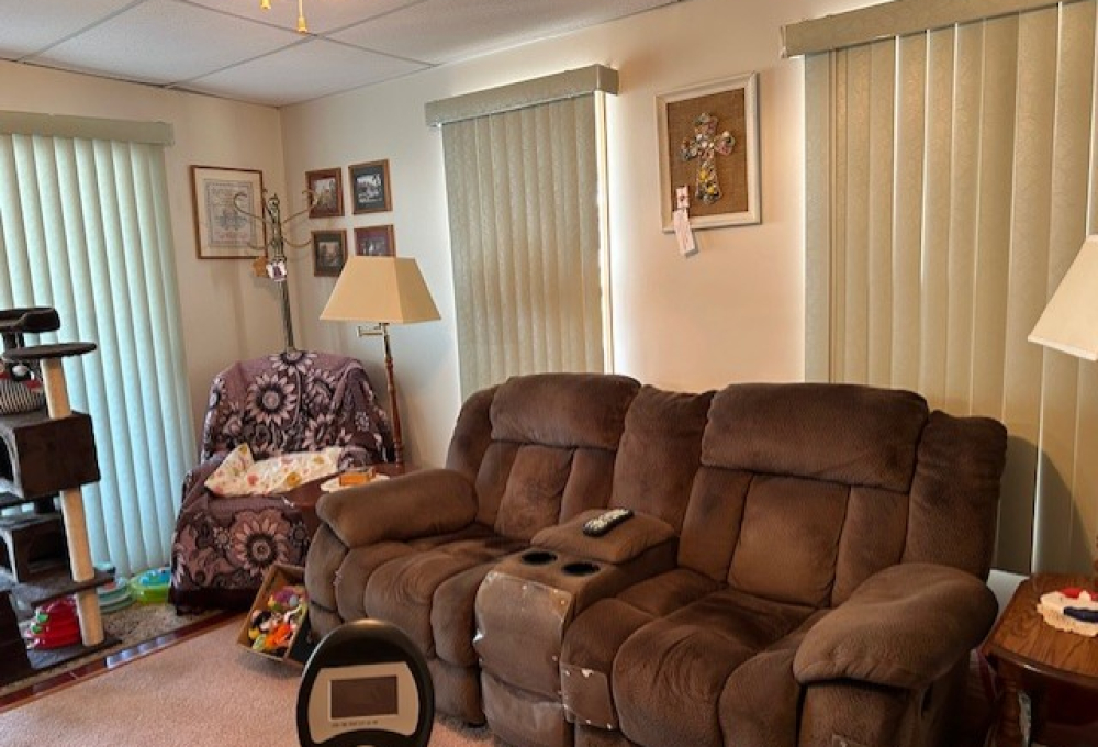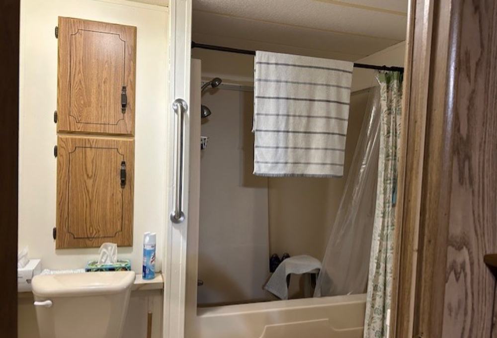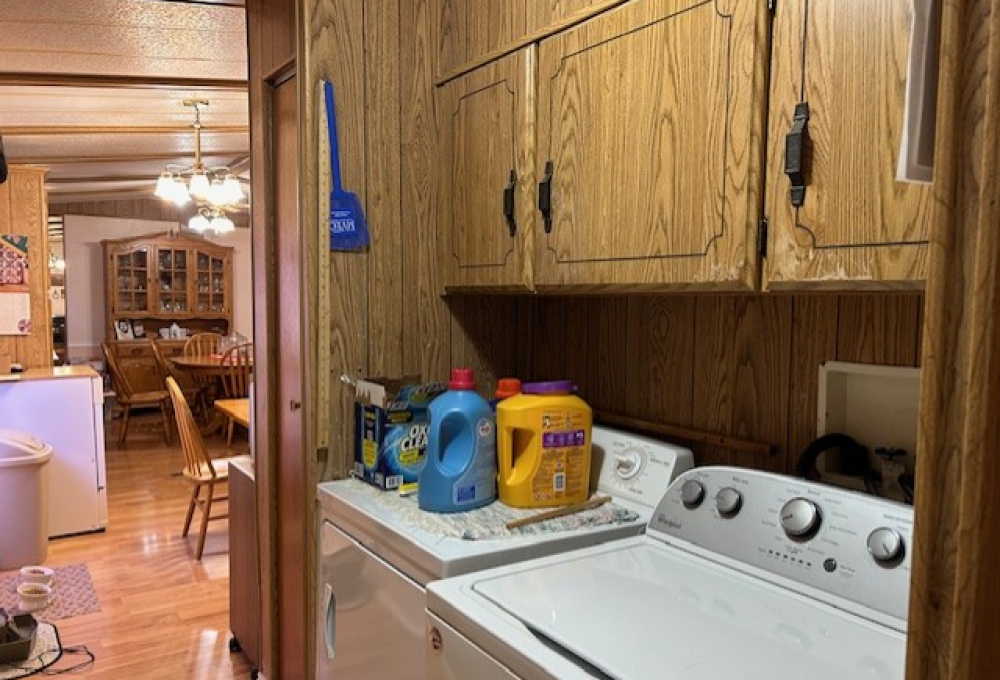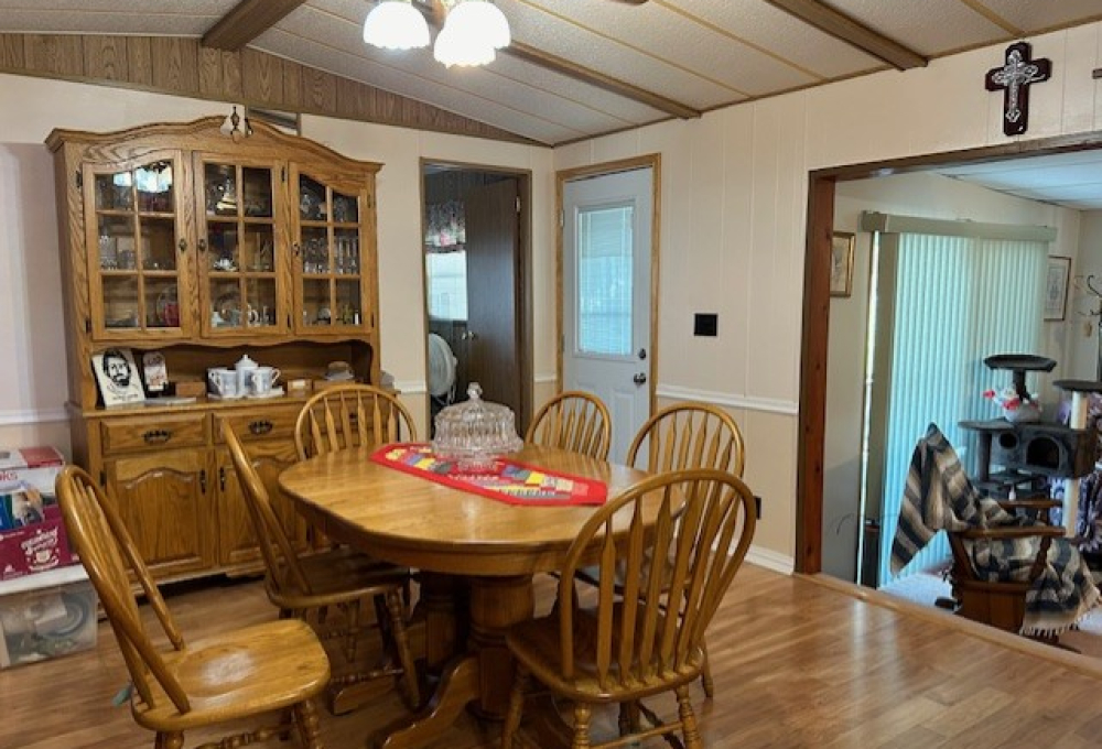 2 bedroom mobile home in 55+ community, Park Place Estates in Harlingen. The double lot allows for a 11'X45' carport for 2 vehicle parking, Texas room addition, and front porch/deck. House has 1,122 square feet of living space. A sliding door opens to large living room adjacent to the dining room which will accommodate a 6 to 8 seat dining table and buffet/hutch. The split bedroom plan has the smaller bedroom/craft room in the front and a 1/2 (2 piece) bath. The kitchen is open to the dining area and is well equipped with electric range/oven, refrigerator, and dishwasher, along with plenty of counter space. There is an abundance of cabinets and a pantry. The hall bath has a tub/shower, newer sink/vanity, and has a separate entrance to the master bedroom. The large primary bedroom is 14'X18' with king bed, dresser, and chest of drawers.