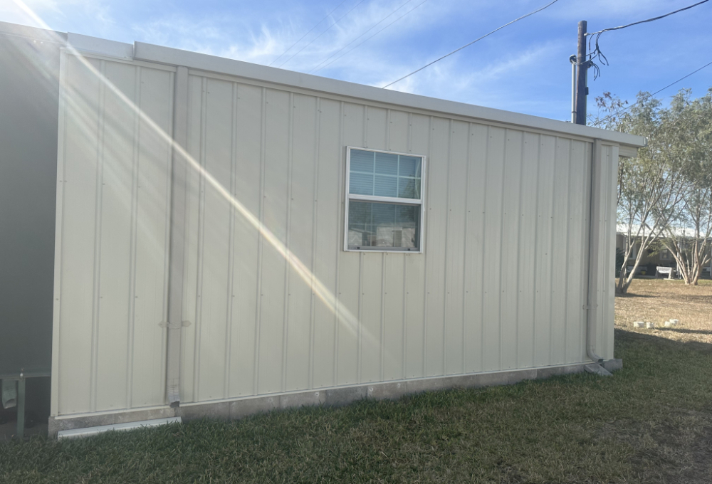Added features include a large propane tank rented through Pico (with refills available), a front porch for parking your golf cart, and a low-maintenance front yard covered in pebbles. There are two storage units in the back beyond the front porch, a grandfather fence for pets, and fruit trees.