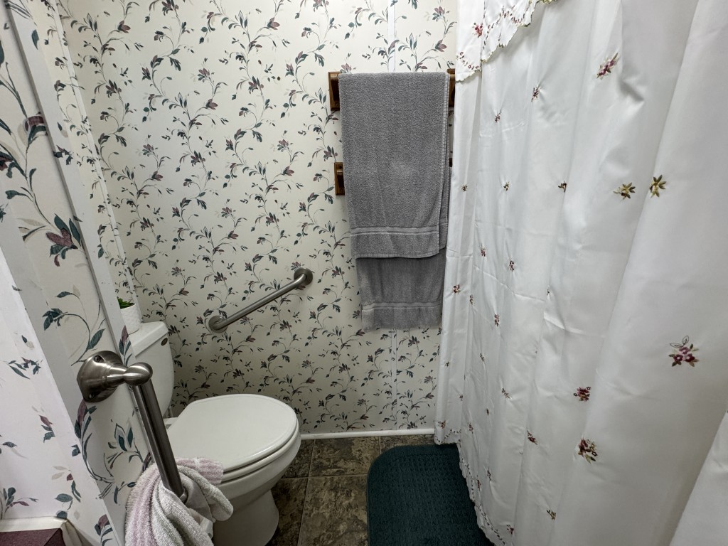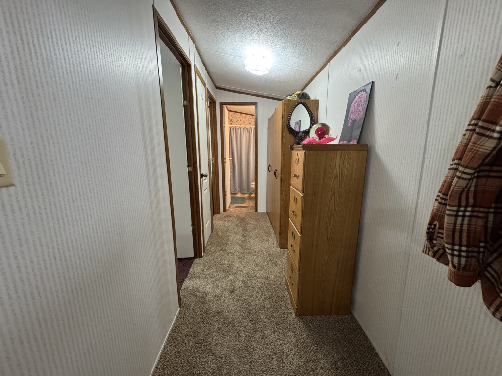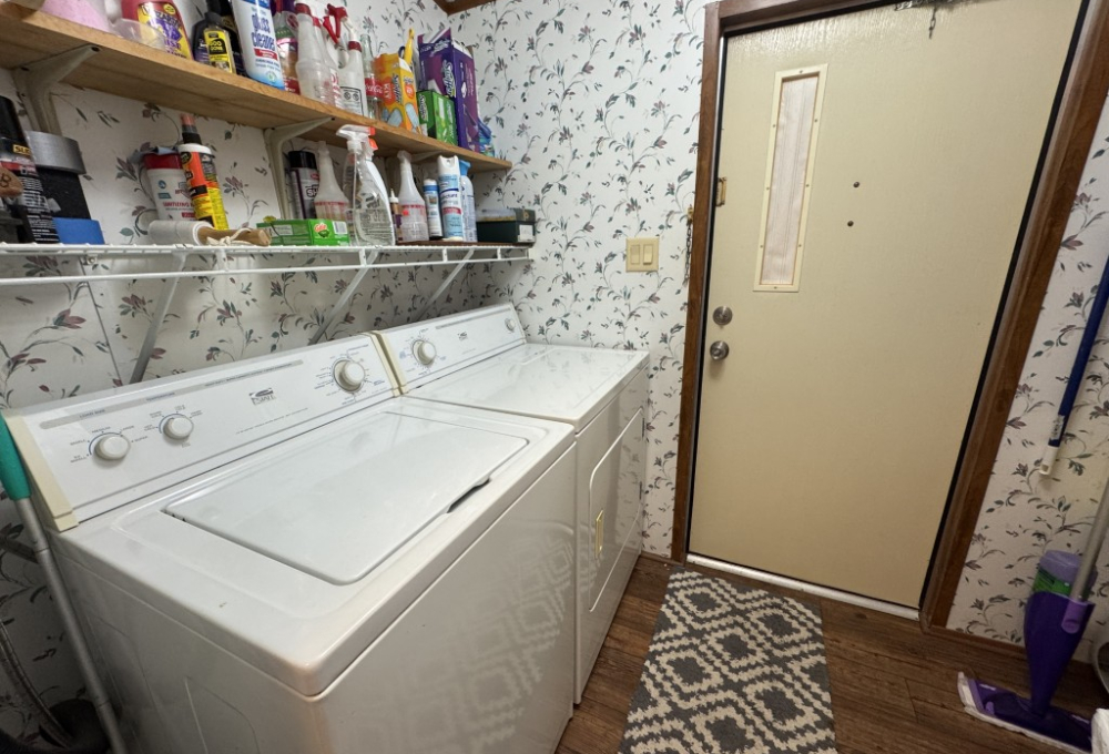 Two guest bedrooms are positioned toward the front of the home, accessible via a wide hallway adjacent to the guest bathroom. The laundry area, complete with full-size washer and dryer, is conveniently located near the back door. Carpeting extends through the living areas, bedrooms, and hallway for enhanced comfort.