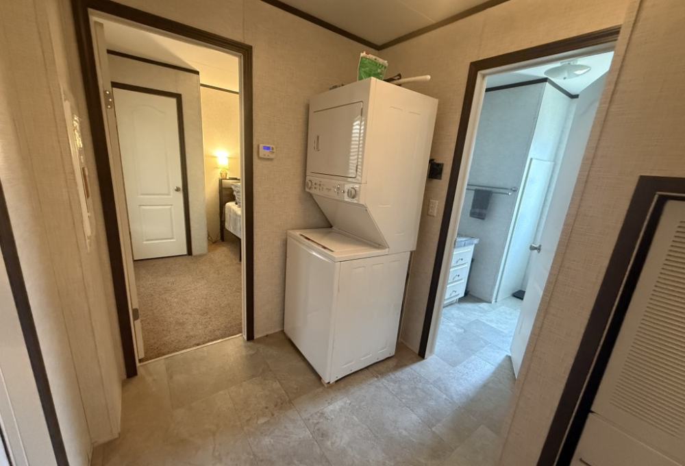 Down the hallway, you’ll find a very large laundry room with a stackable washer and dryer. This area leads to a generously sized bathroom that includes a walk‑in shower, linen closet, toilet, and a single‑sink vanity.