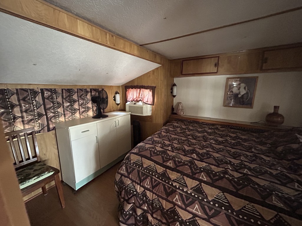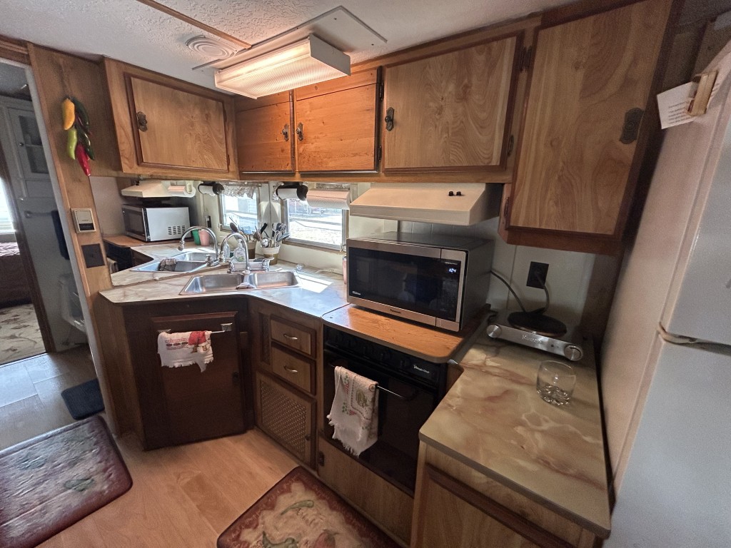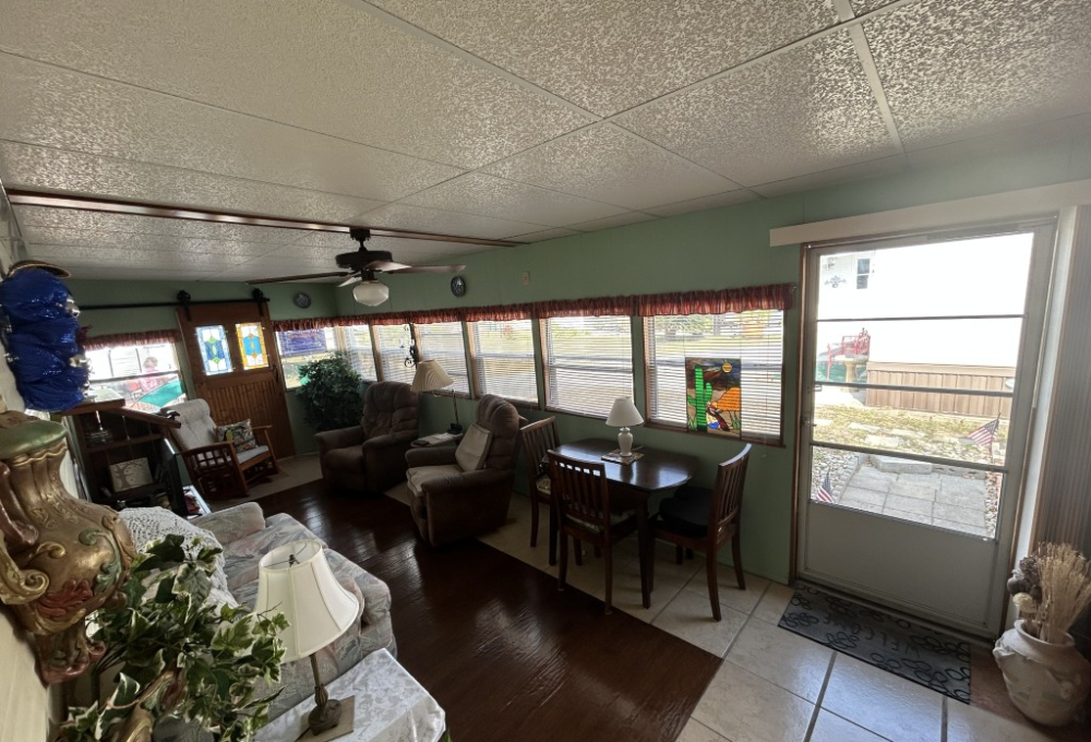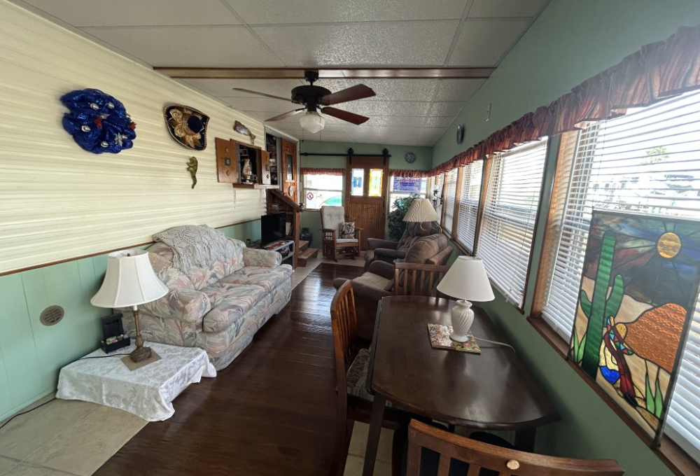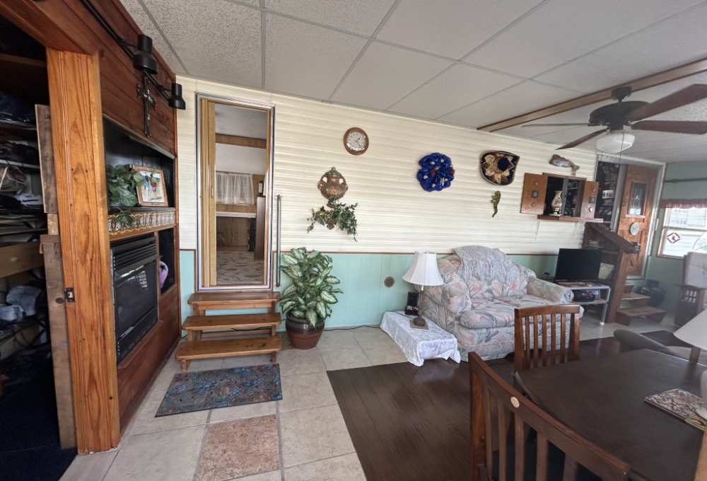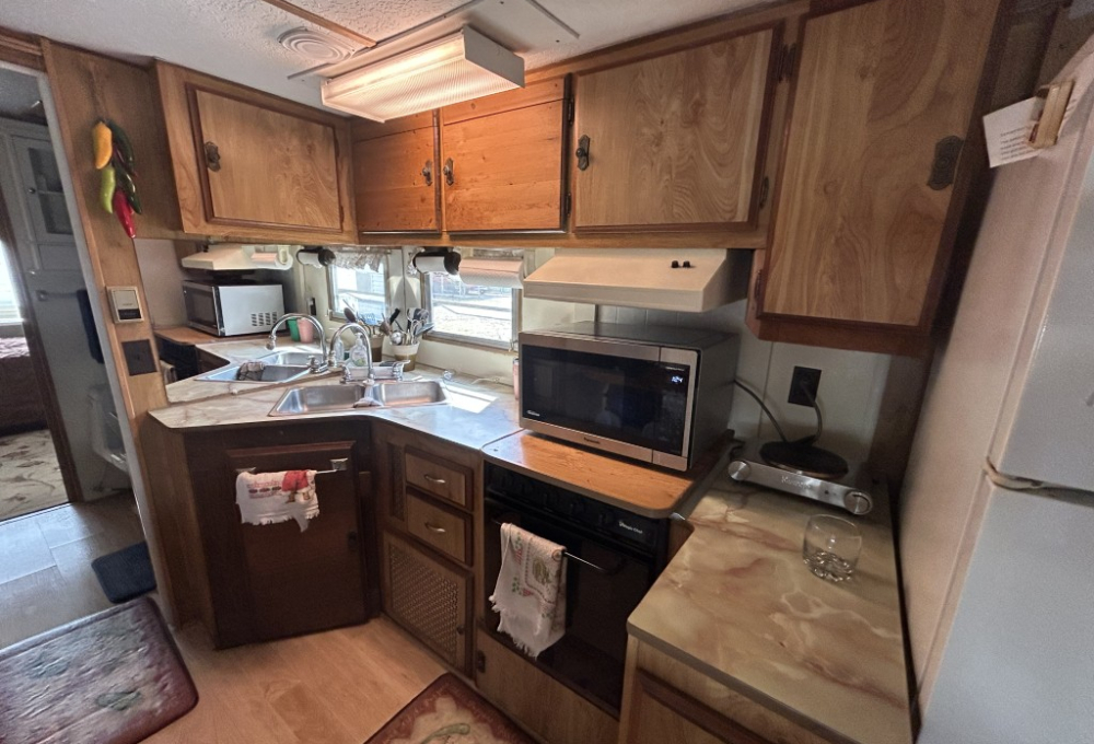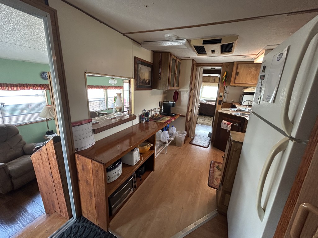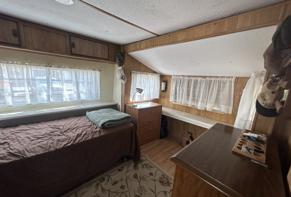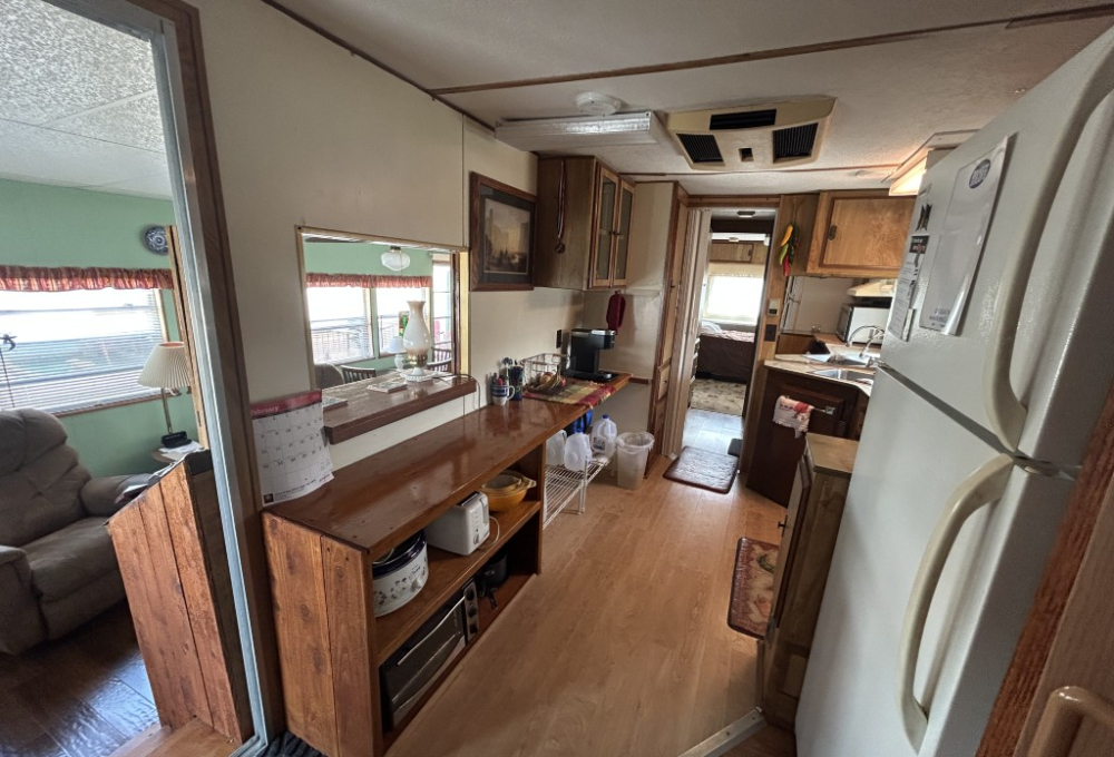 Looking for the perfect winter getaway? Check out this fully furnished 1981 FRAN travel trailer, measuring 8x32 feet with a spacious 256 sq ft interior, plus a roomy 10x23 Texas room. The home features all vinyl flooring and a metal roof covering both the trailer and the Texas room for peace of mind. Outside, you'll find a handy 5x8 storage shed and a cozy 5x5 deck—great for relaxing or entertaining. Inside, enjoy a gas stove and heat, an electric water heater, and a workshop with a large closet at the back of the Texas room's living area. The décor is Southwest-inspired with beautiful custom woodwork, giving the space unique character. Located in a lively 55+ gated community, residents enjoy high-speed internet, cable TV, and tons of amenities including shows, dances, pickleball, indoor shuffleboard, a billiards room, fitness center, games, and more. Plus, you're just minutes from shopping and dining, and only about 45 minutes from South Padre Island. This setup is ideal for anyone looking for a comfortable, active winter retreat!