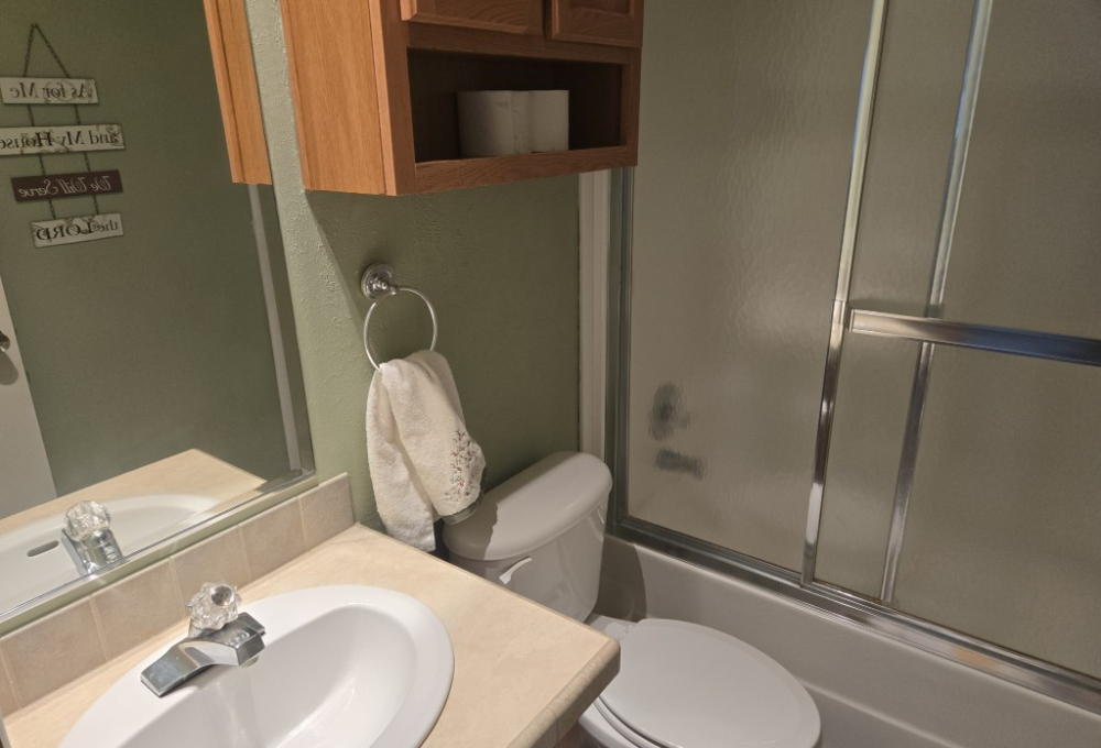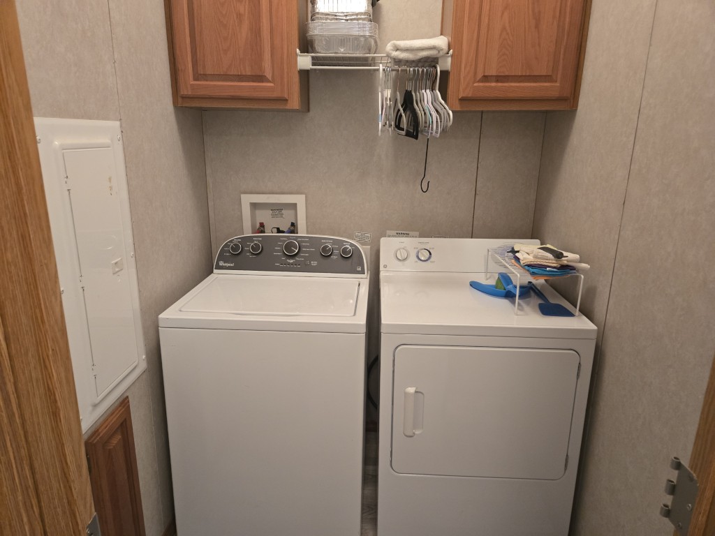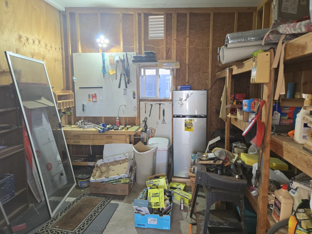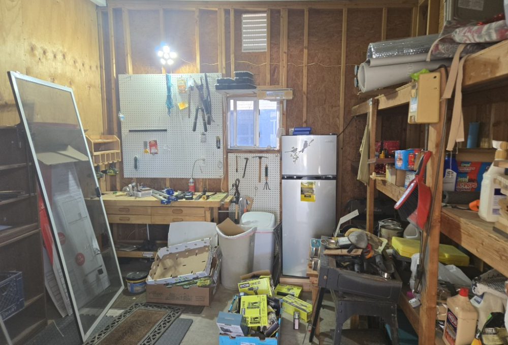 - Includes a storage shed, providing extra space for tools, hobbies, or seasonal items.